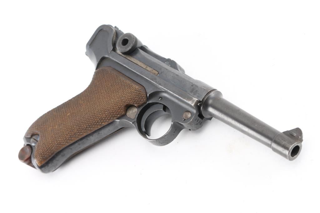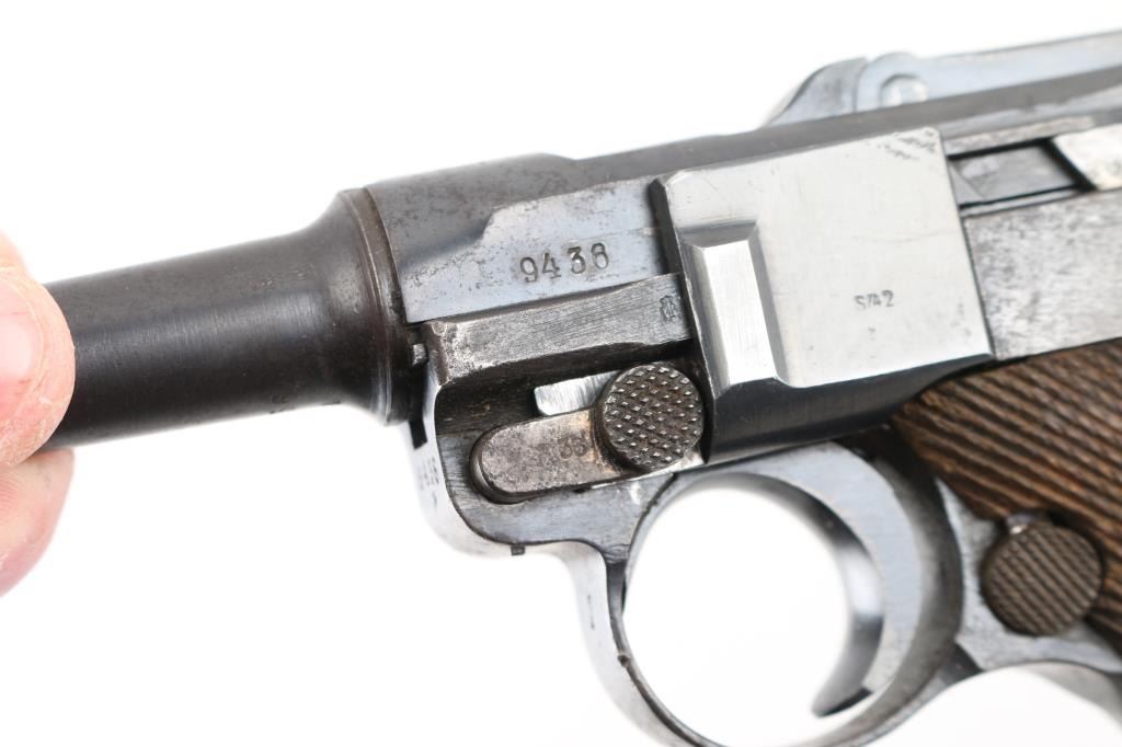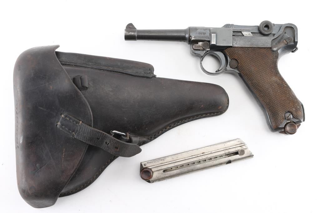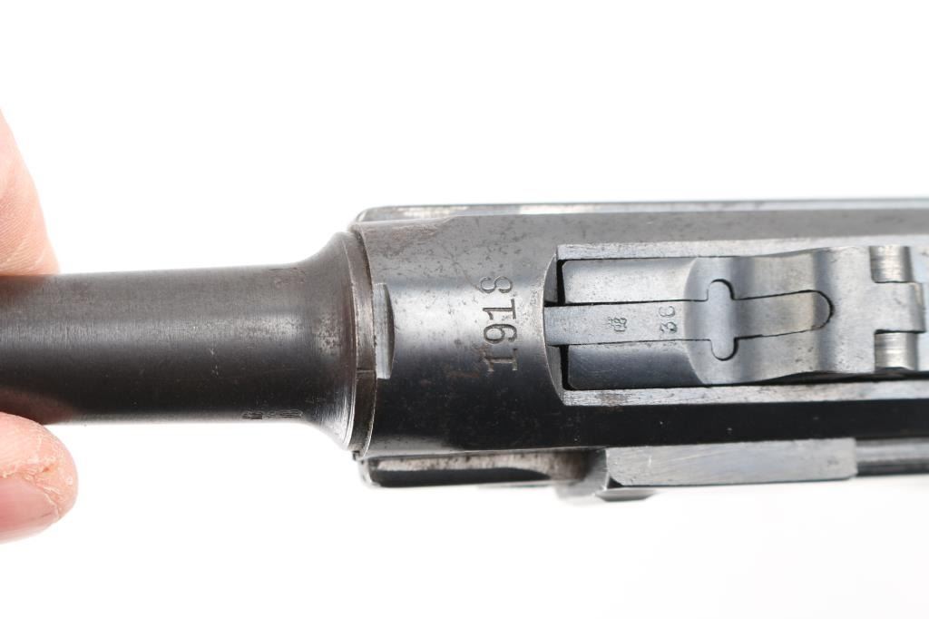 German military WWI era semiautomatic pistol dated 1918. Features re-blued finish, checkered wood grips, 4" barrel, fixed sights, manual safety, push button magazine release, lanyard bar, stock bolt on heel. Bore is mostly very good condition with visible tiny pits throughout. Refinished in a dark deep bluing, color looks about right, some brownish tones in the bluing, sideplate color is a bit different, 80% remaining, visible tiny pits and other surface blemishes to the steel under the finish, some light patina, edge losses and rubbing wear. Grips are good condition with smoothing from use, tight to the frame. Trigger is blued, no numbers observed. Takedown latch retains traces of straw color, showing more patina. Observed numbers match most places where observed, sideplate marked "S/42" without serial numbering. Markings include imperial era eagles and crowns. No importer marks observed. Markings are readable, show light erosion. Includes black leather hard shell full flap holster, fair condition leather, good condition stitching, Waffenamt 136 mark on back, tool in pouch in flap, two magazines. One magazine is now mostly patina brown, traces of nickel, no markings, wood plug. Other mag has much more dull nickel finish, little patina, wood plug with some losses to wood on left side. Condition is NRA Good++ (reblued) *** C&R Firearm ***