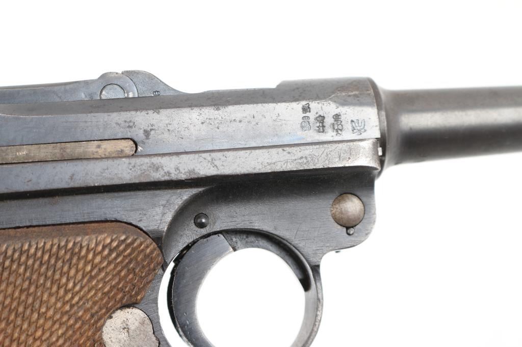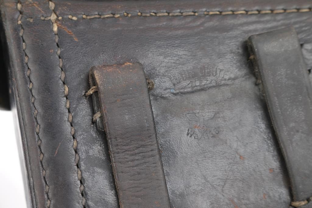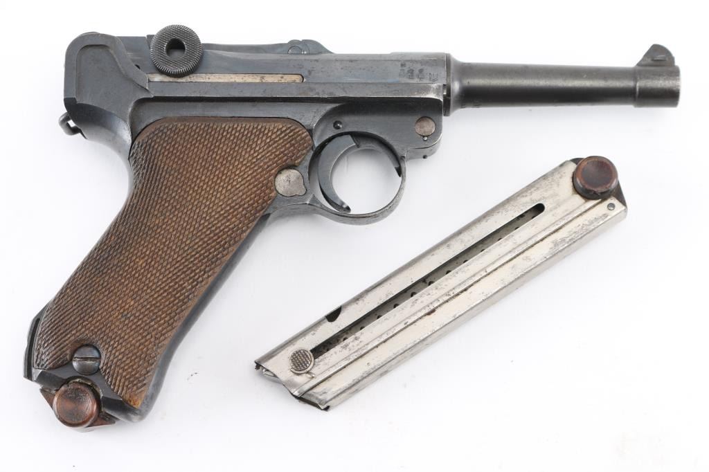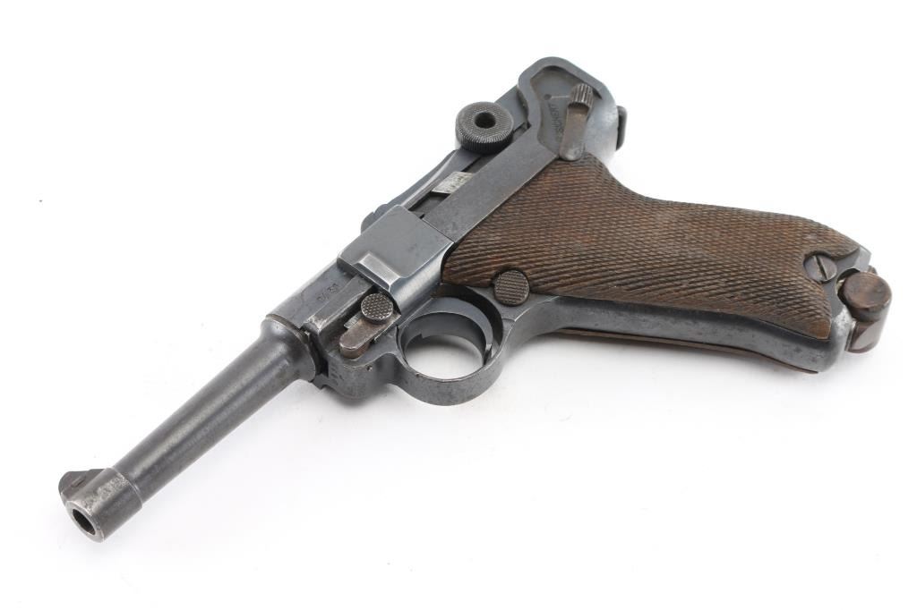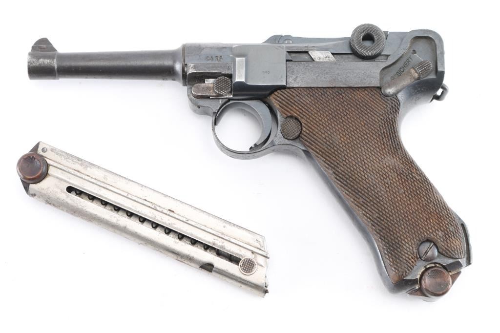 German military WWI era semiautomatic pistol dated 1918. Features re-blued finish, checkered wood grips, 4" barrel, fixed sights, manual safety, push button magazine release, lanyard bar, stock bolt on heel. Bore is mostly very good condition with visible tiny pits throughout. Refinished in a dark deep bluing, color looks about right, some brownish tones in the bluing, sideplate color is a bit different, 80% remaining, visible tiny pits and other surface blemishes to the steel under the finish, some light patina, edge losses and rubbing wear. Grips are good condition with smoothing from use, tight to the frame. Trigger is blued, no numbers observed. Takedown latch retains traces of straw color, showing more patina. Observed numbers match most places where observed, sideplate marked "S/42" without serial numbering. Markings include imperial era eagles and crowns. No importer marks observed. Markings are readable, show light erosion. Includes black leather hard shell full flap holster, fair condition leather, good condition stitching, Waffenamt 136 mark on back, tool in pouch in flap, two magazines. One magazine is now mostly patina brown, traces of nickel, no markings, wood plug. Other mag has much more dull nickel finish, little patina, wood plug with some losses to wood on left side. Condition is NRA Good++ (reblued) *** C&R Firearm ***