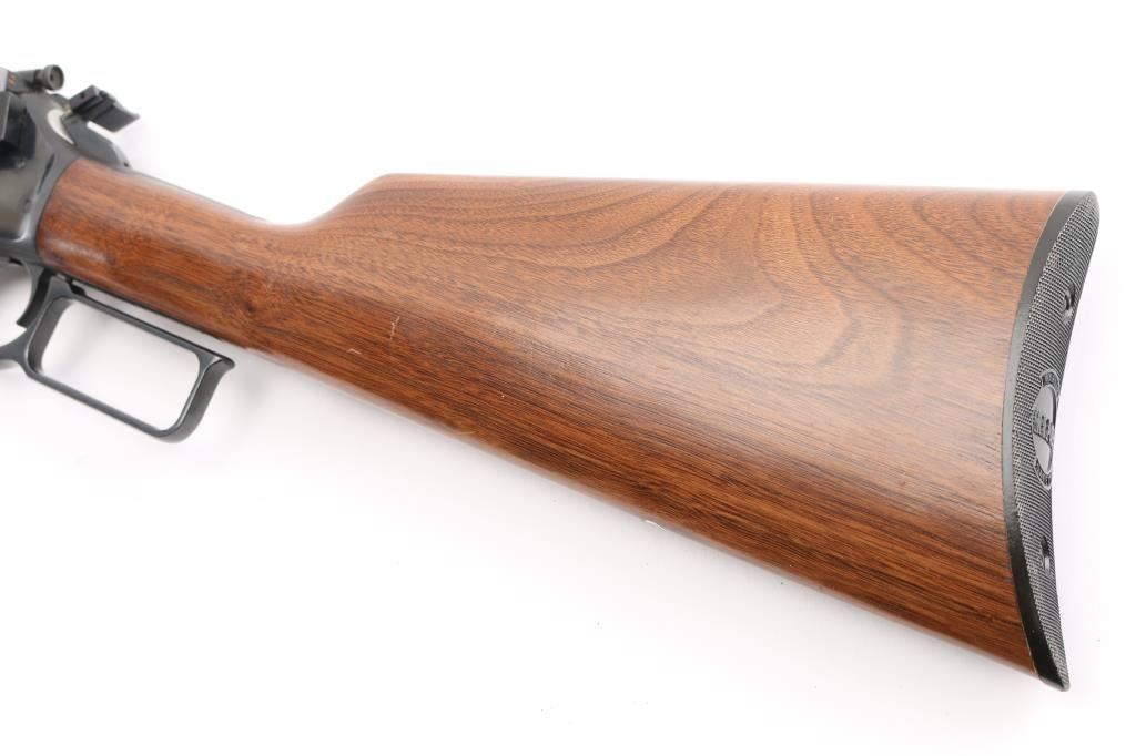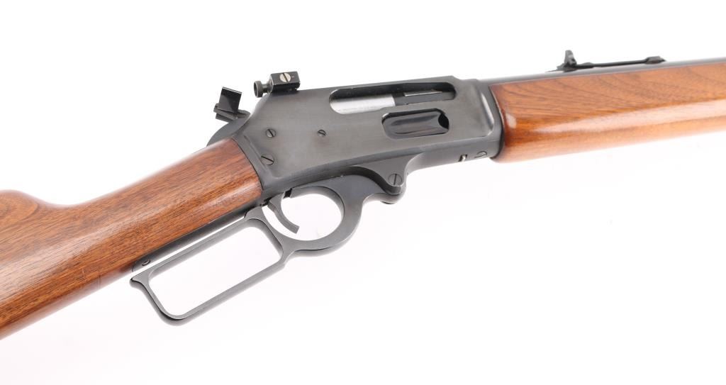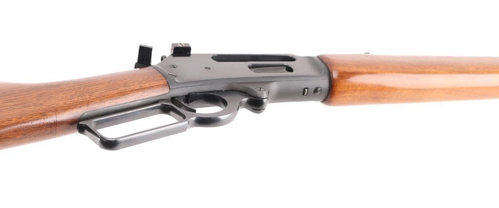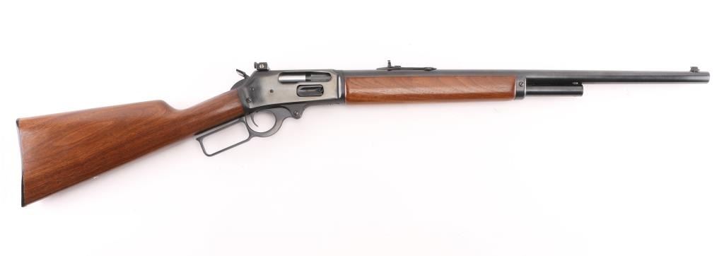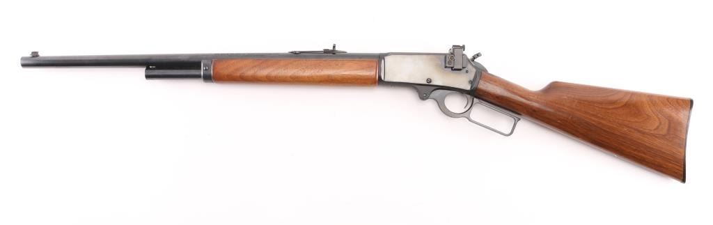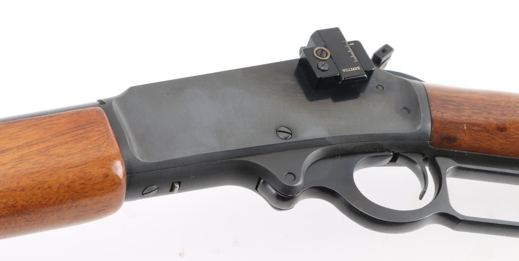 Lever-Action big bore rifle/ 22" round barrel with post/bead front rear sporting sights. Williams peep sight installed on receiver. "JM" stamped on lower barrel. Straight walnut stock/forearm. Marlin black plastic buttplate. Thumb extension on hammer. Receiver drilled/tapped for scope mount. 'Bullseye' inletted on bottom of buttstock. Action is crisp/tight. Bore is excellent/bright. Blued metal finish is about 98%. Varnished Wood is very good with a few minor scratches/dings . NRA Condition- Near Excellent. Modern Firearm.
