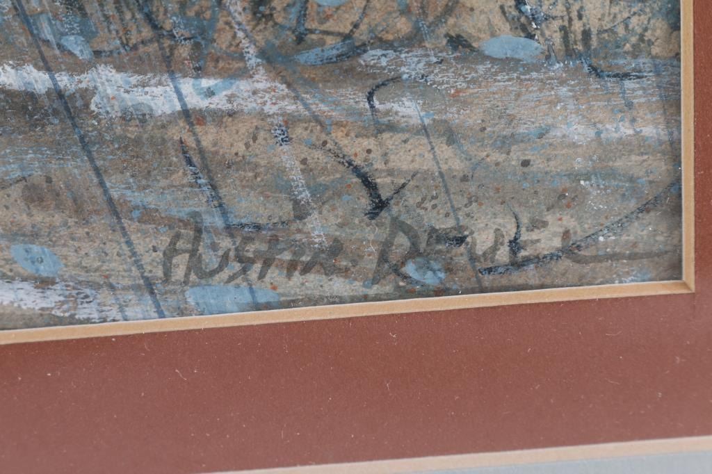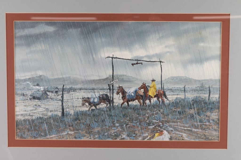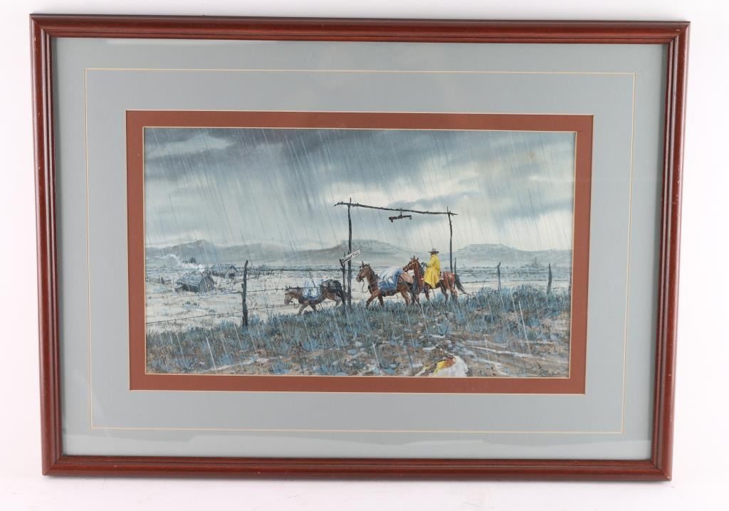 By artist "Austin Dewel" signed lower right, depicting rancher in rain, returning to the farm. Framed and triple matted. Image size measures 20x11.