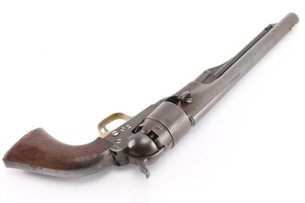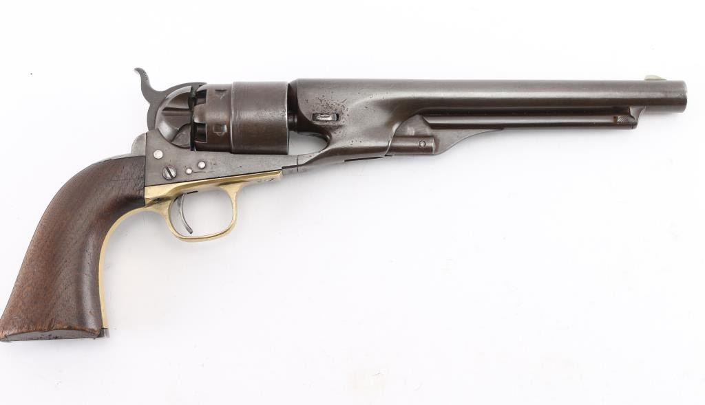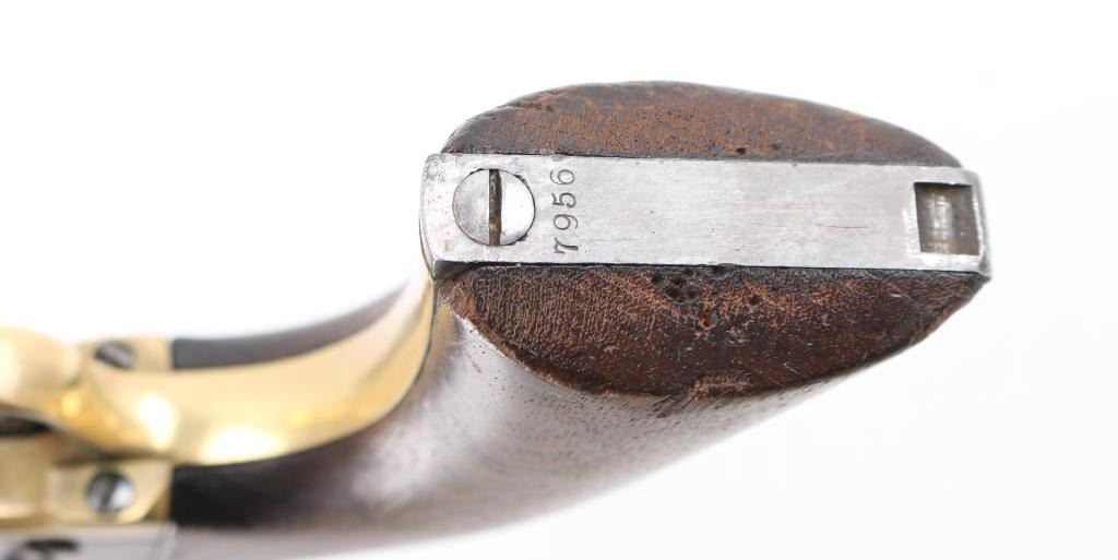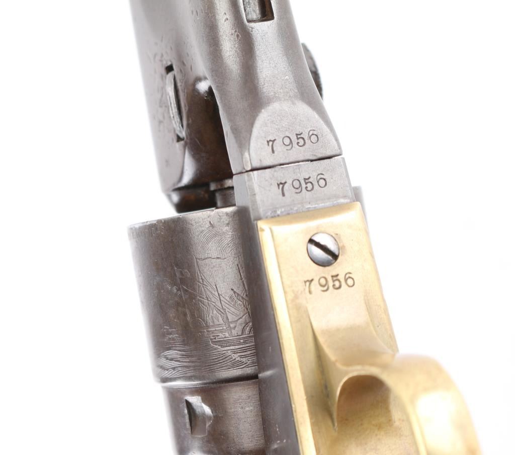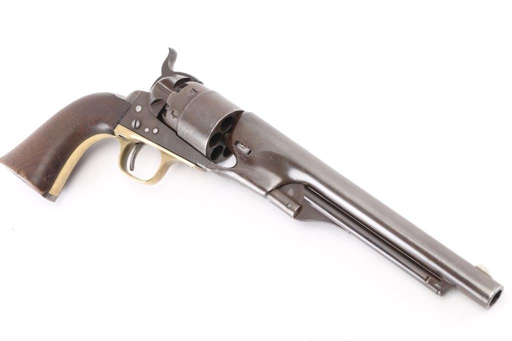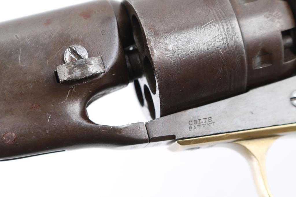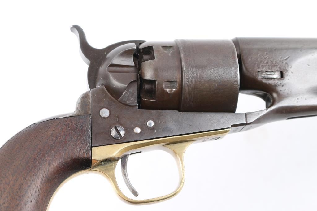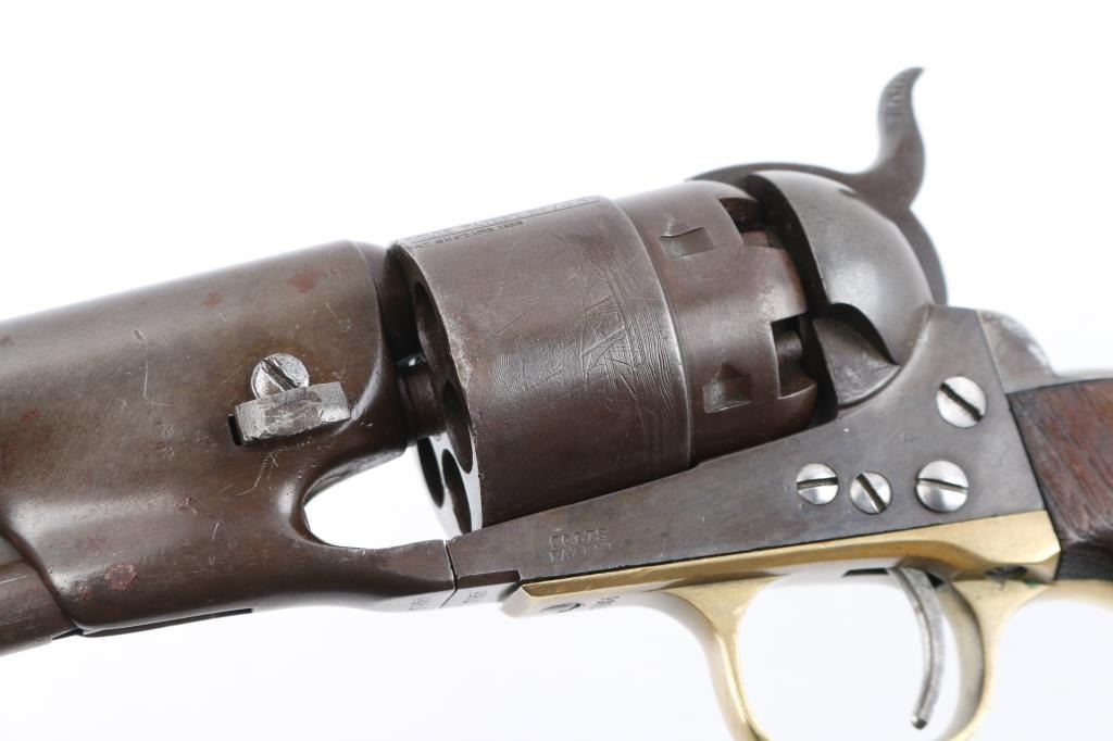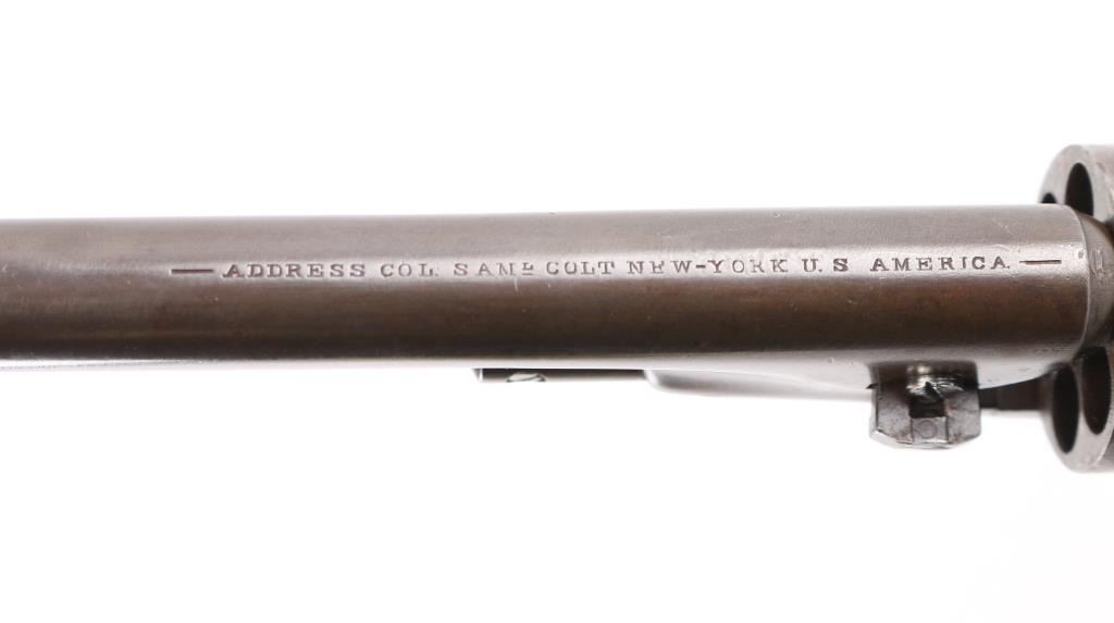 'Four Screw, Early production' Martially marked & inspected single action percussion revolver issued to the Union Army during the American Civil War, manufactured circa 1861. Features an 8" round barrel with "-ADDRESS COL. SAML COLT NEW-YORK U.S AMERICA-" marking, German silver blade front sight, 'v' notch rear sight cut into the hammer, smooth thin trigger, knurled hammer spur, non-fluted six shot cylinder with roll stamped Naval Engagement scene, loading lever, round brass trigger guard, steel backstrap, 'four screw' frame, shoulder stock cuts in the recoil shield & butt and one-piece oil finished smooth walnut grip with boxed ADK cartouche. All serial numbers match including the barrel, barrel wedge, cylinder, cylinder pin, frame, trigger guard and backstrap. Inspector marks include: Barrel - "S", "K" & "S". Cylinder - "K", "K" & "2". Trigger guard - "K". Backstrap - "K". and Cylinder Pin - "S". Revolver displays an lovely smooth aged brown patina thought with a small amount of pin prick pitting and approximately 70% cylinder scene intact. Action performs well, the bore is semi-bright with strong rifling & scattered pitting, marking are very good and the walnut grip is good to very good with worn edges at the butt. Condition is NRA Very Good. Antique Firearm.