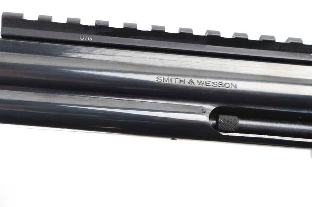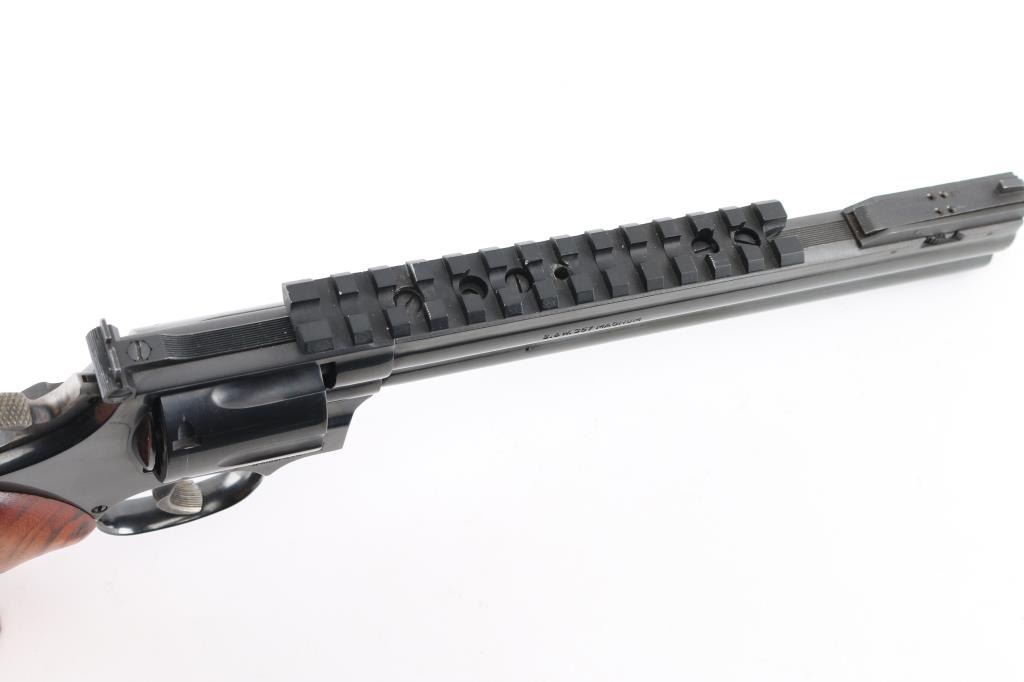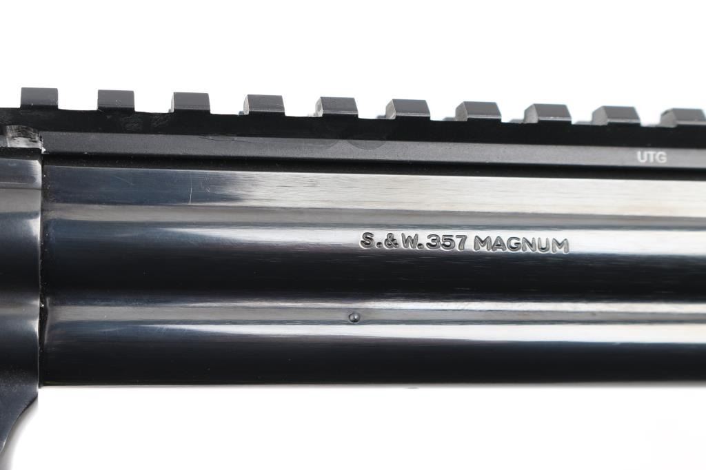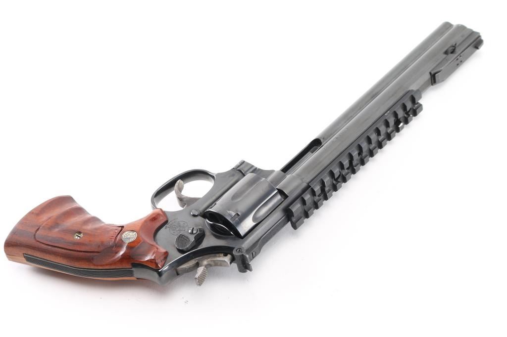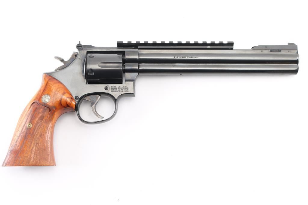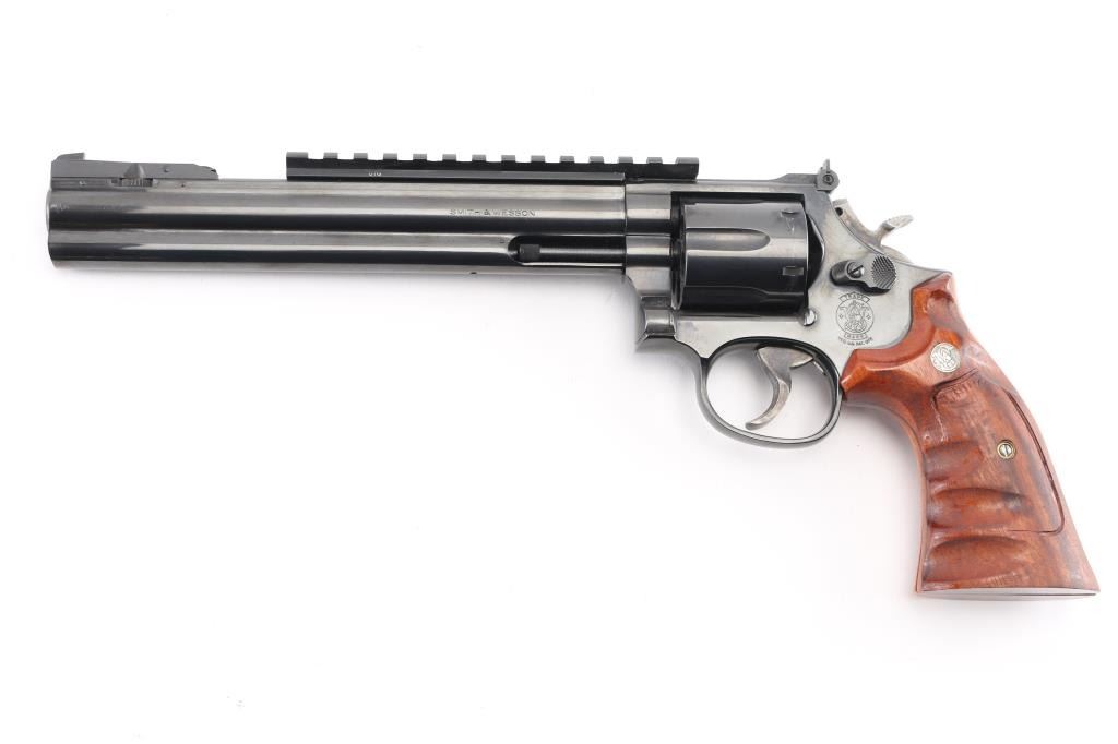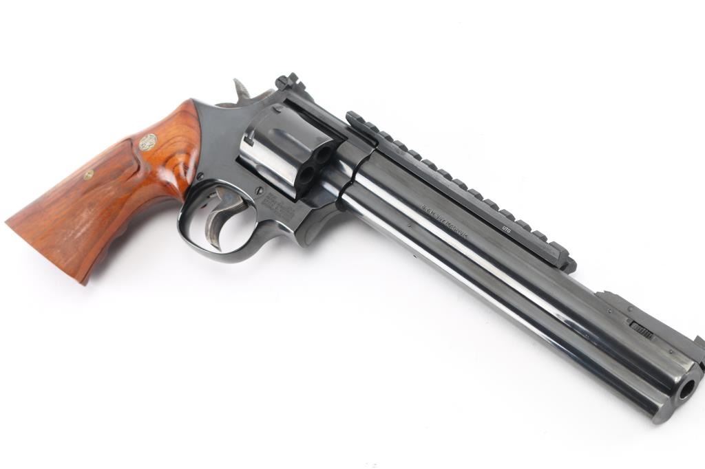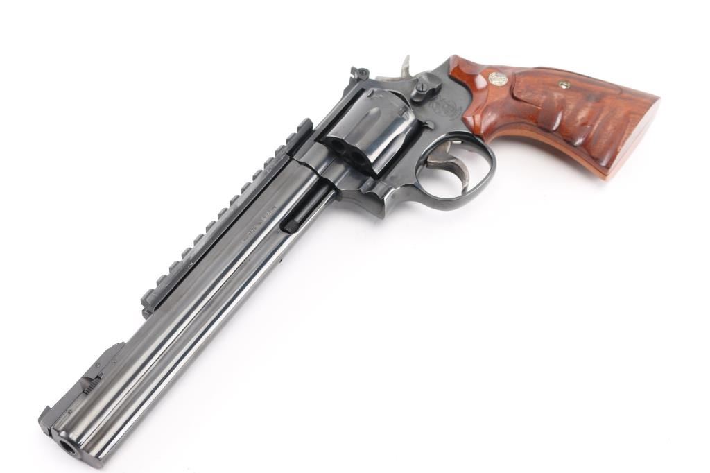 SN: AUD6039. The "357 Distinguished Combat Magnum" Built on a square butt L target frame.-3 screws in carbon steel. Double action 6 shot target revolver. Blued finish, smooth finger grooved wood target stocks with S&W medallions, case colored semi-target hammer with knurled spur and serrated wide trigger. It sports a 8 3/8" full lug barrel,adjustable silhouette 4-position front sight, (1992) and square notch adjustable rear sights. Grooved backstrap. Scope rail installed in barrel rib. Metal finish looks great with minimal signs of use or handling and just a faint drag line on the cylinder. Wood grips are very good, bore is excellent/bright. Produced 1980-99. Condition is NRA Excellent. Modern Firearm.