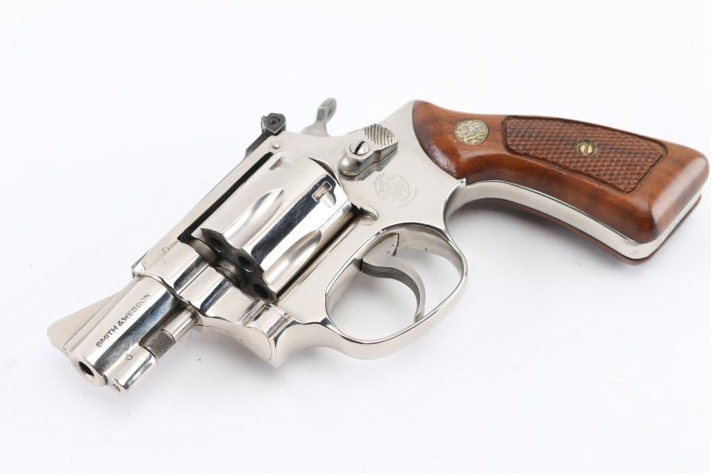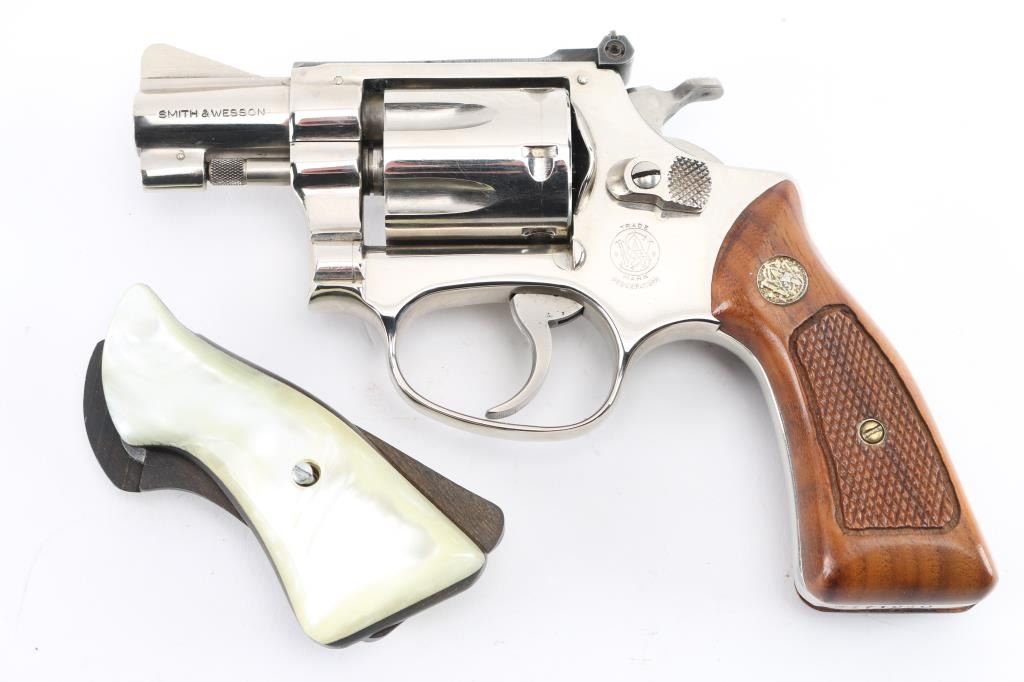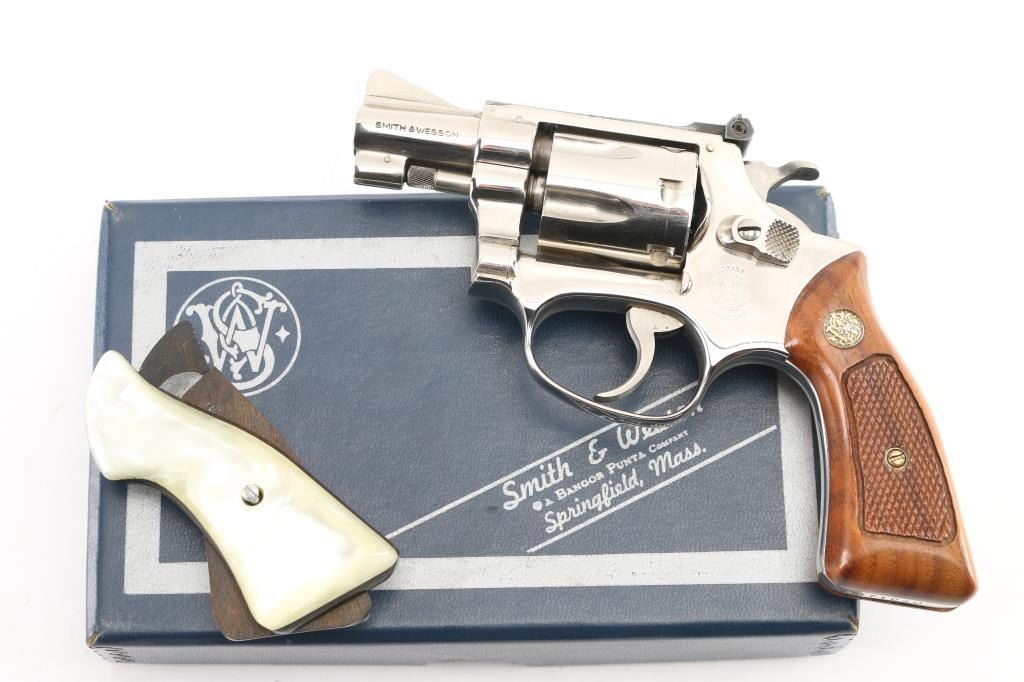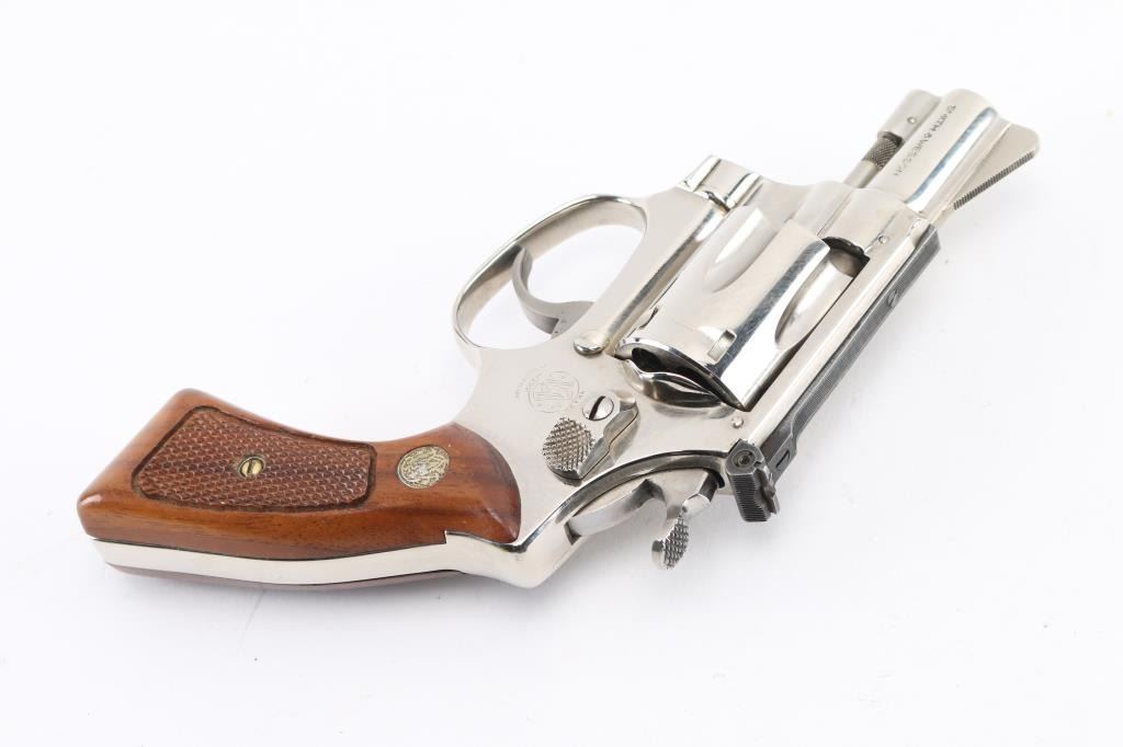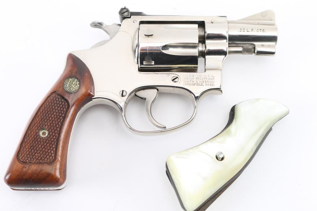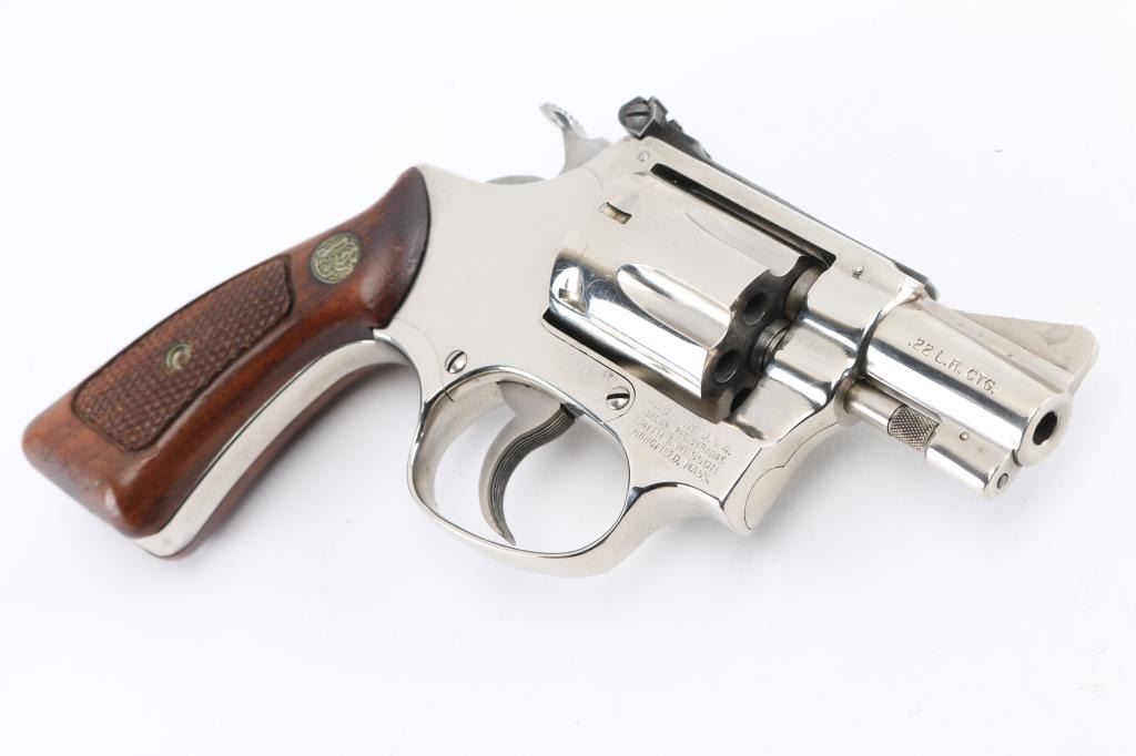 "Pinned & Recessed' double action rimfire revolver circa 1981. Features bright nickel finish, checkered wood "magna" grips with S&W medallions, 2" barrel, serrated ramp front and adjustable rear sights, square butt, "J" frame, 6 shot fluted cylinder. Overall condition is excellent with smooth operation and tight lock-up, minor scratches to the nickel finish, very good bore. Grips are very good condition. In original factory box with papers, spare set of aftermarket faux pearl polymer grips.. Condition is NRA Excellent *** Modern Firearm ***