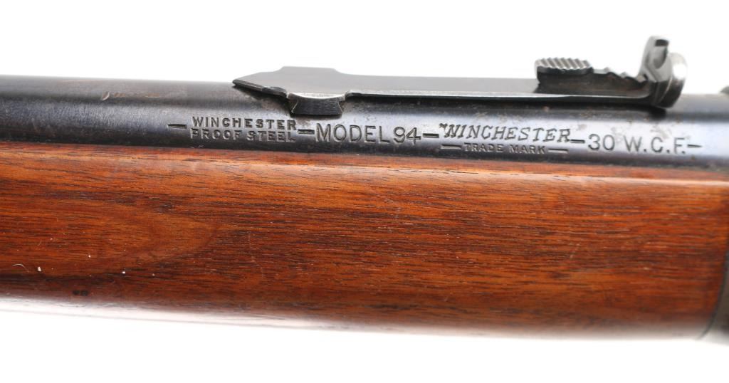 SN: 1118702. 'Pre-64 Eastern Carbine' Vintage lever action repeating rifle chambered in .30 WCF, manufactured in New Haven, CT circa 1939. Features a blued finish, 20" tapered barrel, full-length tube magazine with fitting for sling swivel studs, ramped blade/brass bead front sight, sporting rear sight, smooth trigger, serrated hammer spur, steel receiver, two barrel bands, smooth walnut forend and straight grip shoulder stock with carbine metal buttplate, two small holes in buttstock for sling swivels. Bore is very good condition. Retains 70% finish with edge losses, handling marks, scratches, a lot of handling loss on the receiver. Wood is very good condition with dents, some losses to varnish finish. Condition is NRA Good. C&R Firearm