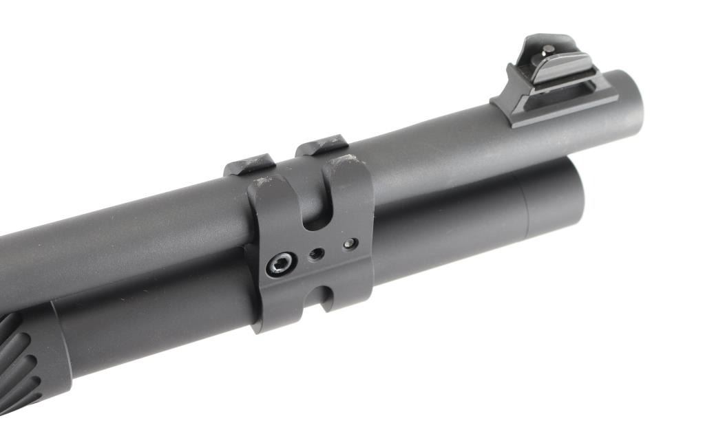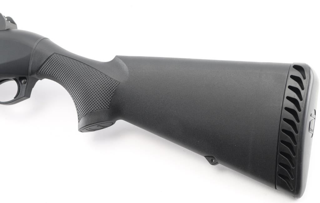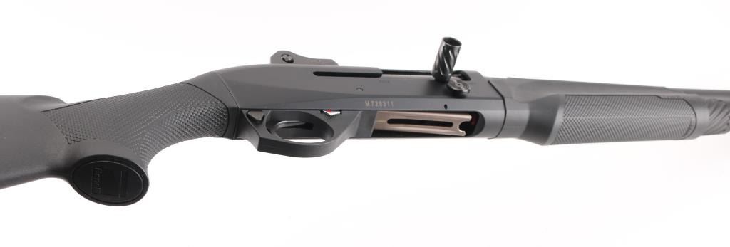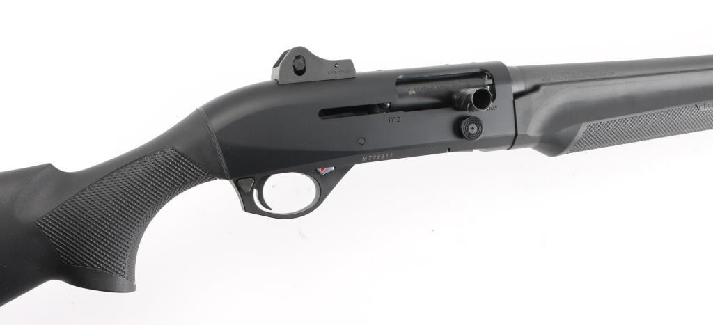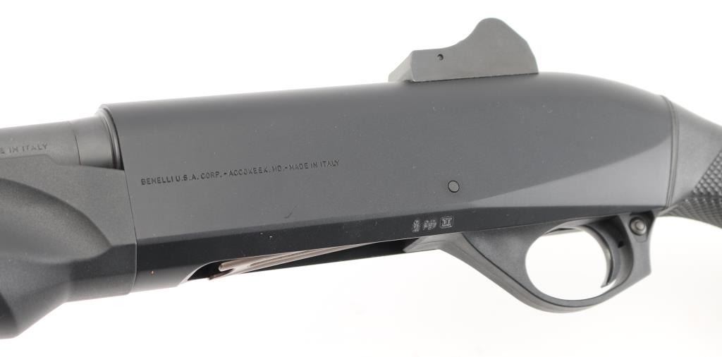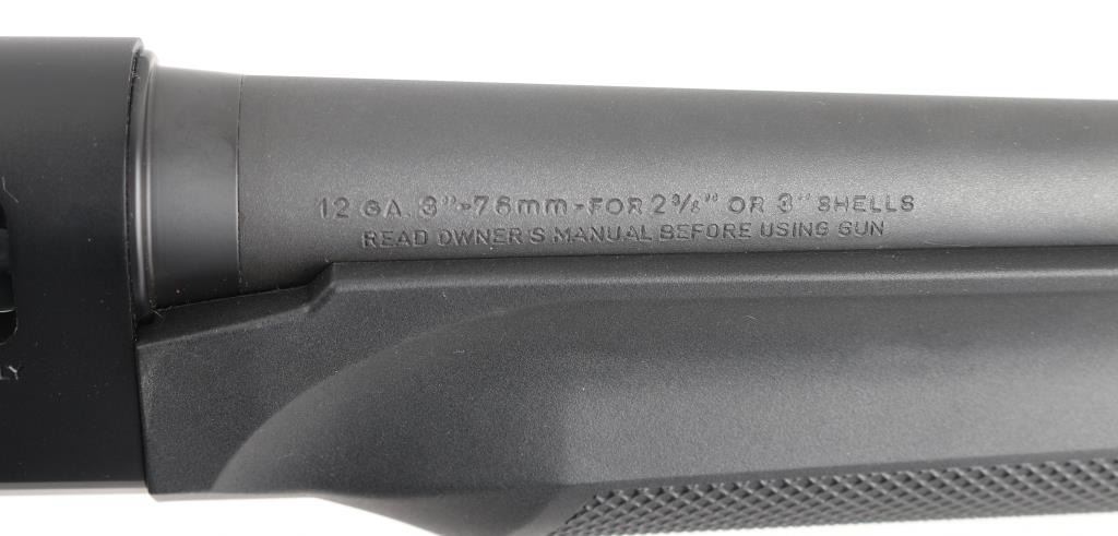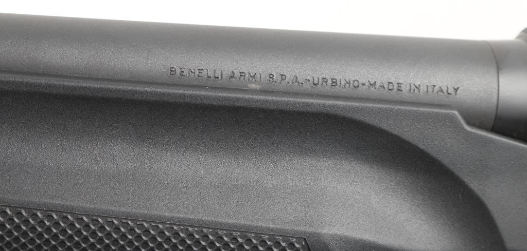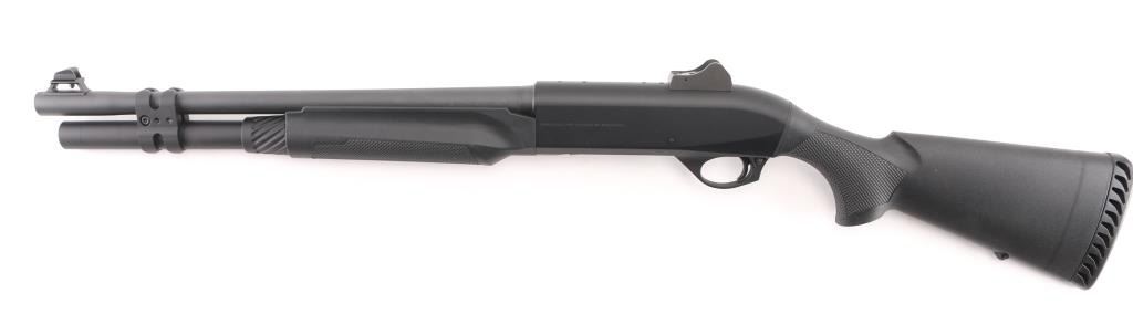 Desirable Italian made inertia driven semi-automatic tactical shotgun chambered for 12 gauge shells, date coded 2009. Features a matte black finish, 18.5" barrel with 3" chamber, accepts choke tubes (Imp Cyl installed), shrouded post front sight with white dot on raised base, shrouded adjustable sliding aperture rear sight, full length round tube magazine, smooth trigger, push button safety, large diameter release button, fluted oversized charging handle, pebble grained black synthetic forend and shoulder stock, factory recoil pad. LOP is 14". Bore is mirror bright. Retains 95% finish with minor scuffs & scrapes. Furniture shows minor handling marks. Includes manual, Mod & Full choke tubes. Condition is NRA Excellent *** Modern Firearm ***