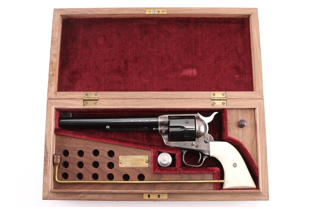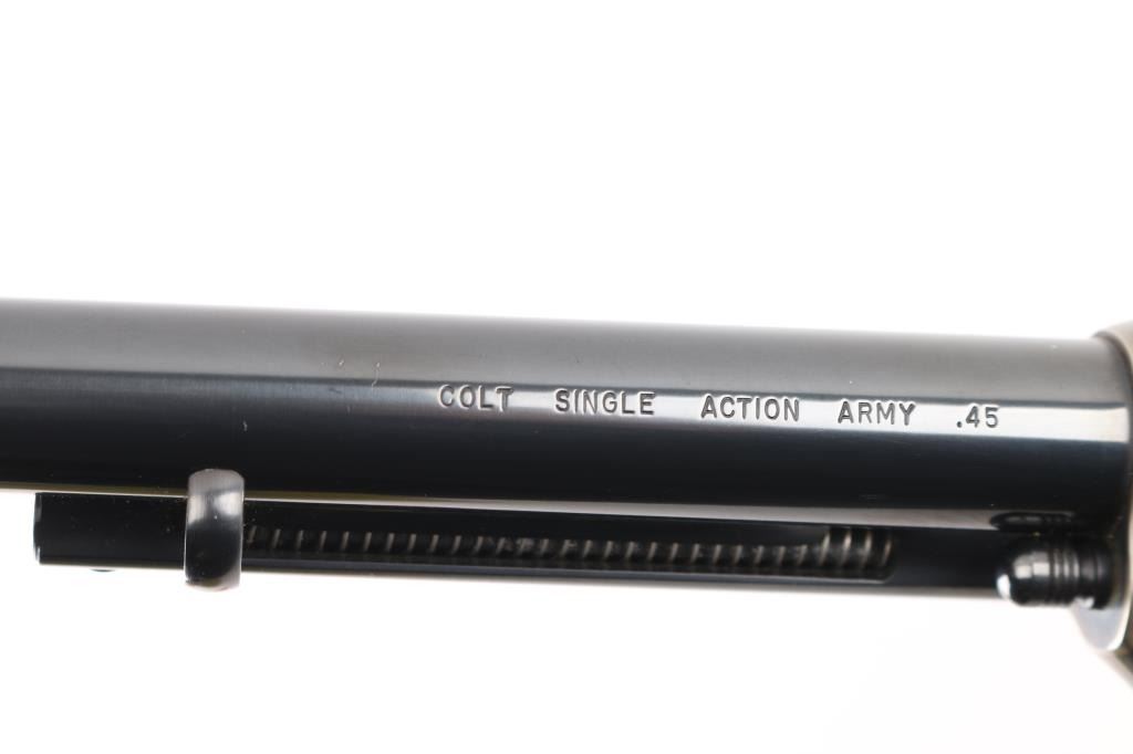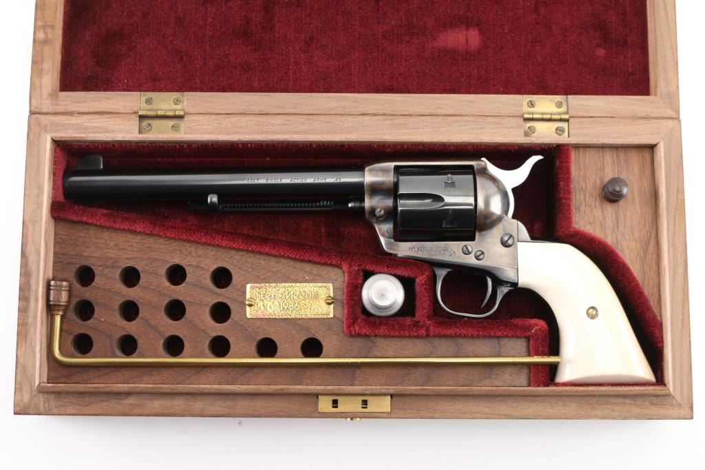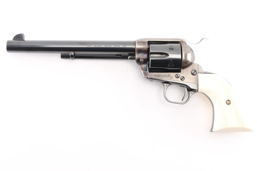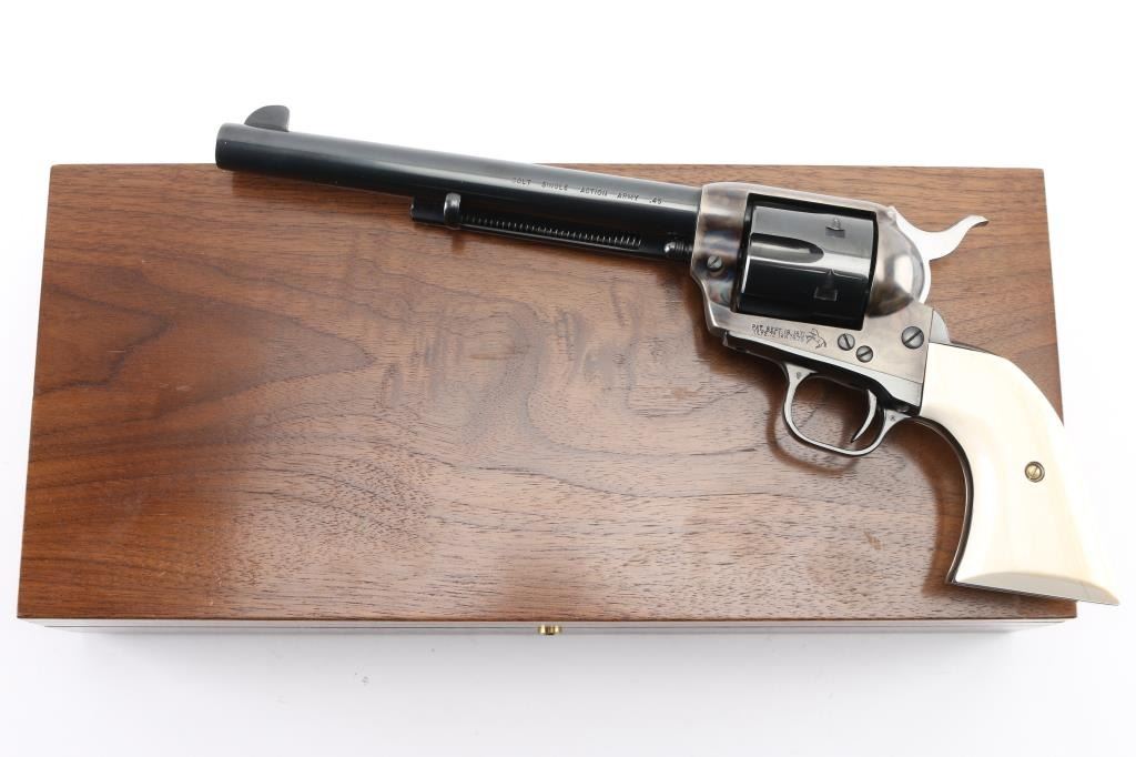 Single-Action. 6 rd capacity. 3rd Generation. Manufactured 1979. 7.5" barrel with front blade, and top strap notched rear sight. Blued metal finish, with case-hardened frame. One line Colt Address on top of barrel. Side stamped "Colt Single Action Army .45. 2 line patent dates, with Rampant Colt on left frame. Blue hammer with polished sides. Real ivory one-piece grip. Cylinder indexes properly, and hammer locks up tight. Metal finish is excellent. Bore is excellent/bright. Grips are excellent with nice mellow yellow color. Revolver is in like new condition. Appears unfired. Comes in a custom maroon velvet lined, finely grained walnut case with 14 round cartridge holder containing 6 live rds of W-W .45 Colt, compartment containing brass oiler, & two keys for the case, brass cleaning rod. and a separate oiler. Hammered brass plaque inscribed with "Len Meents 1986" (Consigner) Overall excellent condition, case has some minor scratche4s, scuffs. NRA Condition-Excellent, like new. Modern Firearm.