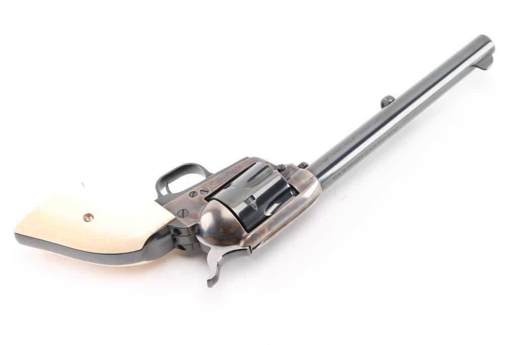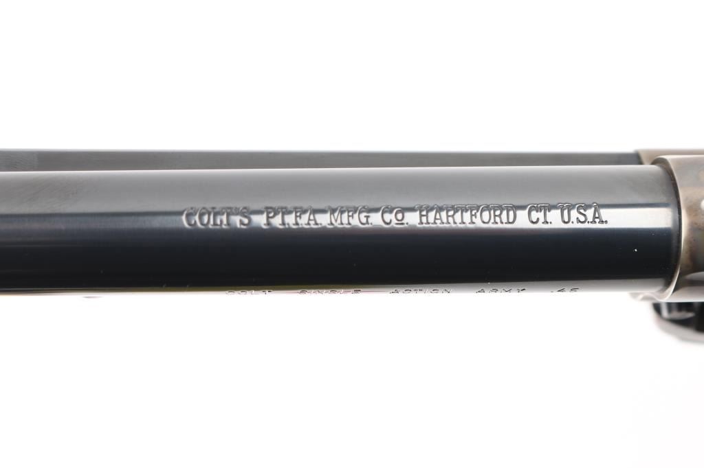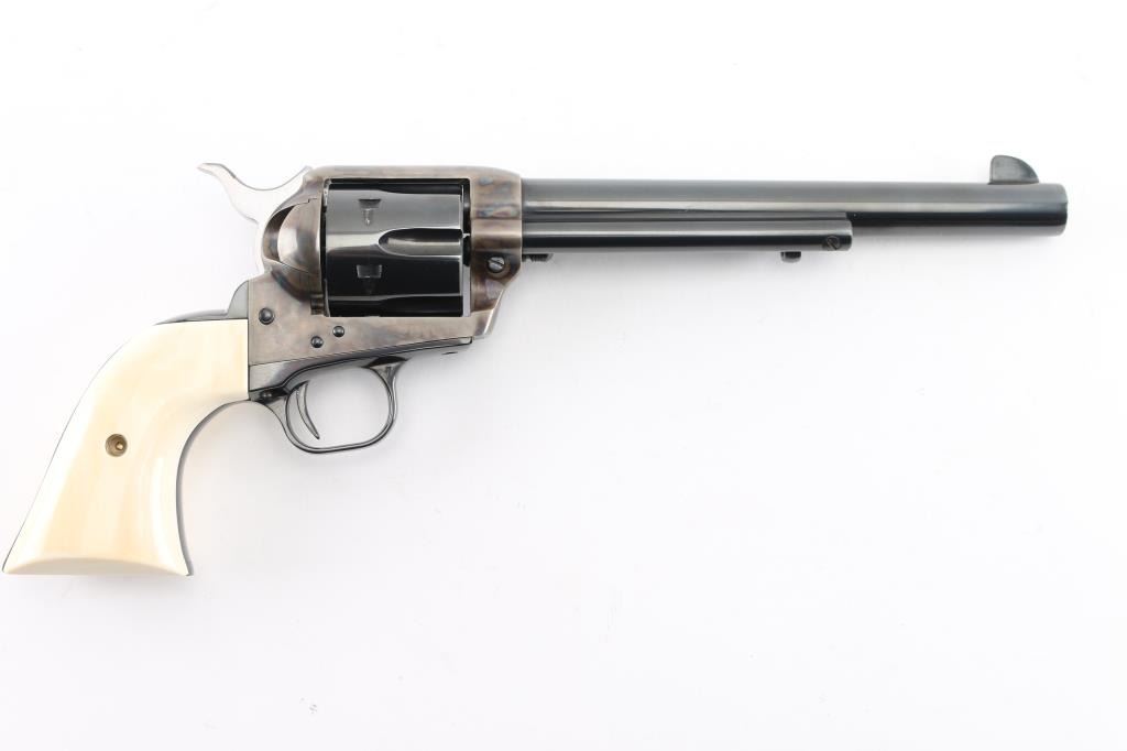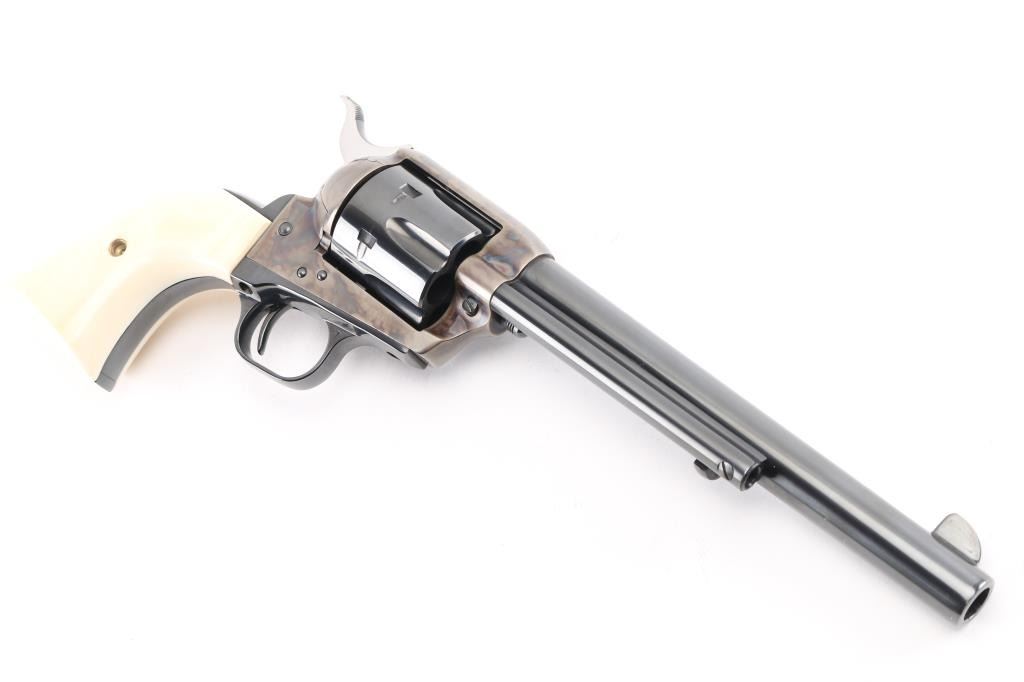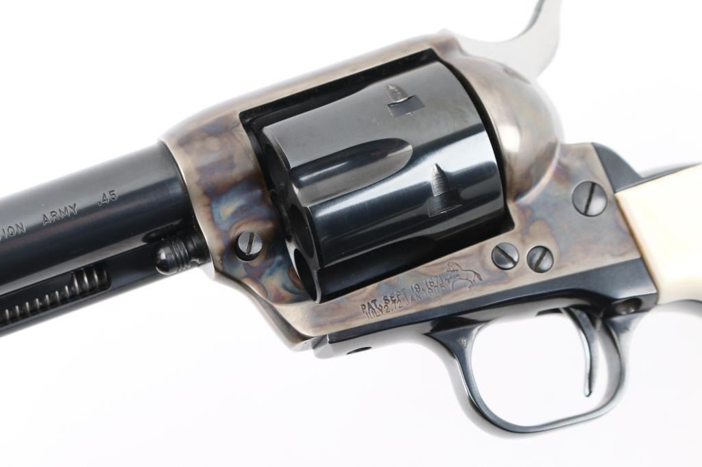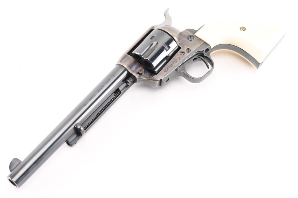 Single-Action. 6 rd capacity. 3rd Generation. Manufactured 1979. 7.5" barrel with front blade, and top strap notched rear sight. Blued metal finish, with case-hardened frame. One line Colt Address on top of barrel. Side stamped "Colt Single Action Army .45. 2 line patent dates, with Rampant Colt on left frame. Blue hammer with polished sides. Real ivory one-piece grip. Cylinder indexes properly, and hammer locks up tight. Metal finish is excellent. Bore is excellent/bright. Grips are excellent with nice mellow yellow color. Revolver is in like new condition. Appears unfired. Comes in a custom maroon velvet lined, finely grained walnut case with 14 round cartridge holder containing 6 live rds of W-W .45 Colt, compartment containing brass oiler, & two keys for the case, brass cleaning rod. and a separate oiler. Hammered brass plaque inscribed with "Len Meents 1986" (Consigner) Overall excellent condition, case has some minor scratche4s, scuffs. NRA Condition-Excellent, like new. Modern Firearm.