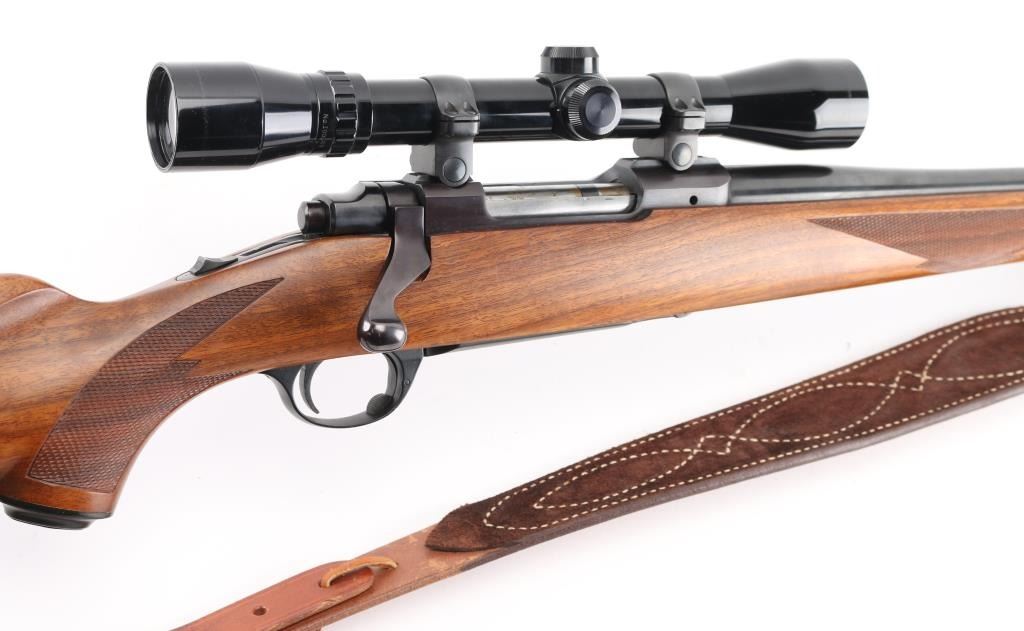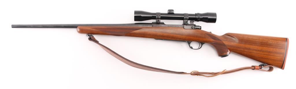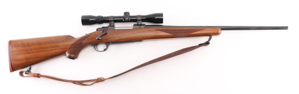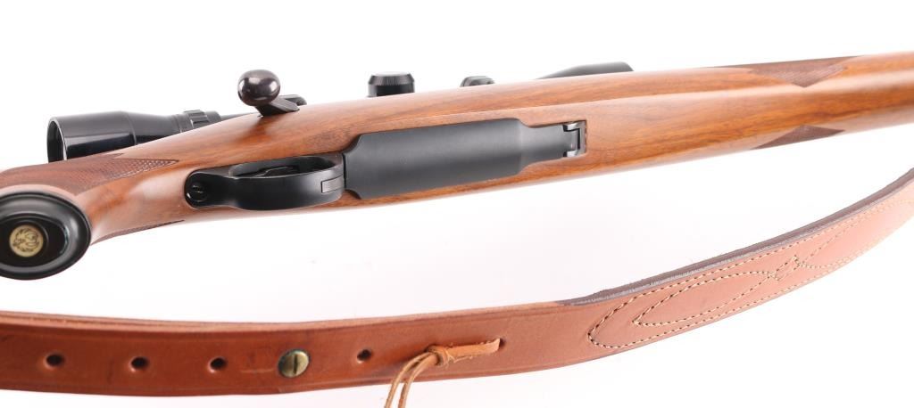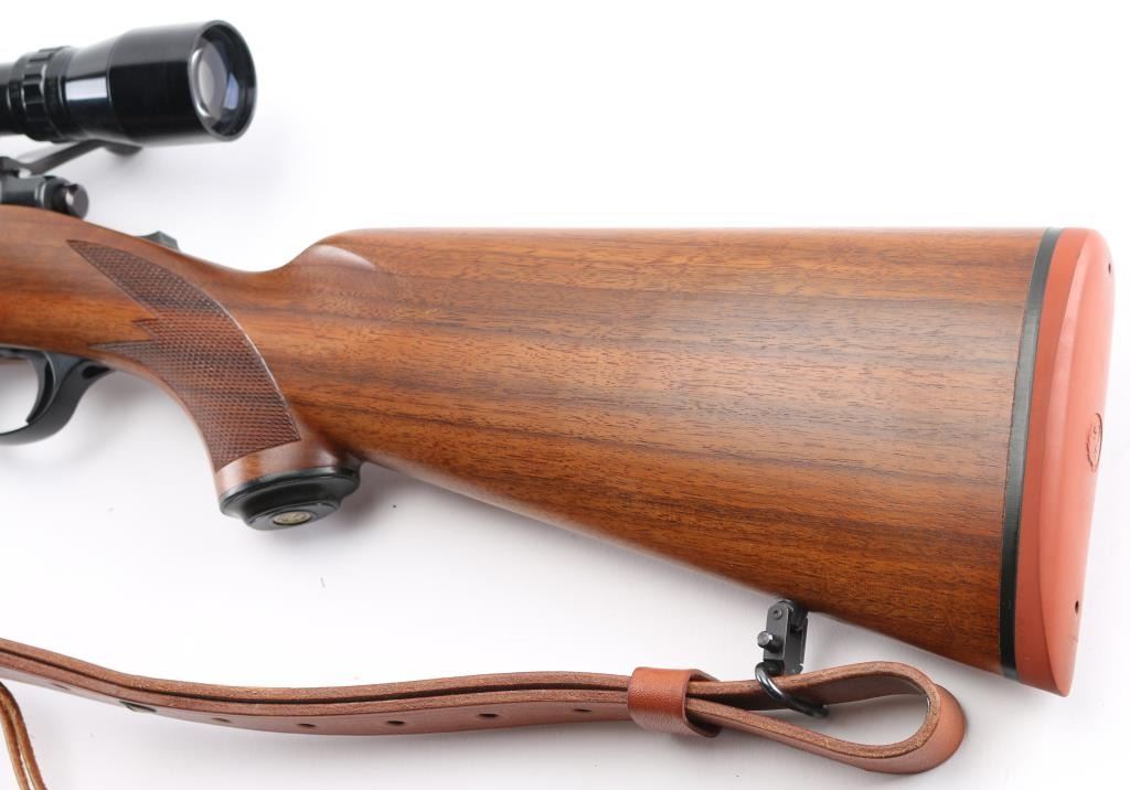Bolt action rifle with 22" blued barrel, no provisions for sights, Bausch & Lomb Balfor B scope, no power noted scope is clear and bright with fine cross hair reticles, metal and wood are in excellent condition, checkering on forend, wrist and grip, the polished bolt has surface rust, should clean up, bore is excellent/bright, tang-mounted safety, internal magazine with hinged floorplate, smooth trigger, Mauser style bolt release. Ruger grip cap and red recoil pad, nice Bianchi Cobra brown leather sling, LOP 13 1/2". Would be excellent if not for the bolt. NRA Condition-Very Good. Modern Firearm.