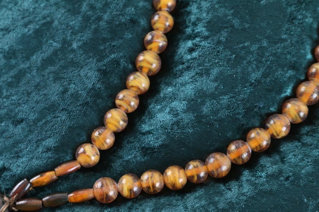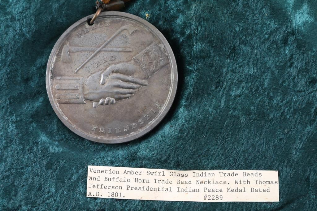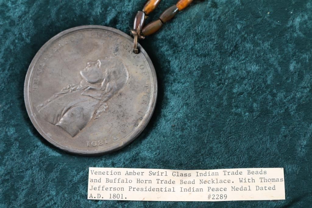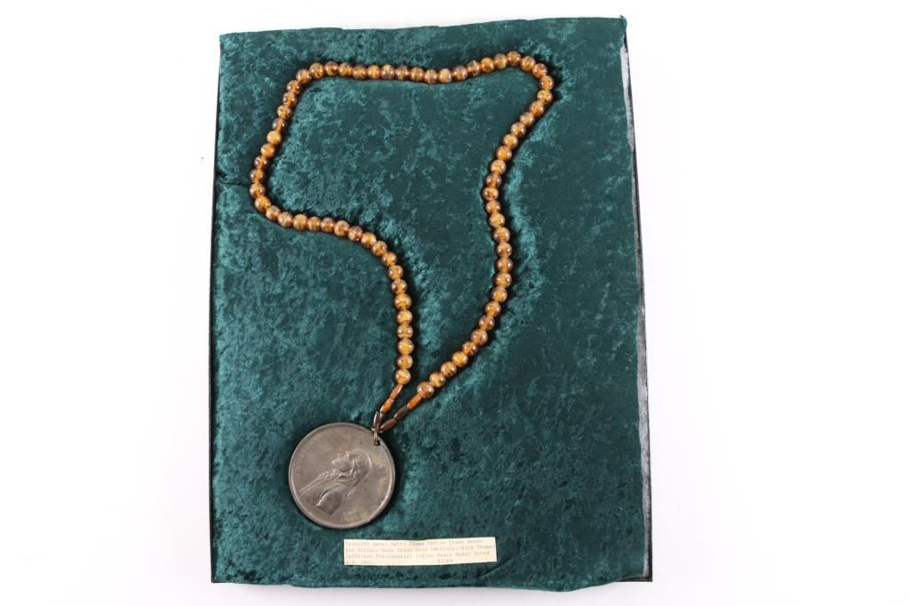 Venetion Amber Swirl Glass trade beads with a Thomas Jefferson Presidential Indian Peace Metal dated 1801AD.