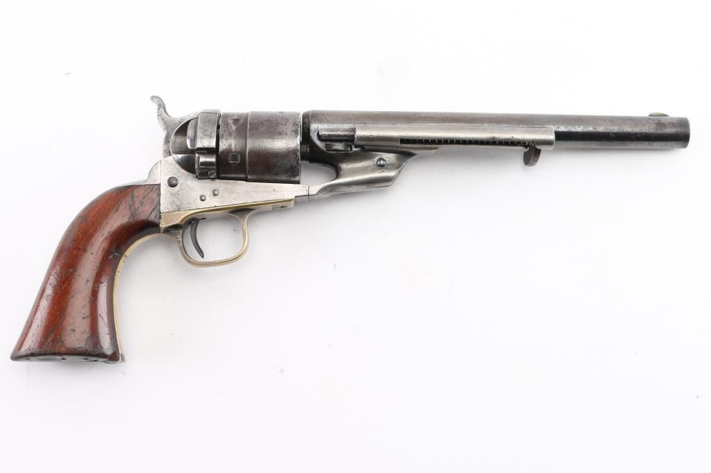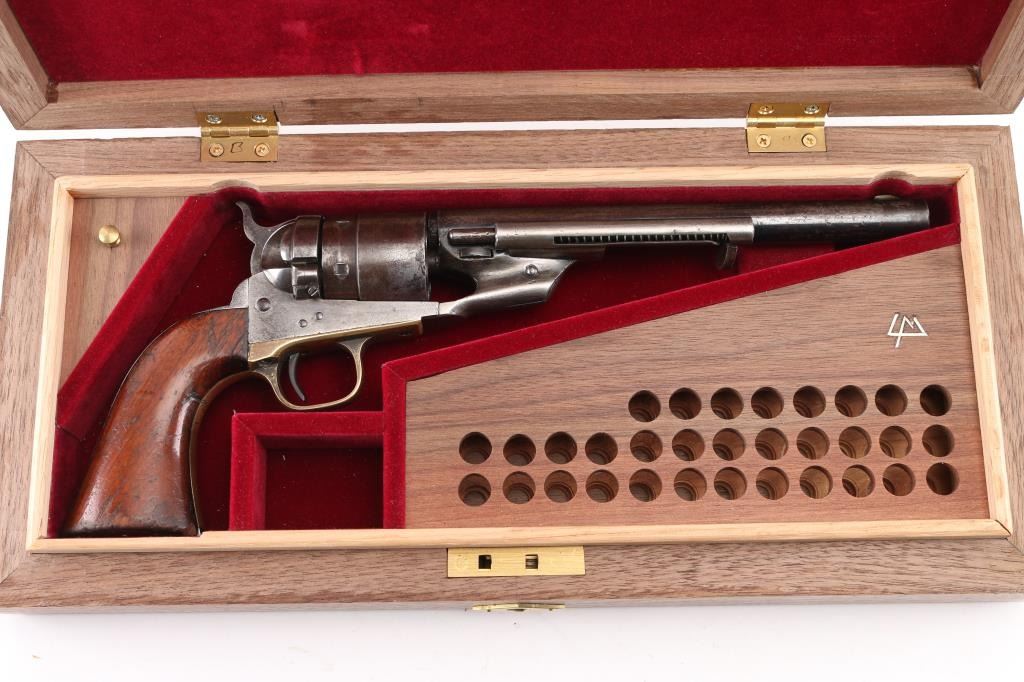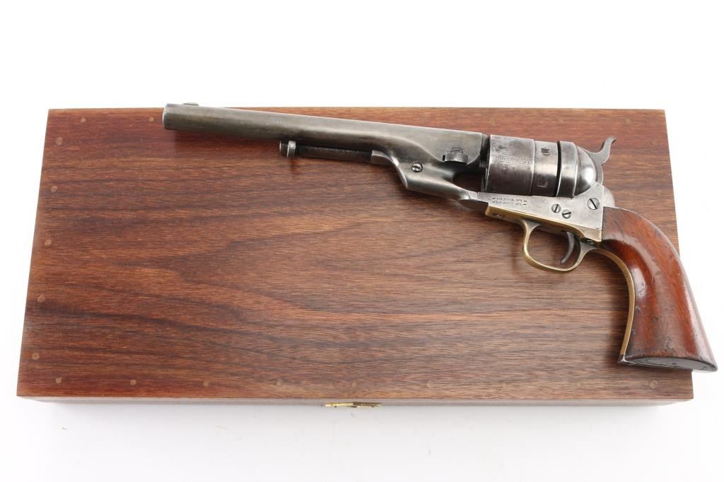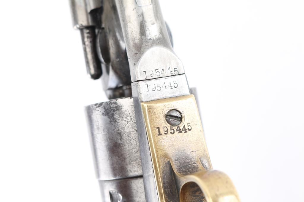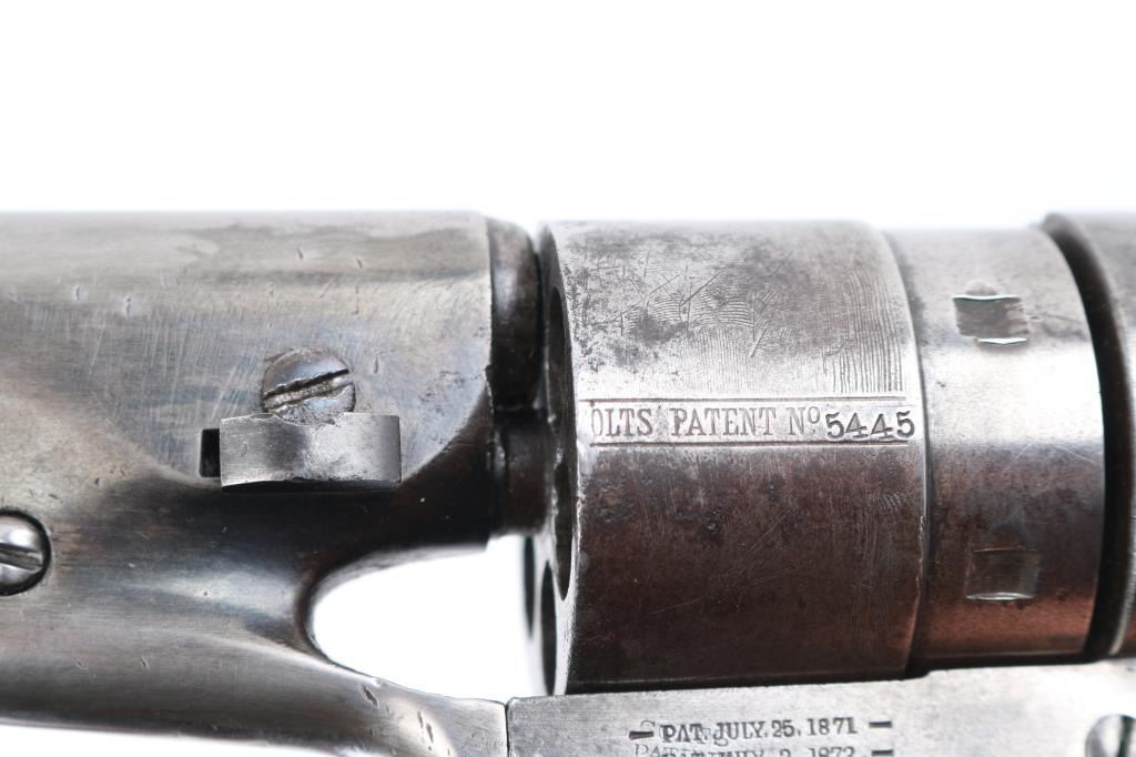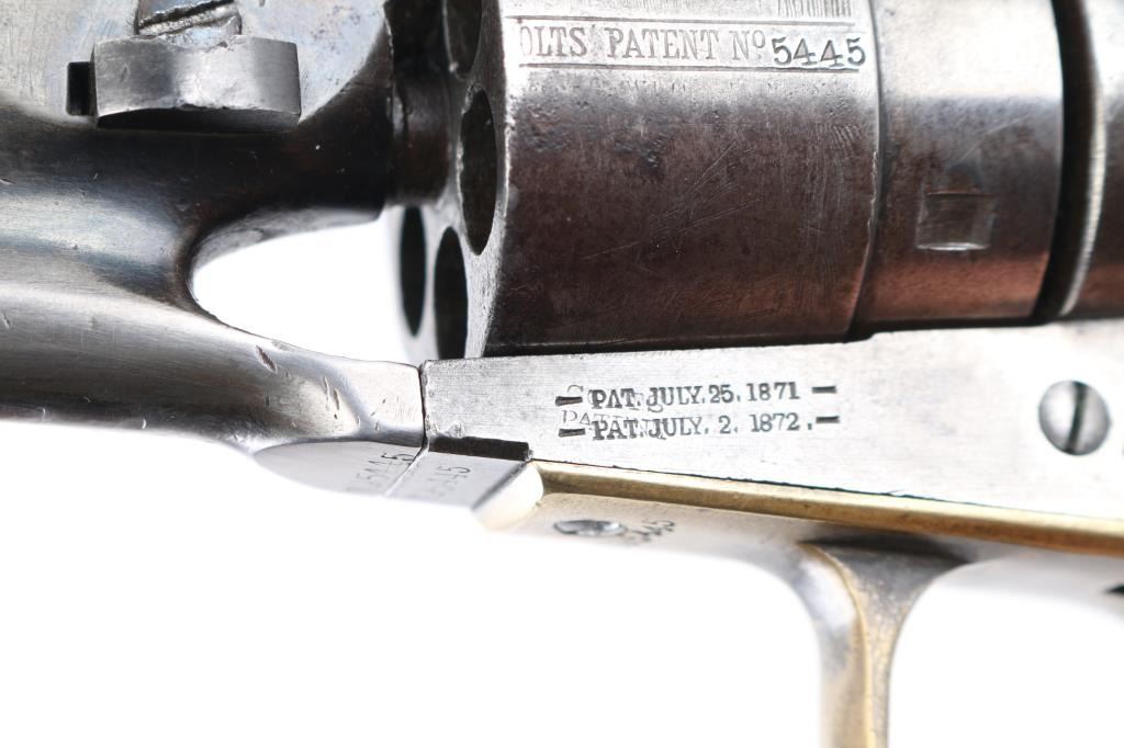 SN: 195445. Reportedly 2,100 of these Colt Model 1860 Richards-Mason conversions were manufactured circa 1877 and 1878 as cartridge revolvers using a mix of percussion revolver parts on hand and newly fabricated components. They are one of the scarcest Colt cartridge conversion revolver variations and were manufactured concurrently with the famous Colt Single Action Army. The revolver has the distinctive breech plate without a rear sight, a matching serial numbered loading gate, 5445, (Last Number is faint) with external spring. It is theorized that these late conversions were all based on using up the left over 1860 percussion pistol that still remained at the Colt factory. 1860 Army manufactured 1871. This type of conversion was performed by fitting it with a new cylinder ring in front of the recoil shield and installing a new loading gate on the frame with an internal spring. The loading lever has been replaced with an ejector housing on the right side of the barrel lug, which has the cross-hatched ejector head. The top of the barrel is marked "-ADDRESS COL. SAML COLT NEW-YORK U.S. AMERICA-" and the left side of the frame is marked "COLTS/PATENT". The cylinder is roll engraved with the Texas Navy scene and "COLT'S PATENT NO. 5445". "Engaged 16 May 1843" stamped in small letters/numbers on the forward cylinder. The complete matching serial number "195445" is stamped on the barrel lug, frame, trigger guard and back strap, and the wedge is unnumbered. Patent dates "July 25 1872" & "July 2 1872" have been stamped over the original Patent dates at the Colt factory. The revolver has a three screw frame, brass trigger guard, iron back strap and one piece oil finished walnut grip, grip has 5 very small brass tacks in the heel. Firing pin installed on hammer with two pins. Bore is very good, strong rifling, some frosting, mechanically excellent, grips are very good overall with a minor chip on the bottom left, cartouches have worn away, the barrel address & serial numbers are a little faint, but readable, the naval battle scene is complete (faint), the metal finish has turned a gray patina, with some minor scattered pin-prick pitting, some original blue on the right barrel, & around the ejector housing. Comes in a contemporary walnut form fitting case with red felt lining, with 32 round cartridge holder. Very Good condition. NRA condition-Very Good as Antique Firearm.