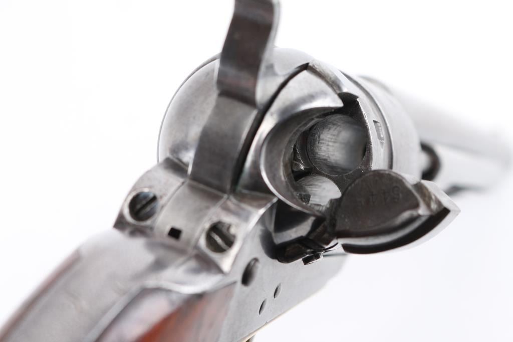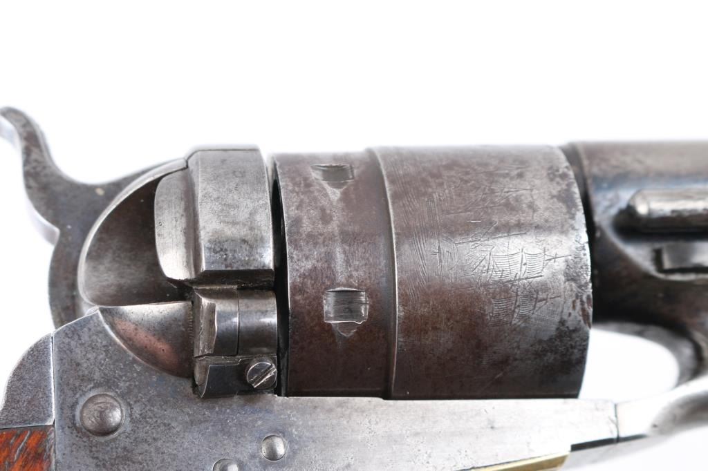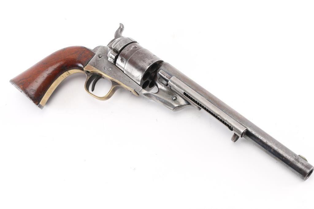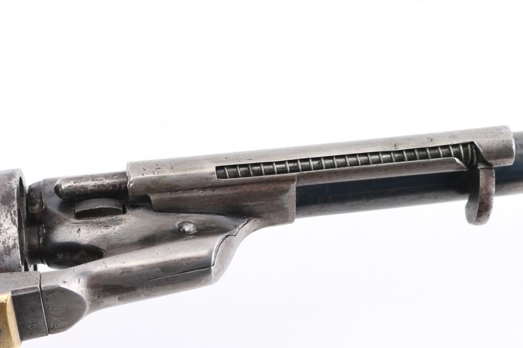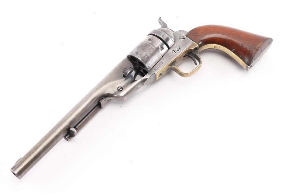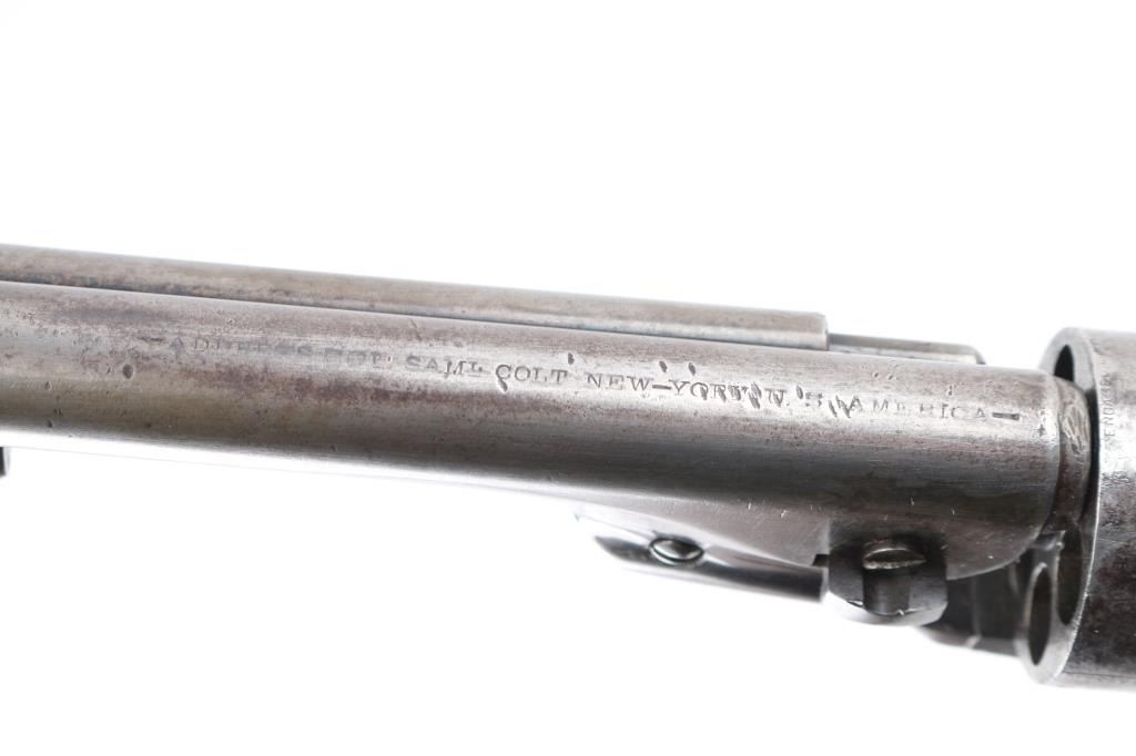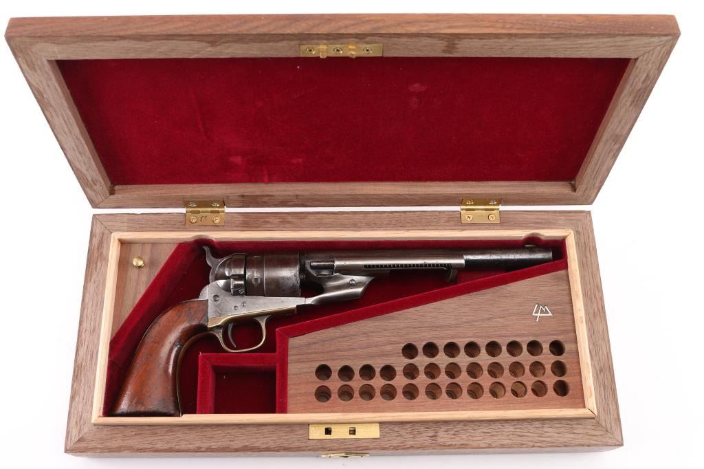 SN: 195445. Reportedly 2,100 of these Colt Model 1860 Richards-Mason conversions were manufactured circa 1877 and 1878 as cartridge revolvers using a mix of percussion revolver parts on hand and newly fabricated components. They are one of the scarcest Colt cartridge conversion revolver variations and were manufactured concurrently with the famous Colt Single Action Army. The revolver has the distinctive breech plate without a rear sight, a matching serial numbered loading gate, 5445, (Last Number is faint) with external spring. It is theorized that these late conversions were all based on using up the left over 1860 percussion pistol that still remained at the Colt factory. 1860 Army manufactured 1871. This type of conversion was performed by fitting it with a new cylinder ring in front of the recoil shield and installing a new loading gate on the frame with an internal spring. The loading lever has been replaced with an ejector housing on the right side of the barrel lug, which has the cross-hatched ejector head. The top of the barrel is marked "-ADDRESS COL. SAML COLT NEW-YORK U.S. AMERICA-" and the left side of the frame is marked "COLTS/PATENT". The cylinder is roll engraved with the Texas Navy scene and "COLT'S PATENT NO. 5445". "Engaged 16 May 1843" stamped in small letters/numbers on the forward cylinder. The complete matching serial number "195445" is stamped on the barrel lug, frame, trigger guard and back strap, and the wedge is unnumbered. Patent dates "July 25 1872" & "July 2 1872" have been stamped over the original Patent dates at the Colt factory. The revolver has a three screw frame, brass trigger guard, iron back strap and one piece oil finished walnut grip, grip has 5 very small brass tacks in the heel. Firing pin installed on hammer with two pins. Bore is very good, strong rifling, some frosting, mechanically excellent, grips are very good overall with a minor chip on the bottom left, cartouches have worn away, the barrel address & serial numbers are a little faint, but readable, the naval battle scene is complete (faint), the metal finish has turned a gray patina, with some minor scattered pin-prick pitting, some original blue on the right barrel, & around the ejector housing. Comes in a contemporary walnut form fitting case with red felt lining, with 32 round cartridge holder. Very Good condition. NRA condition-Very Good as Antique Firearm.