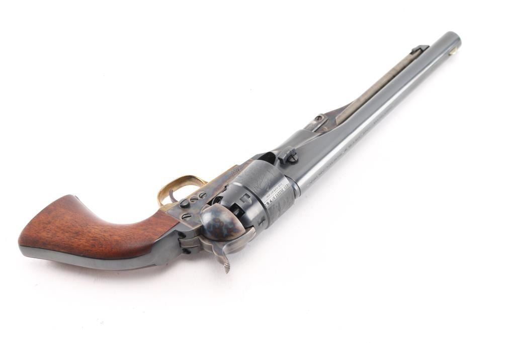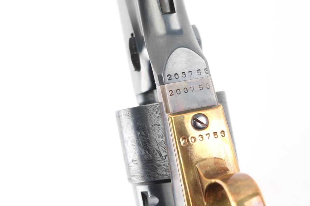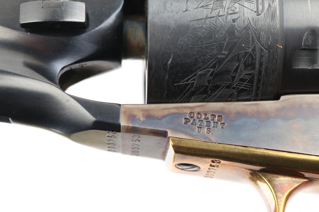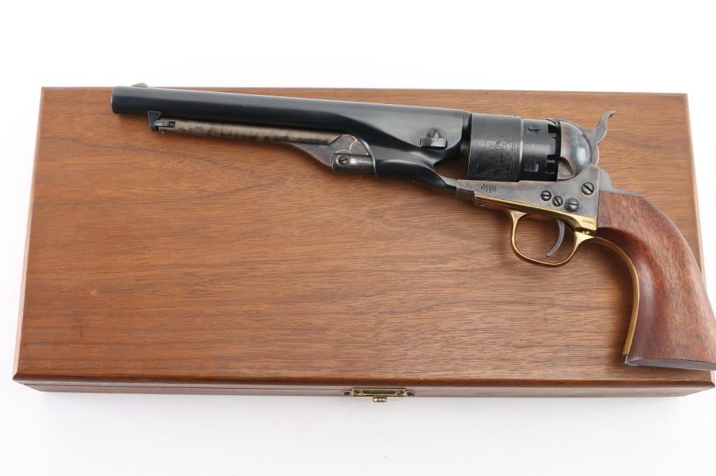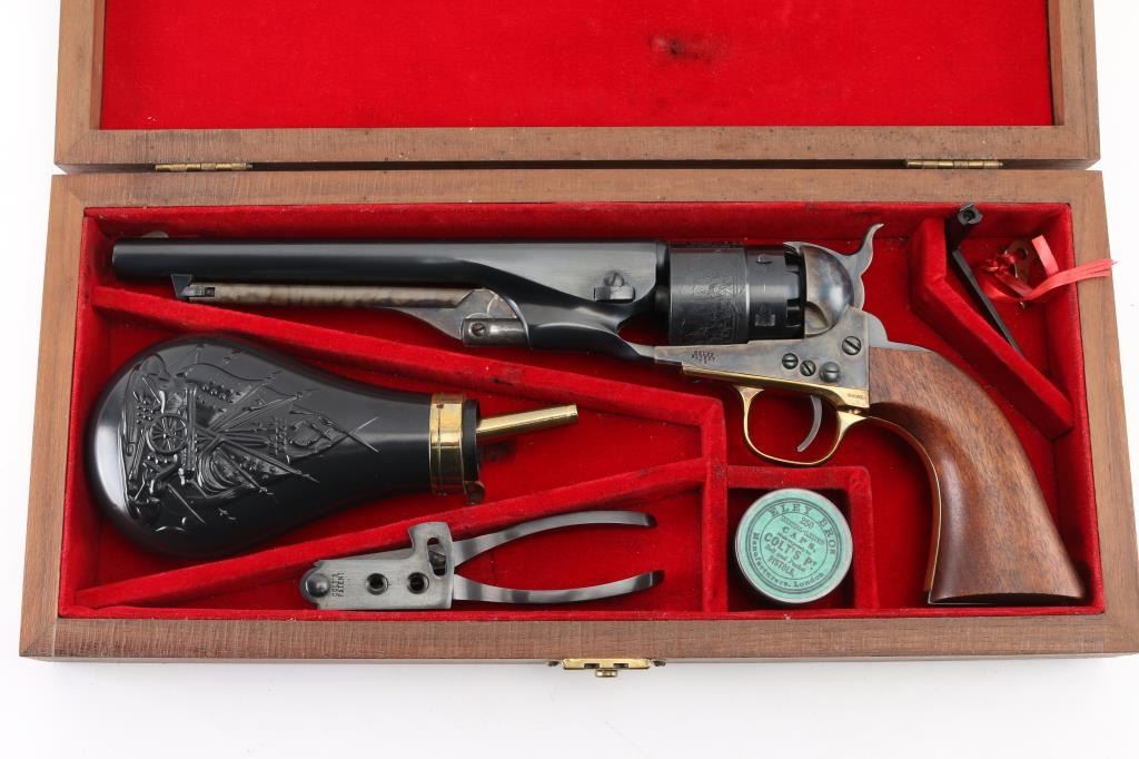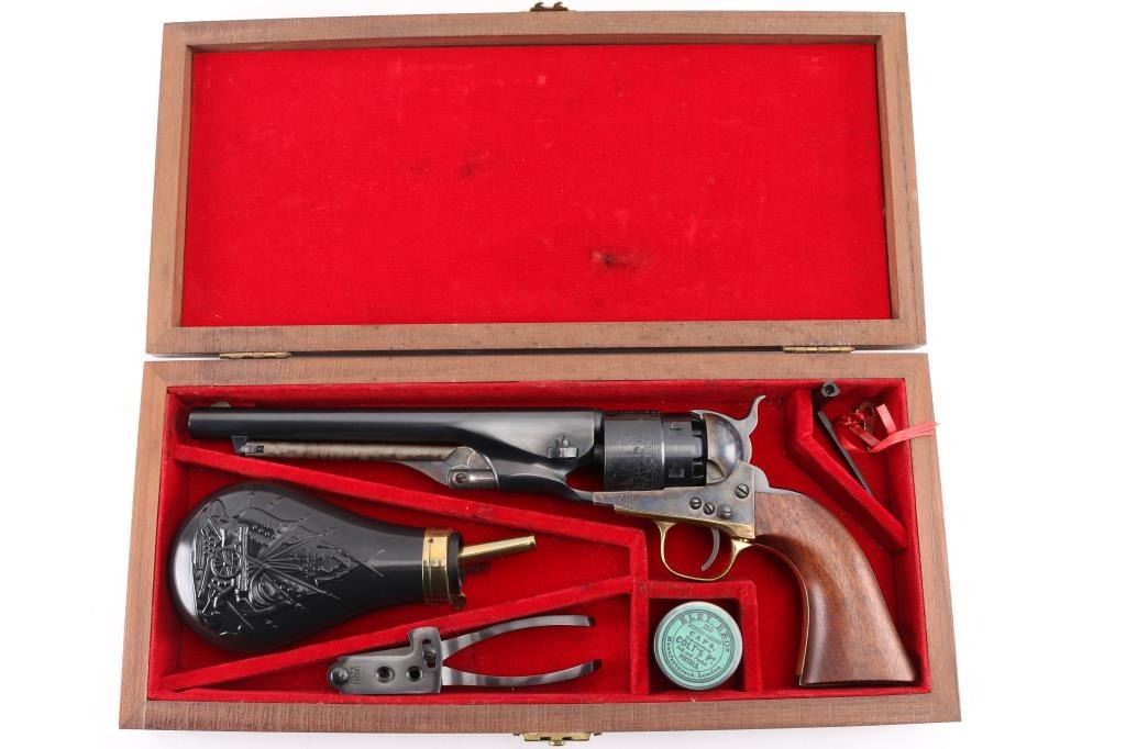 'Black powder Series' Single action percussion revolver chambered for .44 caliber ammunition. Features a blued & case hardened finish, 8" barrel, brass blade front sight, 'v' notch rear sight cut in the hammer lip, smooth thin trigger, knurled hammer spur, non-fluted six shot cylinder with roll stamped naval engagement scene, loading lever, brass triggerguard, provisions for a shoulder stock, one-piece varnished walnut grip. Revolver is in like in like new condition. Action is crisp, the bore is excellent and the wood grip is excellent. Comes in an excellent conditioned red felt lined display case with powder flask, nipple wrench, bullet mold, green labeled Eley cap box, and the key to the case. NRA Condition-Perfect in Box. Antique Firearm.