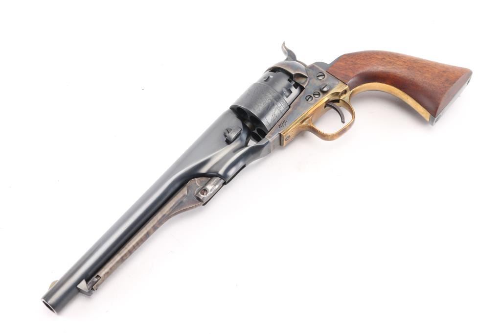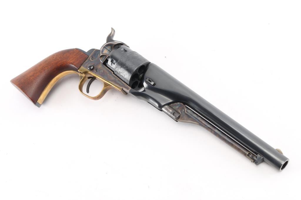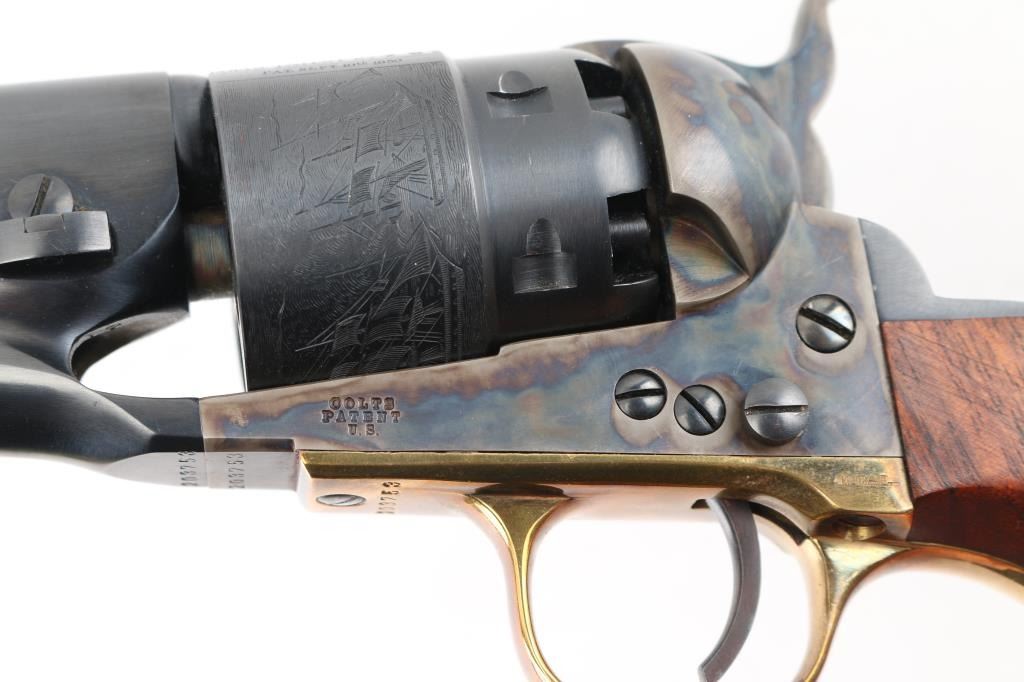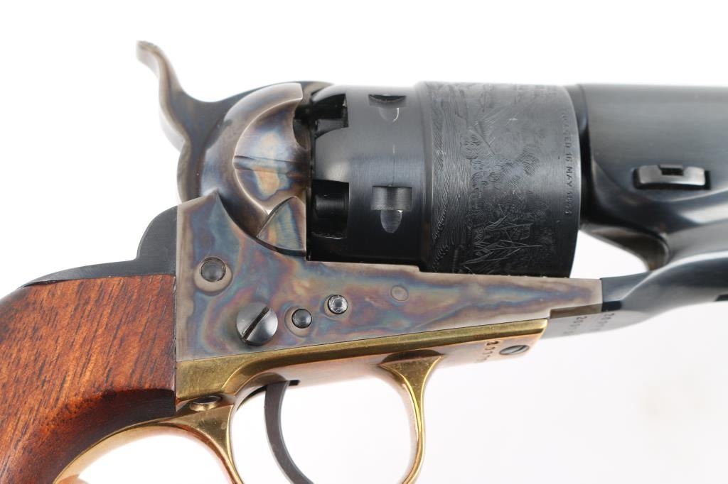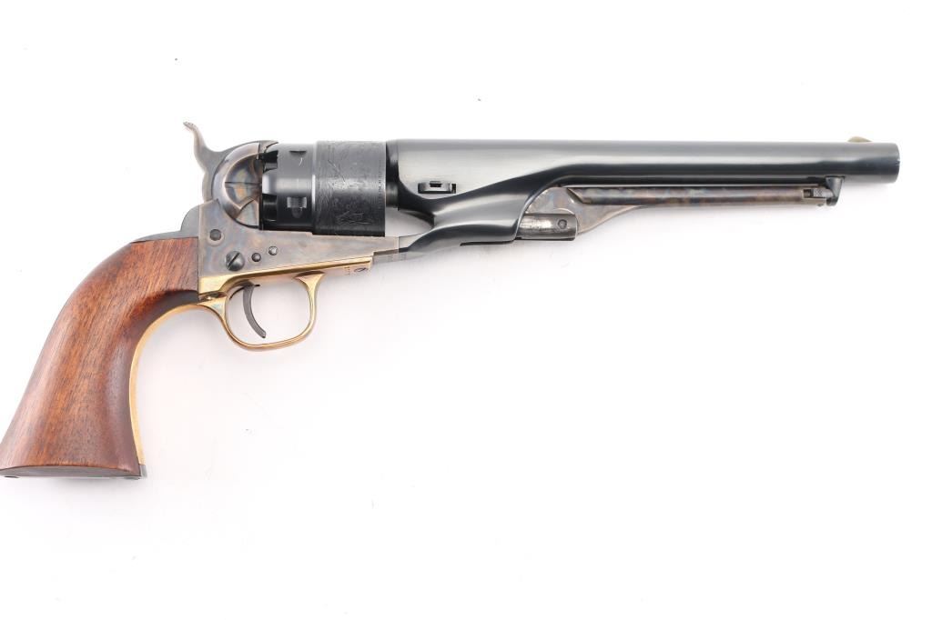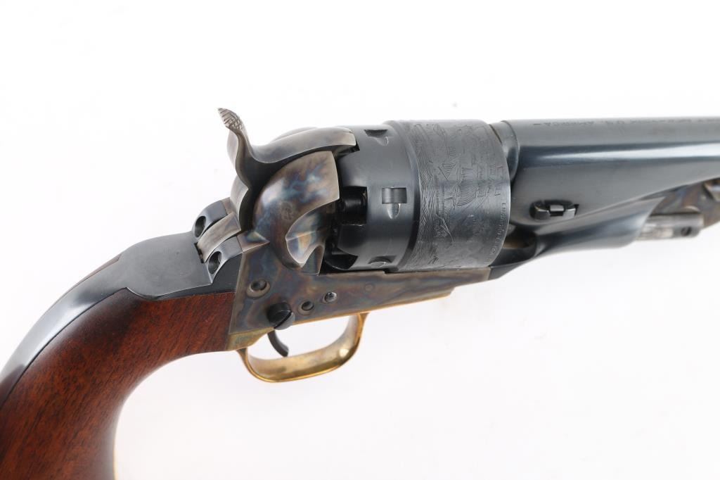 'Black powder Series' Single action percussion revolver chambered for .44 caliber ammunition. Features a blued & case hardened finish, 8" barrel, brass blade front sight, 'v' notch rear sight cut in the hammer lip, smooth thin trigger, knurled hammer spur, non-fluted six shot cylinder with roll stamped naval engagement scene, loading lever, brass triggerguard, provisions for a shoulder stock, one-piece varnished walnut grip. Revolver is in like in like new condition. Action is crisp, the bore is excellent and the wood grip is excellent. Comes in an excellent conditioned red felt lined display case with powder flask, nipple wrench, bullet mold, green labeled Eley cap box, and the key to the case. NRA Condition-Perfect in Box. Antique Firearm.