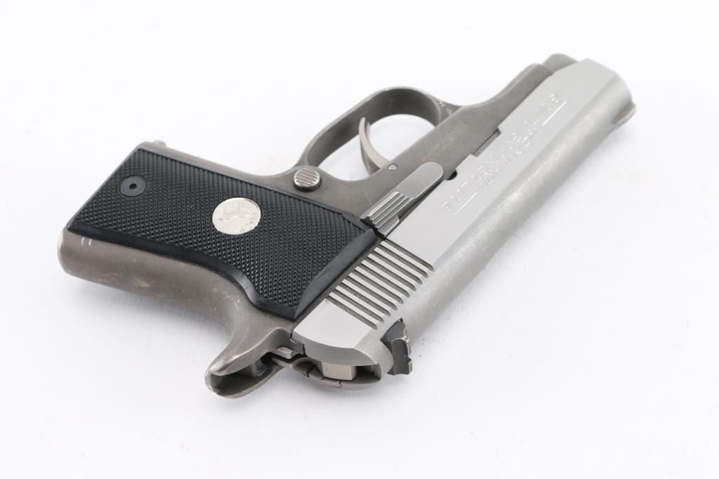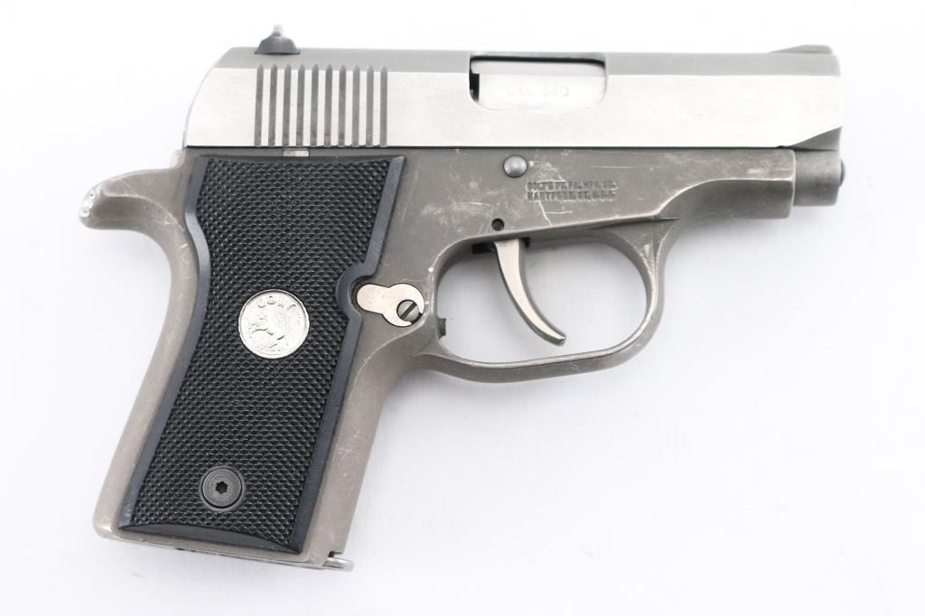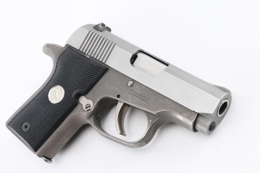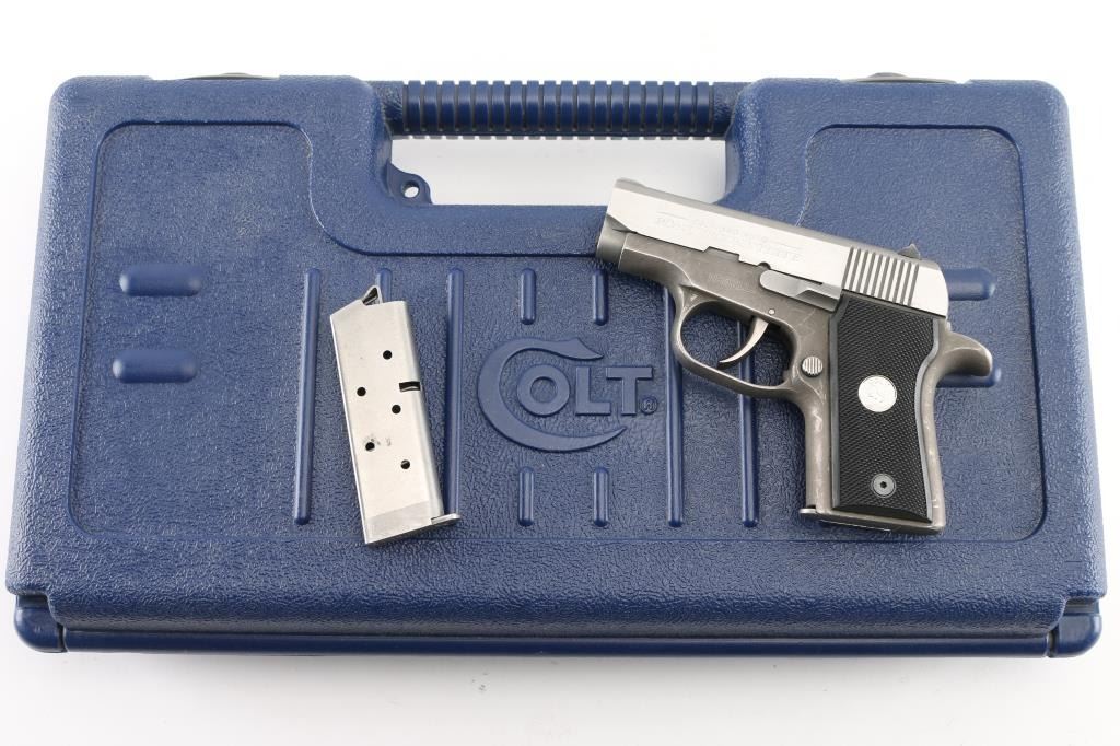 This rare little Colt model was only made for 2 years 1997-99. It is DOUBLE ACTION ONLY , bobbed hammer Its a super little carry gun as it only weighs 13 oz. It has matte brushed stainless slide with polished flats and dark grey matte alloy frame with black composition grips with silver Colt Pony logos. 2 3/4 " barrel , factory fixed sights. factory 6 rd magazine. Bore is excellent/bright, action is smooth/tight. There is edge wear/scratches on the frame. Grips are excellent. Comes in blue factory case with matching label, spare factory magazine, (2) total, lock, & manual. NRA Condition-Very Good. Modern Firearm.