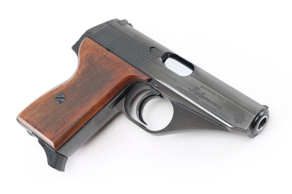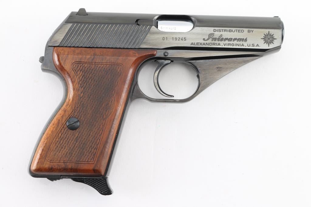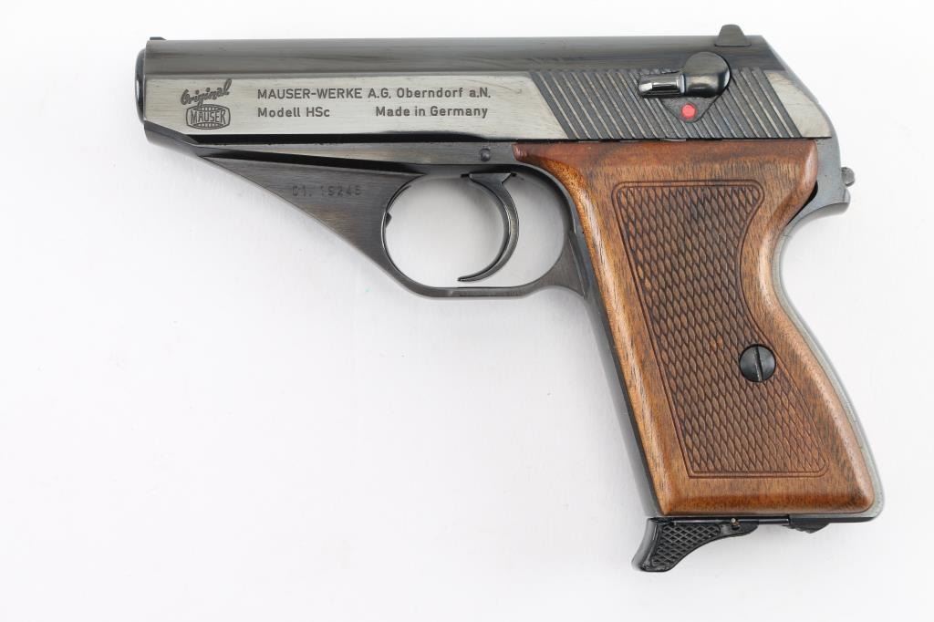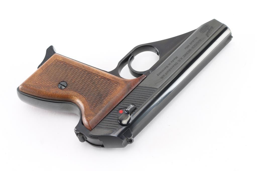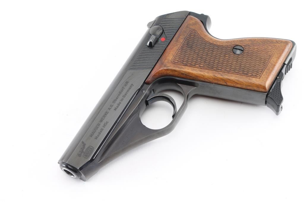 German made compact semi-automatic pistol, DA, also chambers the 9x17mm Browning Short, blowback operated, approximately 3 1/4" barrel, bore is pristine, the barrel can be detached from the frame by the release of the lock, located inside of the triggerguard, the slide has serrations at the rear, front sight blade is concealed within longitudinal groove on the top of the slide, open notch rear sight, the hammer is concealed within the slide except for the small lip that protrudes from under the slide and allows for manual cocking, the safety switch is mounted on the slide and when engaged (lowered), moves the rear part of the firing pin out of the reach of hammer and locks it, smooth trigger, checkered wood grips, smooth frontstrap and backstrap, single stack Mauser magazine, The serial numbers on the frame and slide match. Includes a blue plastic box with instruction manual ,cleaning rod. Blue finish & grips are excellent. NRA Condition-Excellent. Modern Firearm.