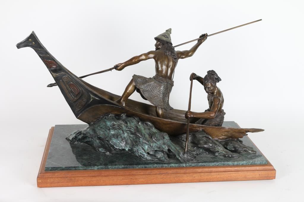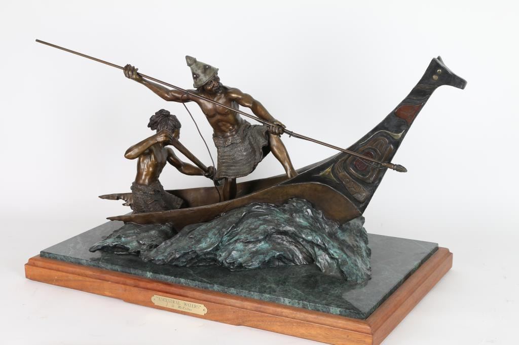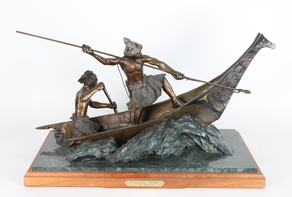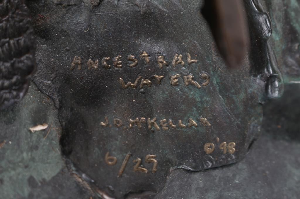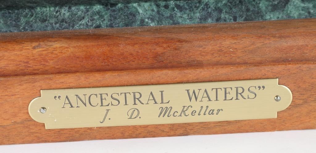 By Jerry McKellar, entitled "Ancestral Waters" measures 32"x16"x20", signed and numbered in bronze 6 out of 25. Jerry D. McKellar (Born 1944) is active/lives in Washington. Jerry McKellar is known for Romantic wildlife and Indian sculpture.