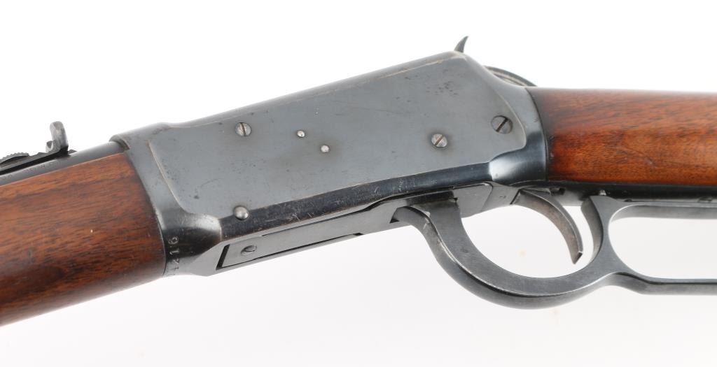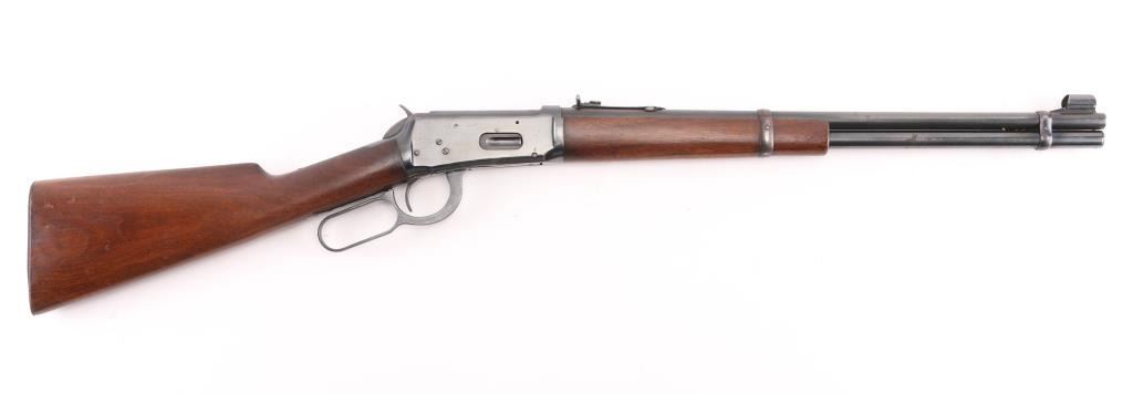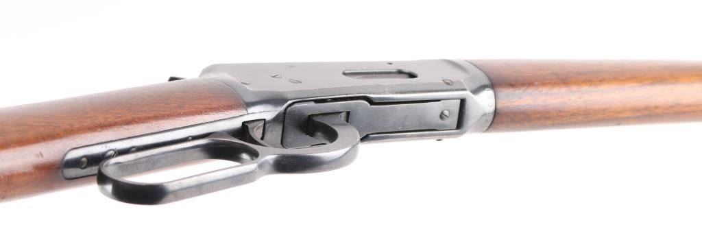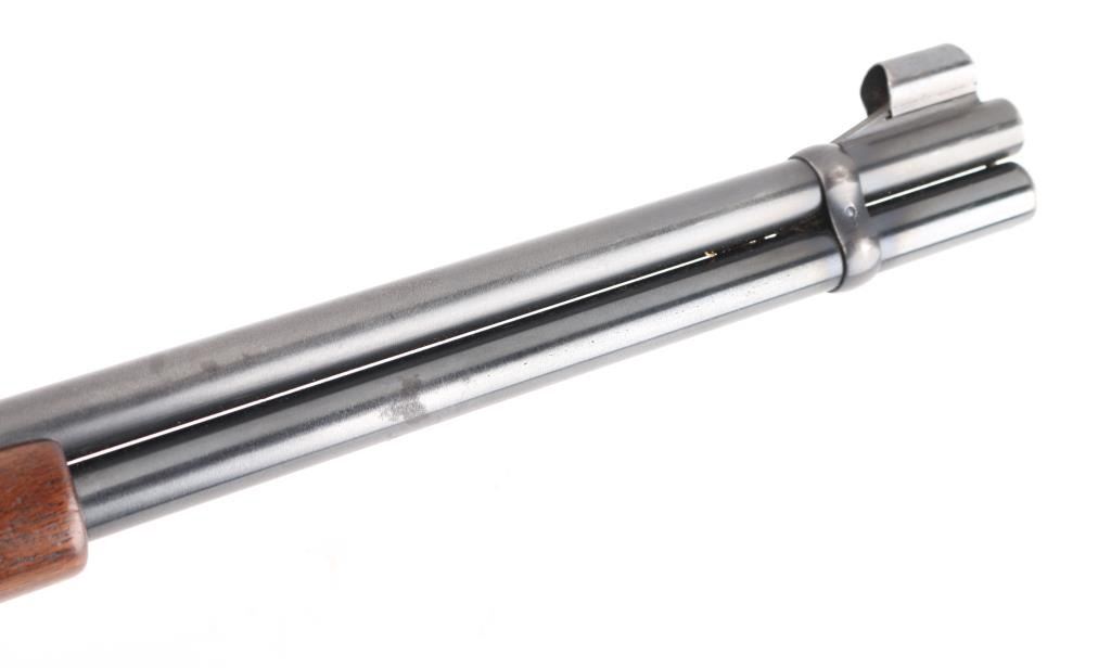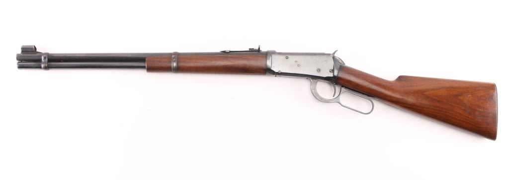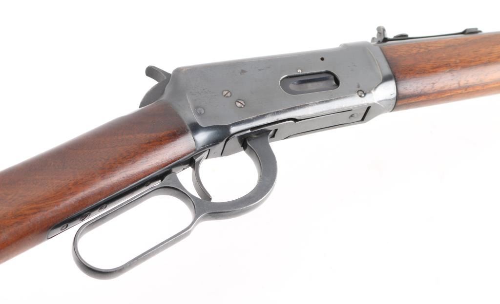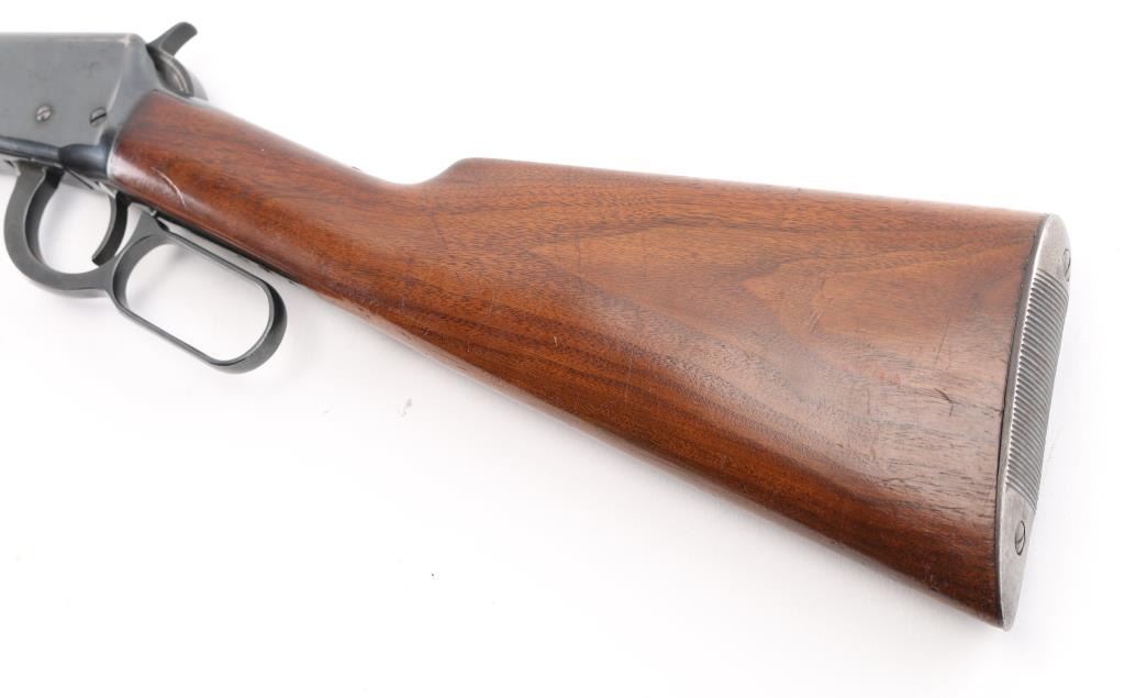 'Pre-64 Eastern Carbine' Lever action repeating rifle manufactured in New Haven, CT circa 1942. Features a blued finish, 20" tapered barrel, full-length tube magazine, hooded ramped blade/bead front sight, sporting adjustable rear sight, smooth trigger, serrated hammer spur, two barrel bands, smooth walnut forend and straight grip shoulder stock with serrated steel buttplate. Bore is excellent condition, bright, strong rifling. Retains 90% finish with edge losses, scratches. Wood is very good condition with minor scrathes. NRA Condition-Very Good. C&R Firearm.