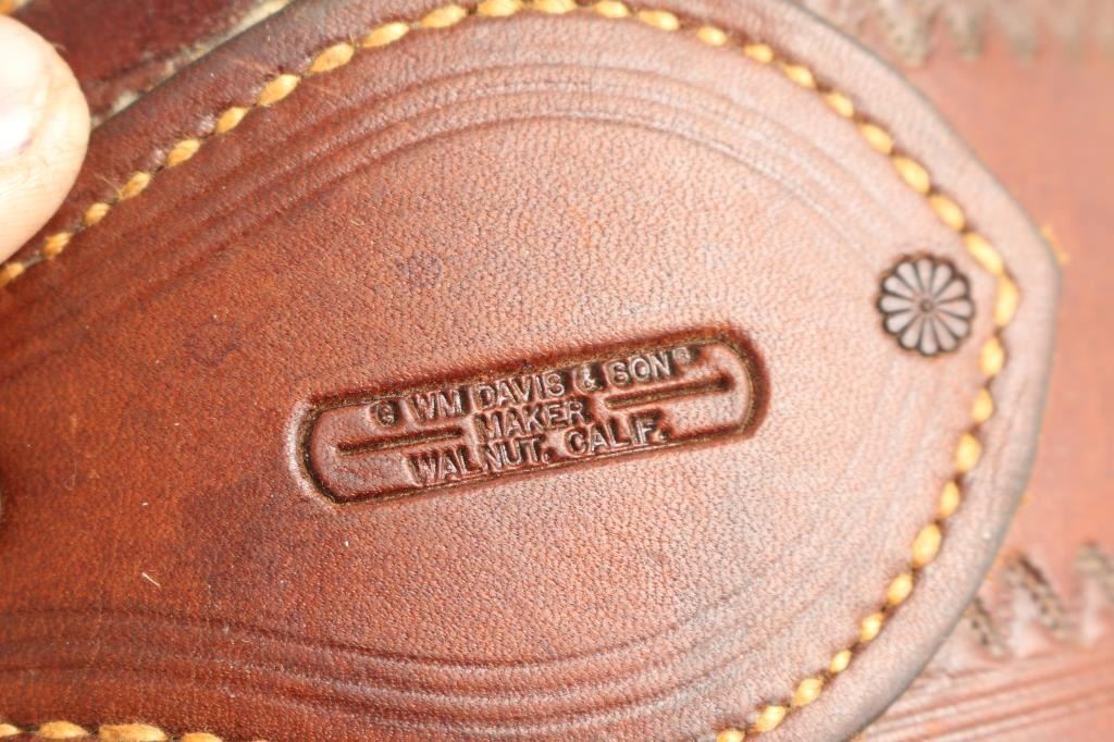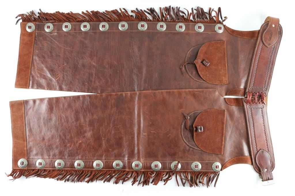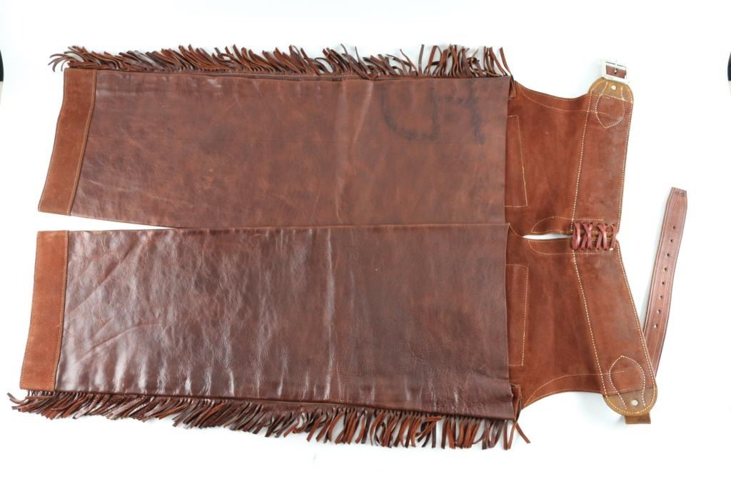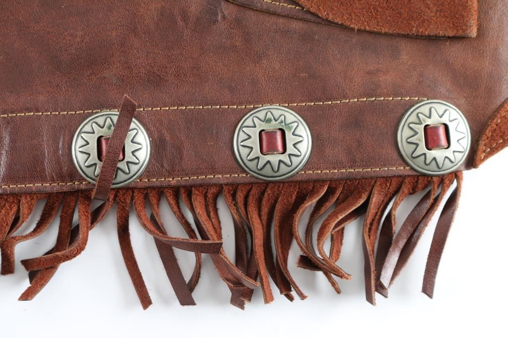 made by WM Davis & Son Walnut Creek CA Circa 1950-60's. Brown leather with fringed design. Approx measurements: 40" high. 40" belt at waist, 22" around mid-thigh.
