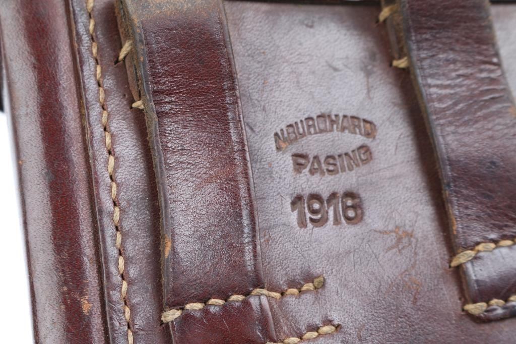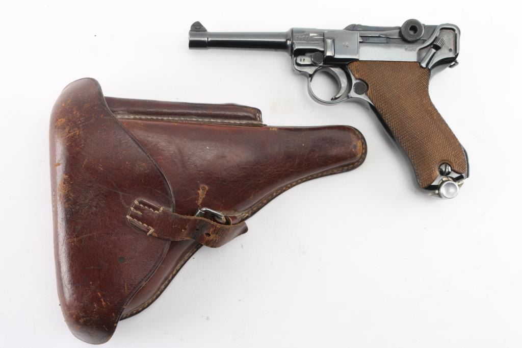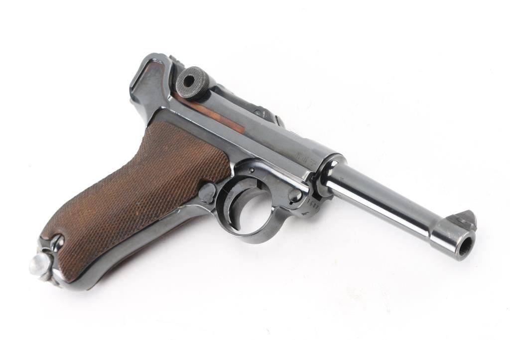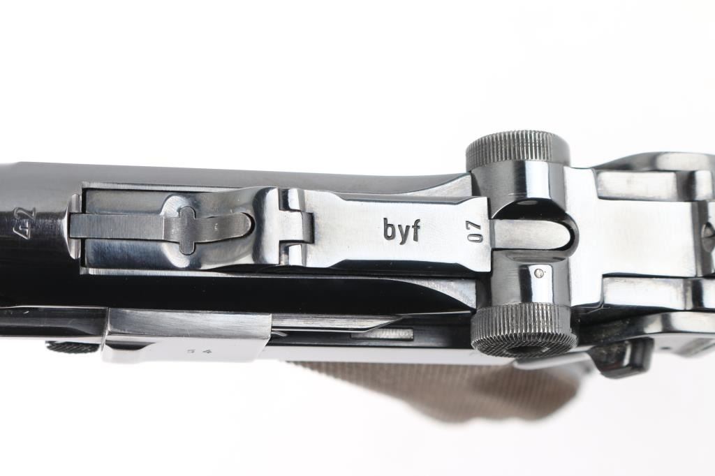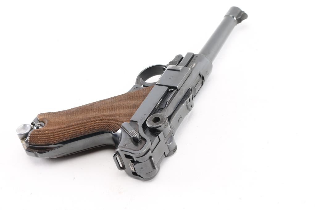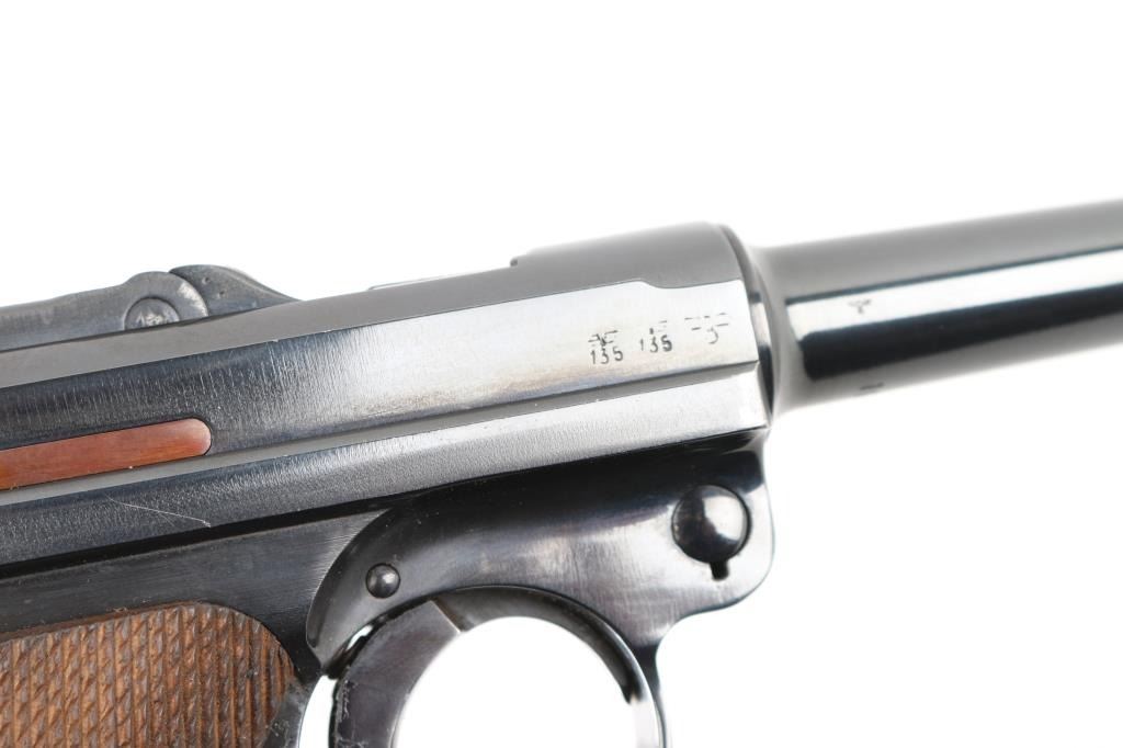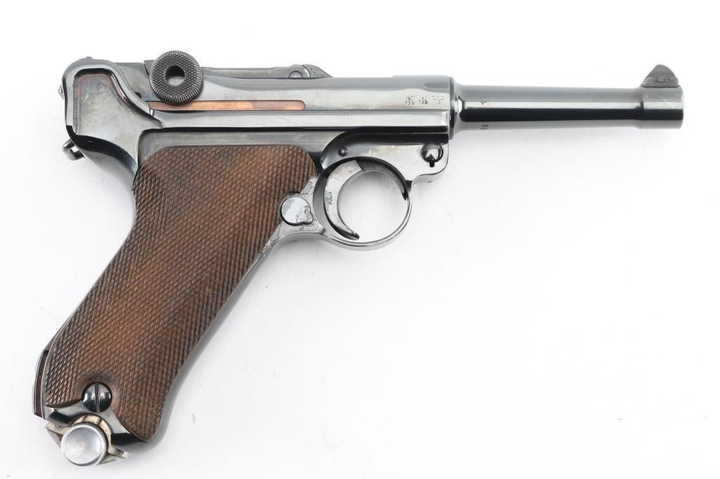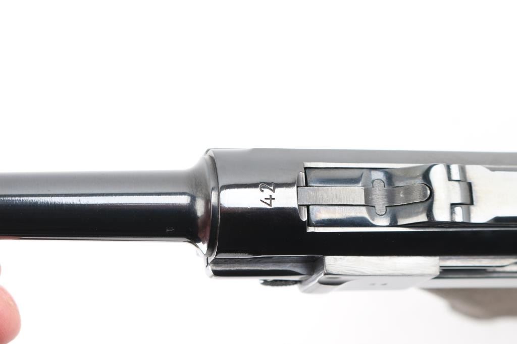 Pre or Early WWII era German military toggle locked recoil operated semi-automatic pistol chambered in 9x19mm Luger. "42" code on receiver indicates manufacture circa 1938-1940. No import marks observed. Features polished re-blued finish, 4" barrel, dovetailed inverted 'V' front sight with witness-marks, 'v' notched rear sight, smooth crescent trigger, knurled charging knobs on the rear toggle link, manual safety on the left side of the frame, knurled push button magazine release, steel frame with lanyard loop & stock lug, and two-piece finely checkered wood grips. Most observed numbers match, with sideplate numbered "54". Bore is very good condition overall with few tiny pits. Appears heavily polished before refinishing, with trigger & safety blued, erosion of markings with major marks still readable. Retains 90% re-finish with edge losses & handling marks. Some small dents or pits in metal visible under refinish, as well as sanding marks not polished out before bluing. Grips are very good, tight to frame. Markings include Waffenamt 135, 'byf' on toggle. MArkings show erosion from rework process. Included magazine is bright metal, with aluminum plug numbered "6396k". Magazine catch spring broken or missing. Includes good condition brown color leather hard shell full flap holster, marked on back "N. BURGHARD / PASING / 1916" Condition is NRA Good++ (as reblued, broken spring) *** C&R Firearm ***