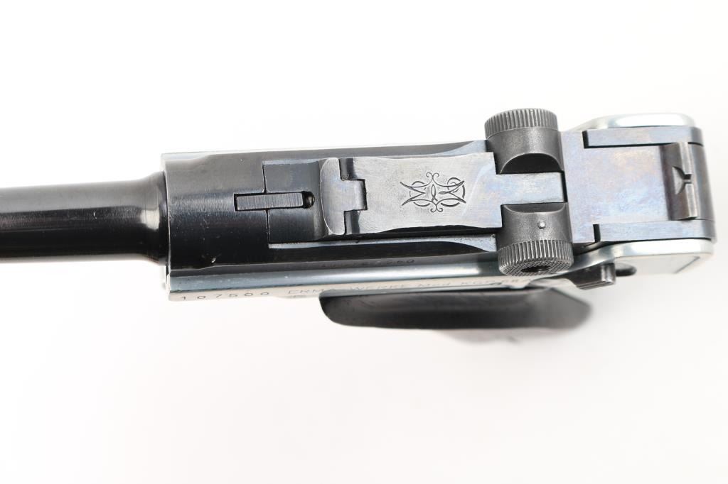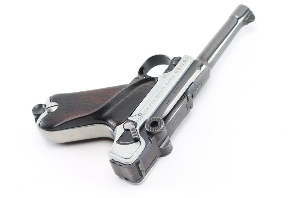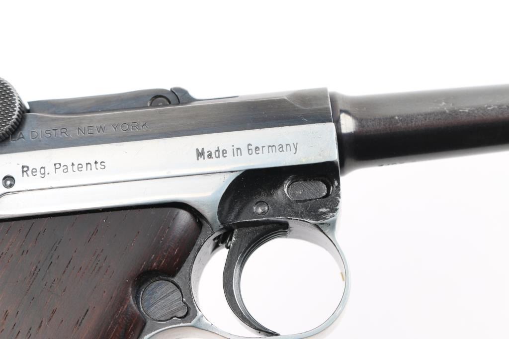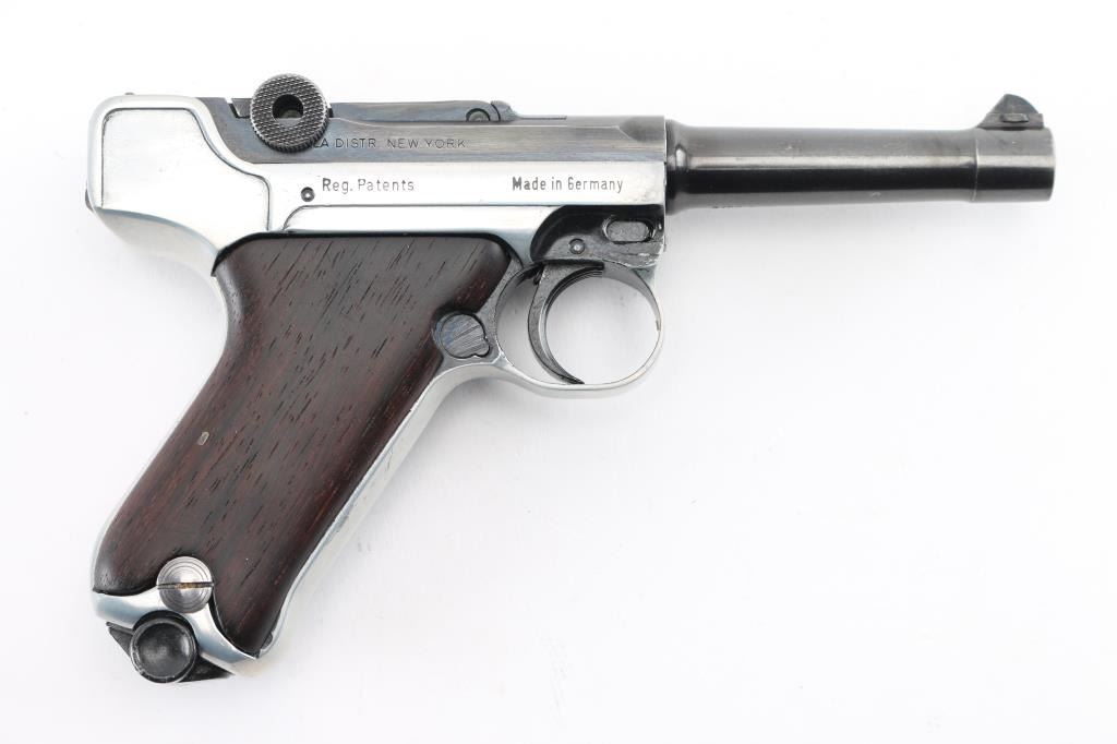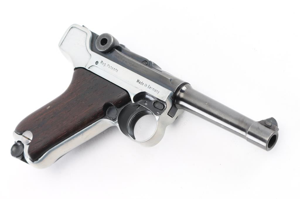 German semiautomatic pistol patterned after the look and function of the original Luger Pistole Parabellum. Features two tone finish (blued with silver color bare metal receiver), wood thumb rest grips, manual safety, magazine safety, loaded chamber indicator, fixed sights, 3.5" barrel. Bore is excellent condition. Receiver appears to be stripped of factory finish, with some black paint remaining in protected areas. Blued parts retain 95% coverage. Grips are excellent. No import marks observed. Includes one magazine, and hard plastic carry case. Condition is NRA Very Good. Modern Firearm