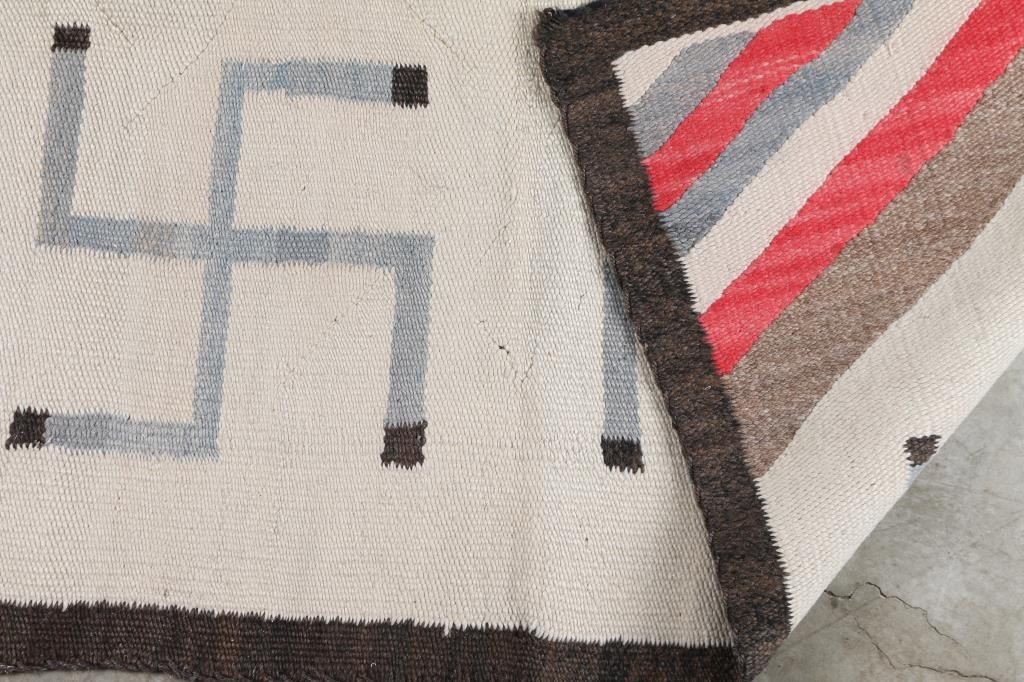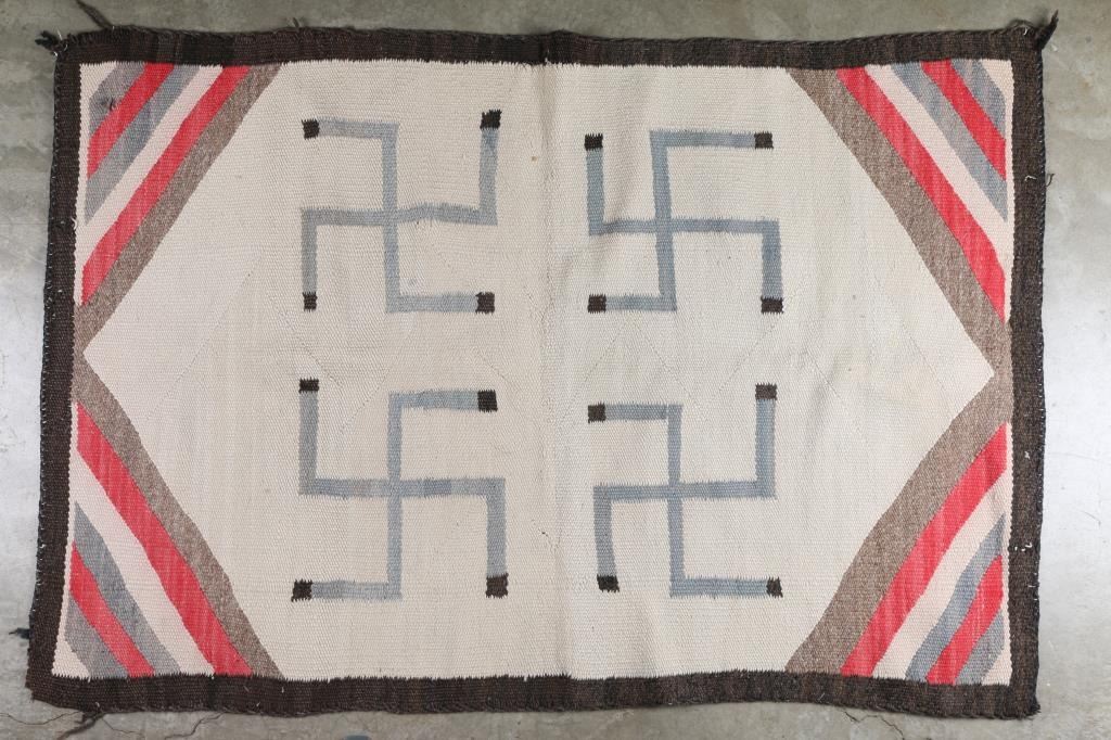 In white, red, black, pattern shows 4 whirling logs with side stripes. Measures 47x32.5. The condition is overall good, two ends are tattered. Shows several lazy lines.