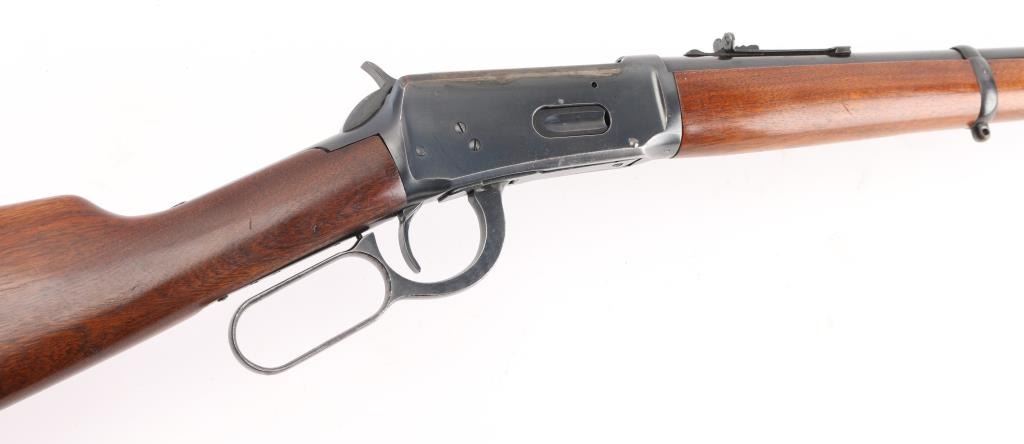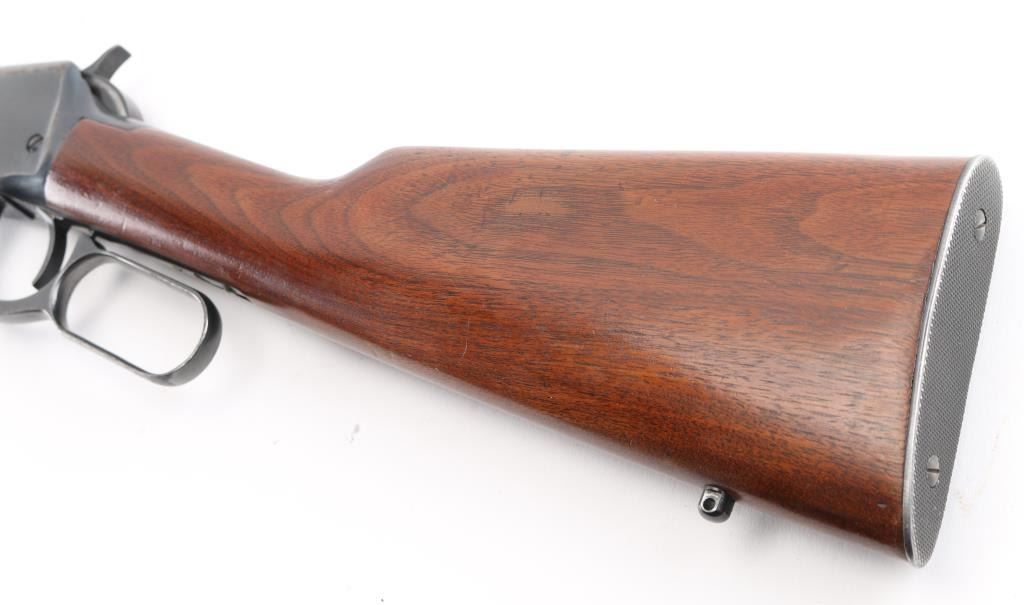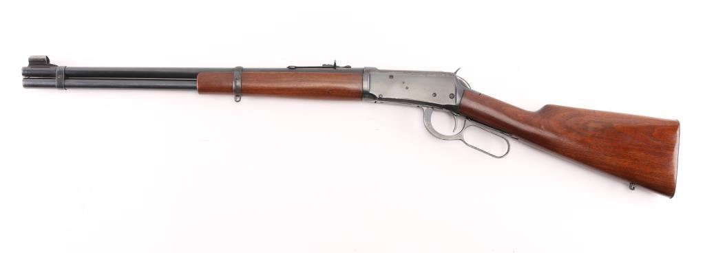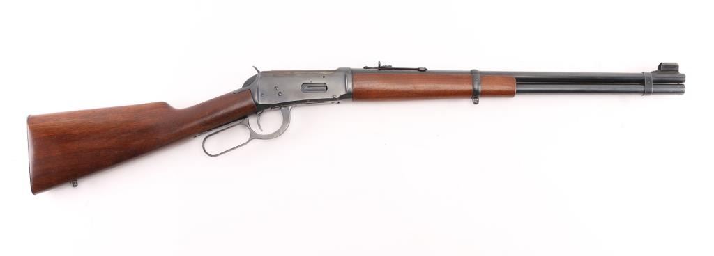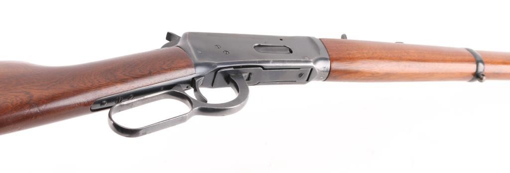 'Pre-64 Eastern Carbine' Lever action repeating rifle manufactured in New Haven, CT circa 1943-48. Features a blued finish, 20" tapered barrel, full-length tube magazine, hooded ramped blade/bead front sight, sporting adjustable rear sight, smooth trigger, serrated hammer spur, two barrel bands, smooth walnut forend and straight grip shoulder stock with checkered steel buttplate, sling swivel studs. Bore is very good condition, bright, strong rifling. Retains 80% finish with edge losses, scratches, handling loss, mostly on the top right receiver. Wood is very good condition with minor dents & scuffs. NRA Condition-Very Good. C&R Firearm.