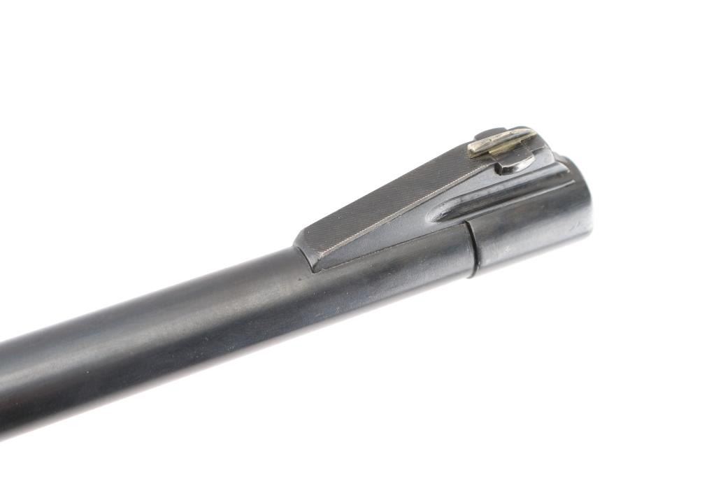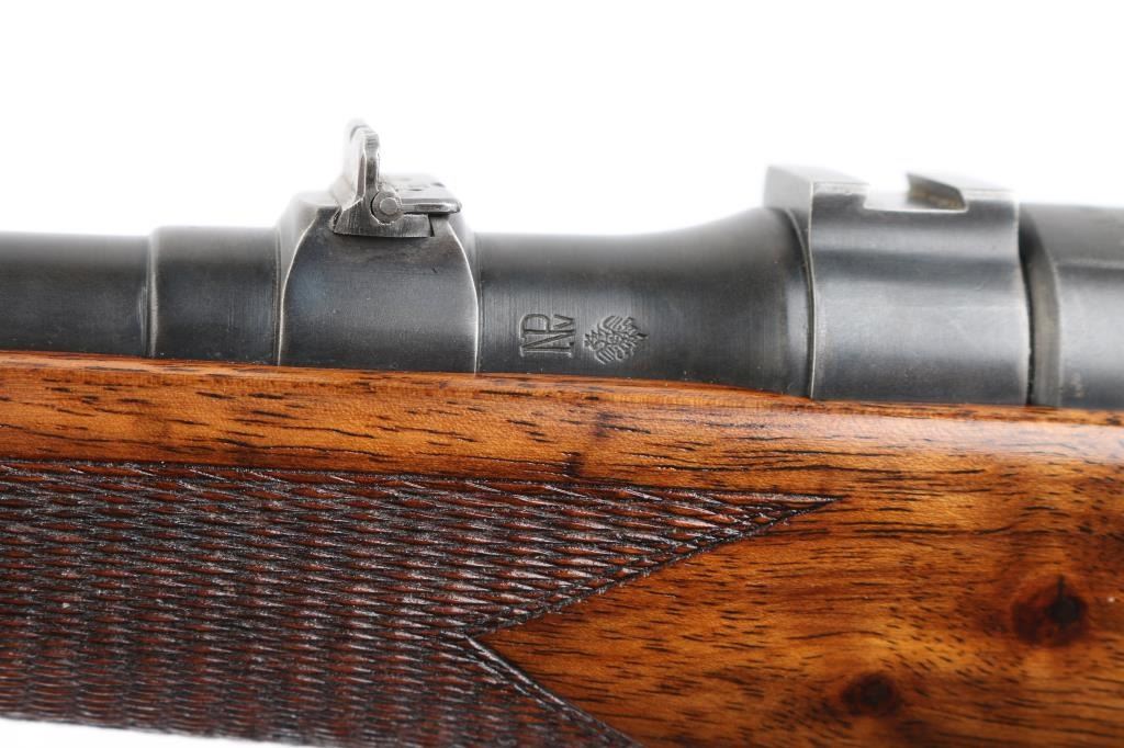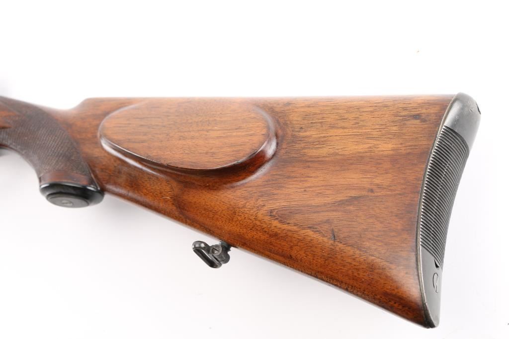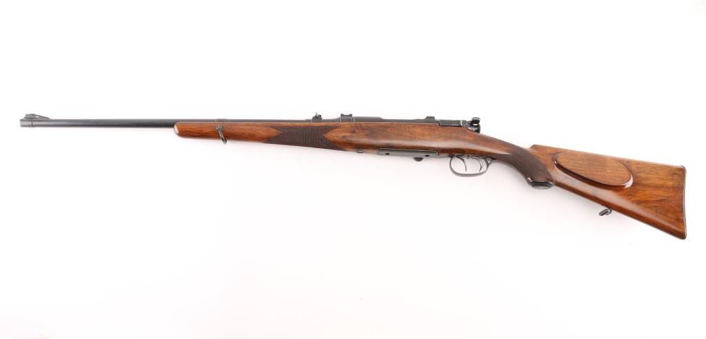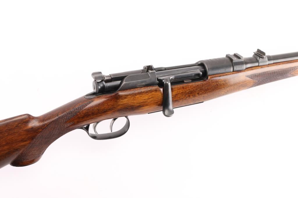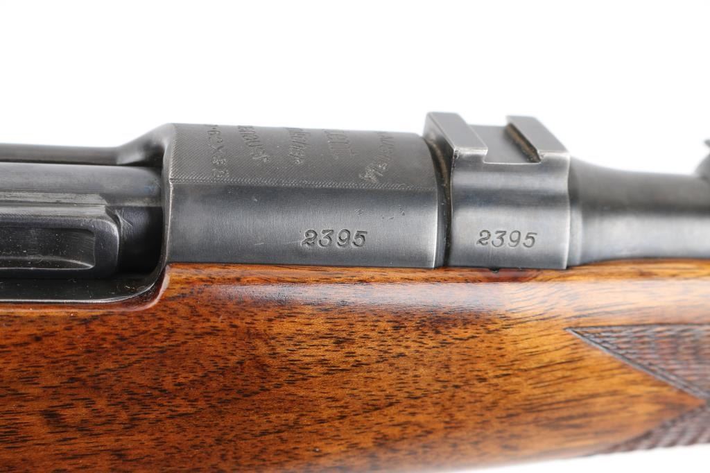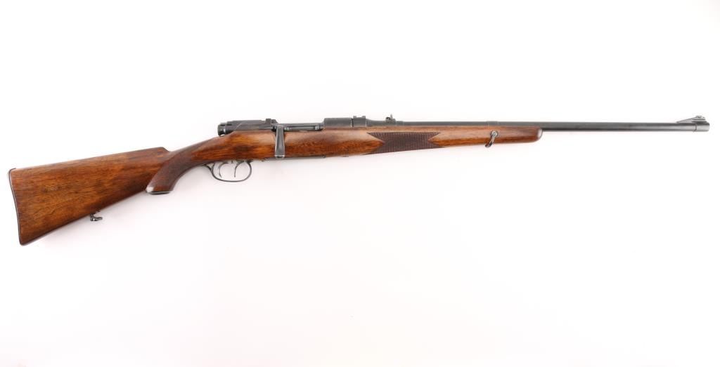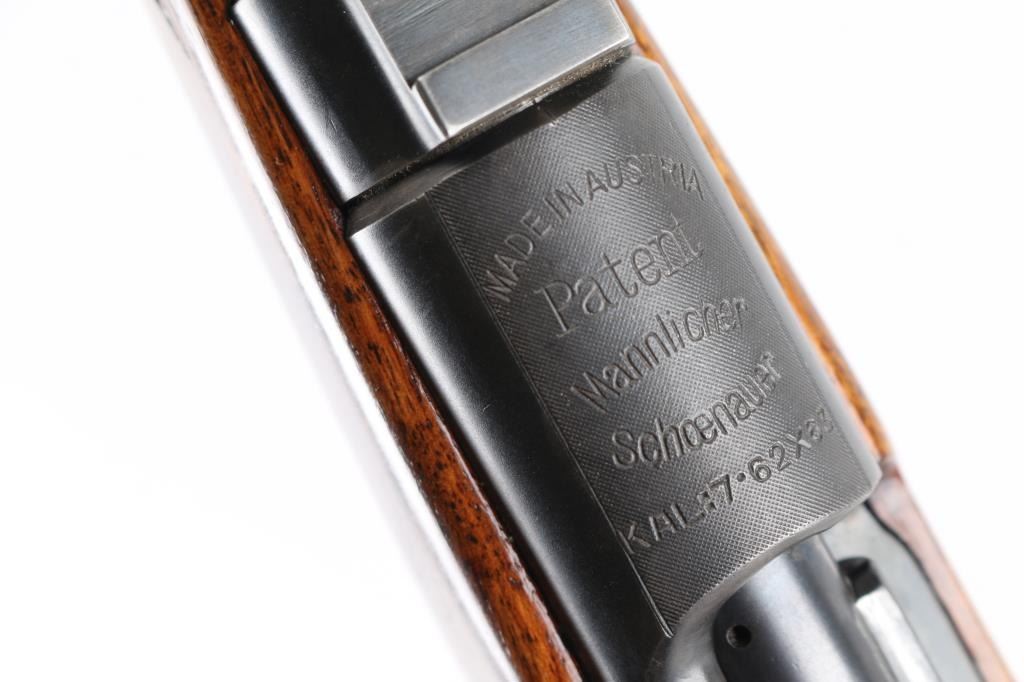 SN: 2395 Austrian bolt action sporting rifle proof dated 1936. Caliber marked as "7.62x63mm", metric designation for 30-06 US Gov't. Features 24" barrel, dovetailed blade front sight in ramp, banded rear sight with one standing and one folding leaf, double set triggers, fixed rotary magazine, "butter knife" bolt handle, manual safety at bolt rear, dovetailed block mounted to barrel at chamber. Stock has checkered panels at wrist and forend, pancake cheek piece, contoured black composition grip cap, sling swivels, ribbed steel buttplate with hinged lid trap (3 compartments, 2 for cartridges, one has a segmented cleaning rod in place). Bore is good to very good condition, bright with a hint of frosting, strong rifling. Retains 85% re-blue with edge losses, handling marks. Markings show minimal erosion, mostly on left side of receiver. Receiver ring markings and anti-glare stippling are absolutely crisp. Stock is very good condition, varnished, appears sanded & refinished at some time with buttplate standing slightly proud at heel. Condition is NRA Very Good+ (as refinished) *** C&R Firearm ***