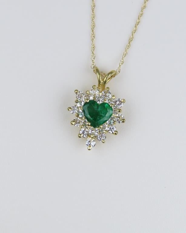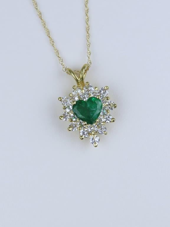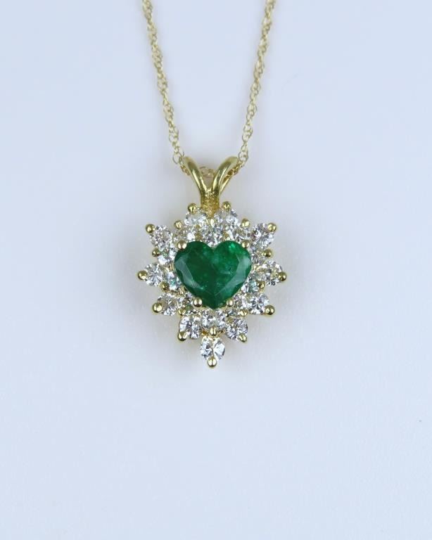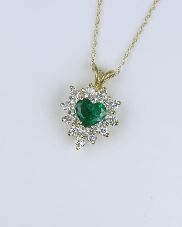 and Diamond Pendant featuring a vivid green Emerald weighing approx. 0.60 carats and framed with 22 round ‘IDEAL’ cut Diamonds weighing approx. 0.80 carats with G-H colors and VS clarity set in a 14 karat yellow gold setting.