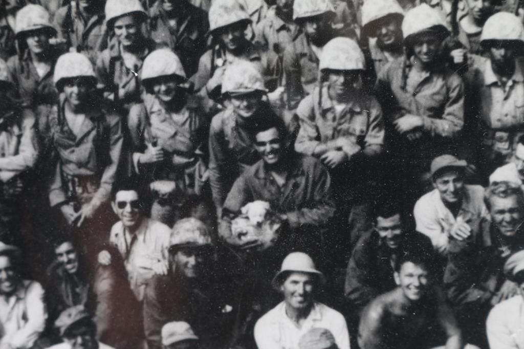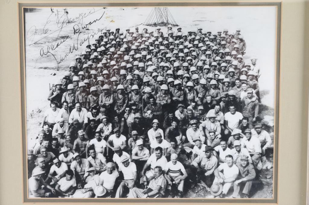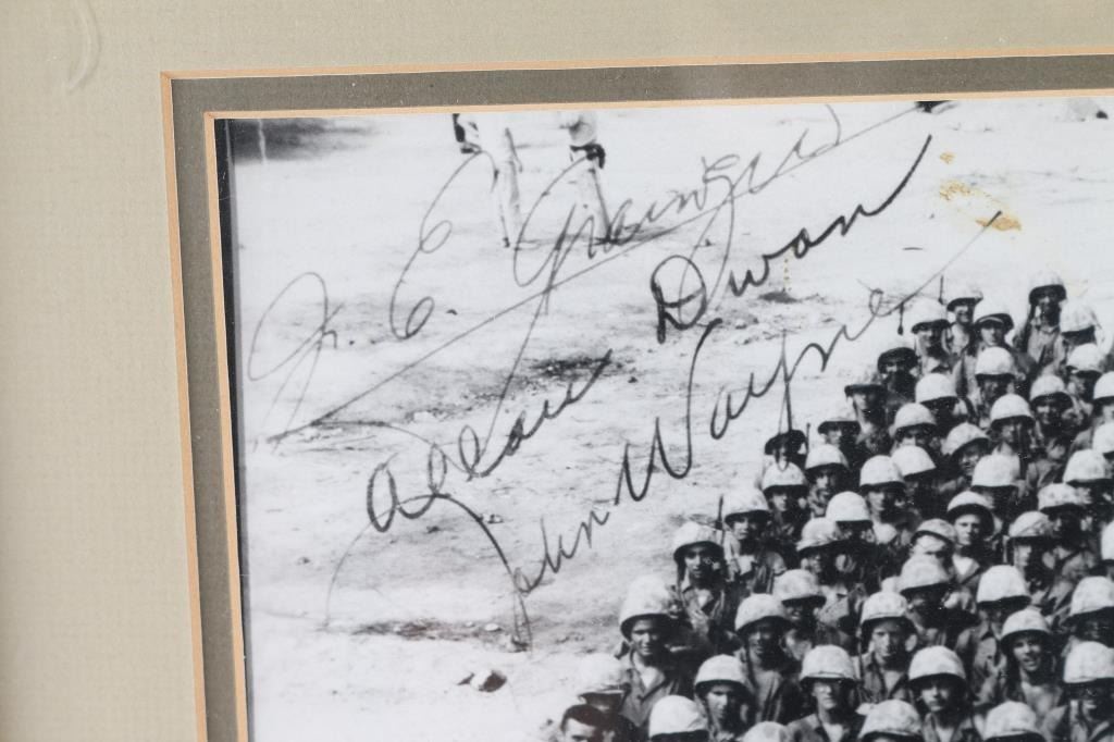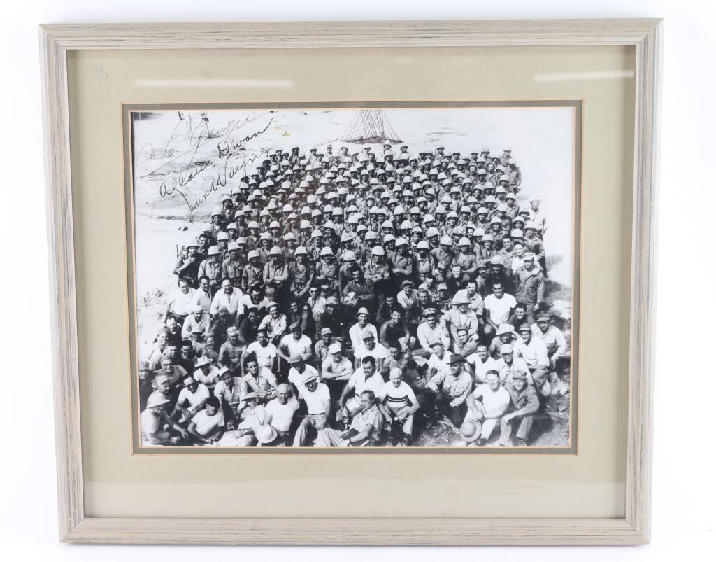 Depicting 1949 photo of cast an crew of the "Sands Of Iwo Jima" Wayne is 4th row up from bottom 7th person in from left. Wearing camo an helmet, just below man holding small white dog. Photo was signed by "John Wayne" "J Edmund Grainger- Producer+ Assistant and Allan Dwan- Director. Note to buyer this is not the original photograph and signatures are NOT ORIGINAL.