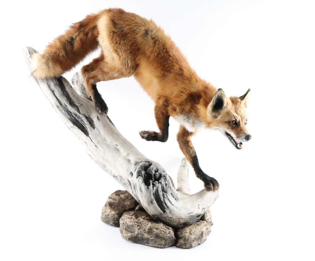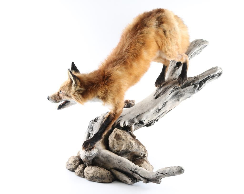 on rock and driftwood base. Measures approx 28" tall x 32" long (tail to nose). Overall very good or better condition. Heavy - large - buyer to arrange pickup.