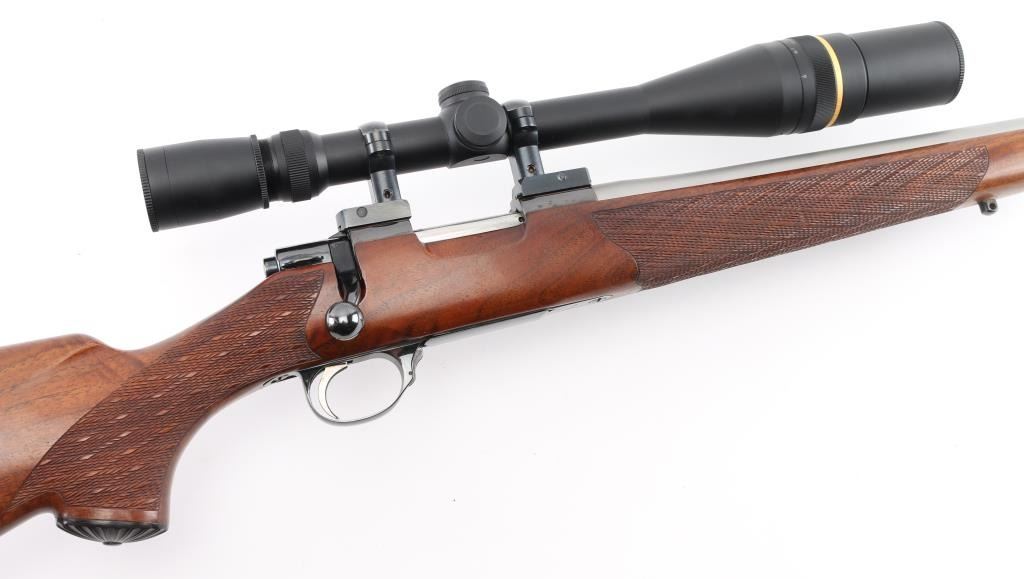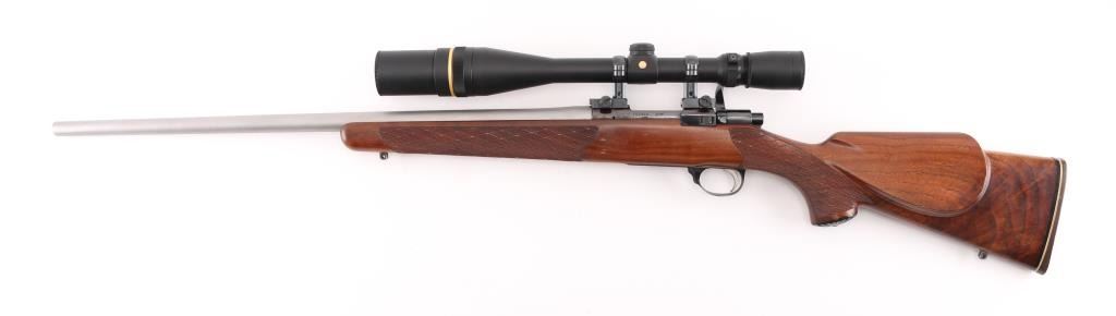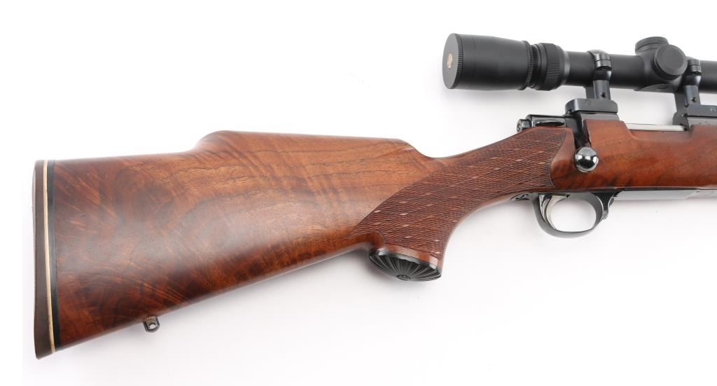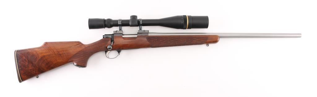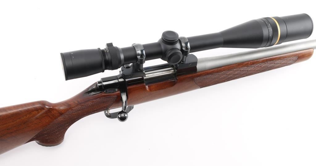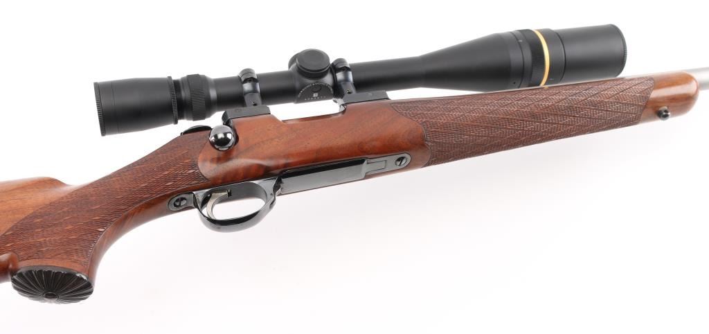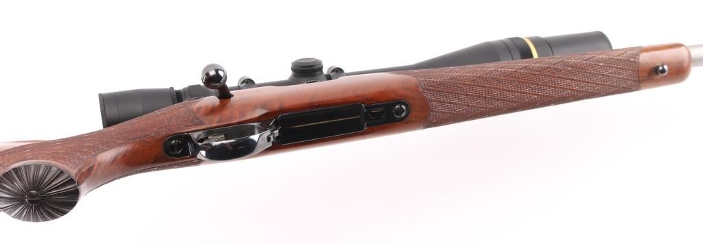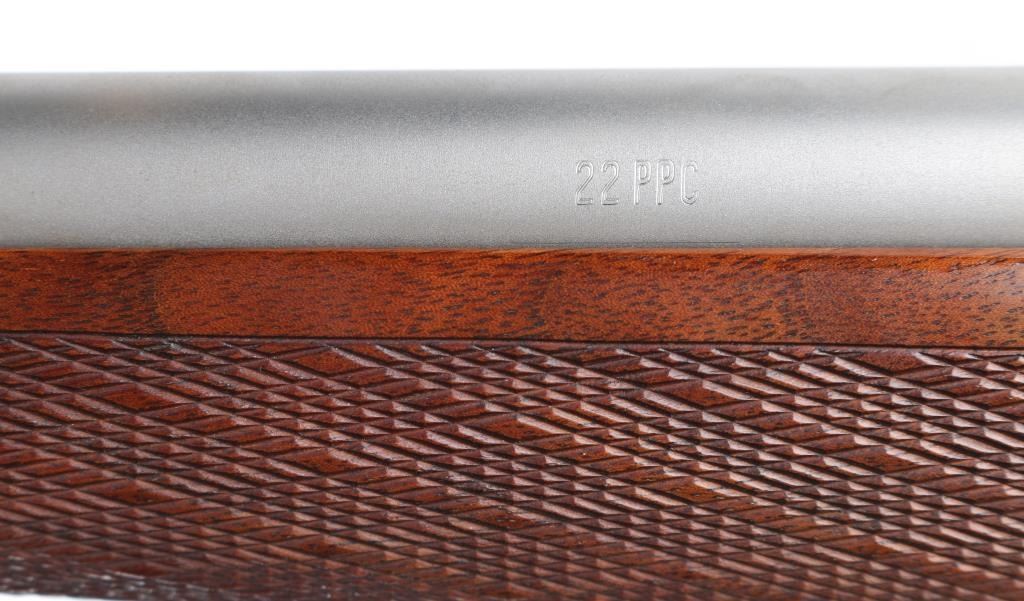 Custom Finnish bolt action rifle features blued finish, wood Monte Carlo stock with right handed cheek piece, white line rubber butt plate with black & white spacers and horn grip cap, checkered panels at wrist & forend, sling swivels, re-barreled with a 24" matte stainless chambered in .22 PPC, hinged floorplate, manual safety, serrated trigger. Bore is excellent/bright. Metal finish is near excellent with a couple of very minor scratches, wood is excellent, action is smooth/tight. Mounts a Leupold 20x, 16x, 12x, & 8x6.5x adjustable scope with adjustable objective, fine crosshair & dot reticle, sun shade. No importer markings observed. Comes with approx. 50 unloaded brass cases. NRA Condition-Excellent. Modern firearm.