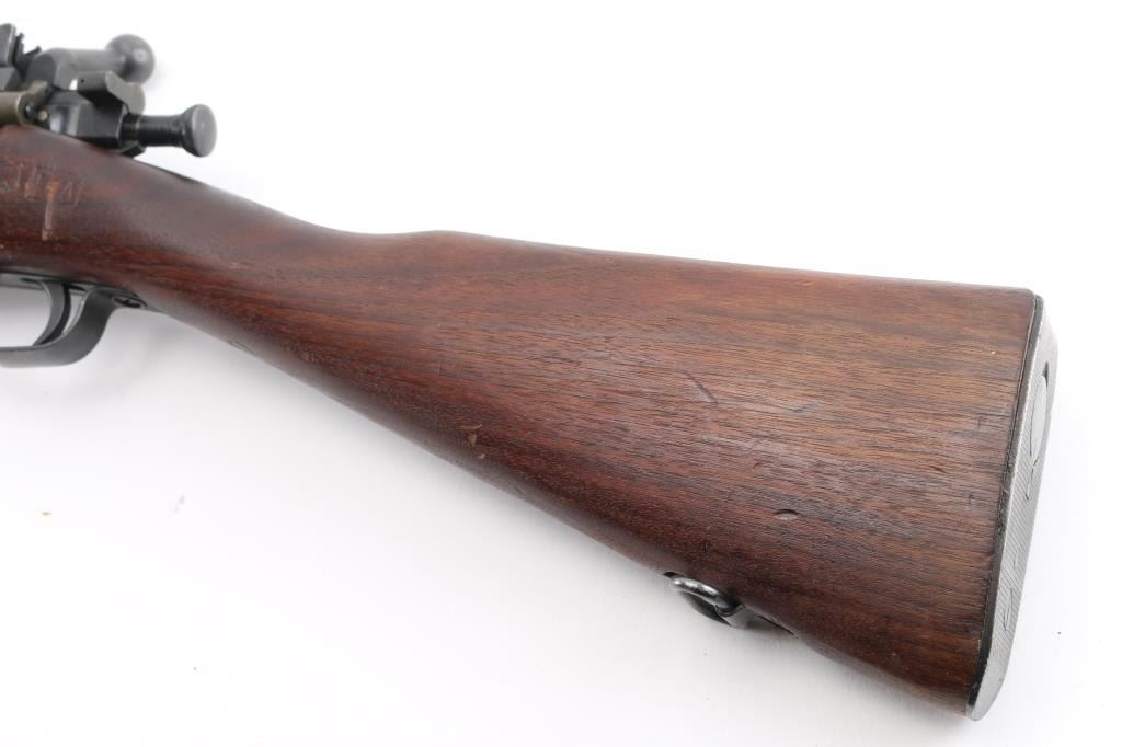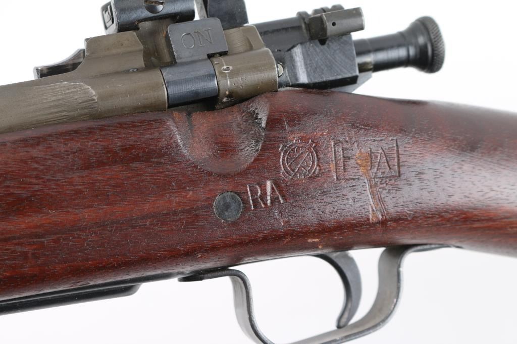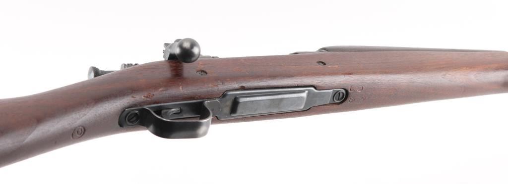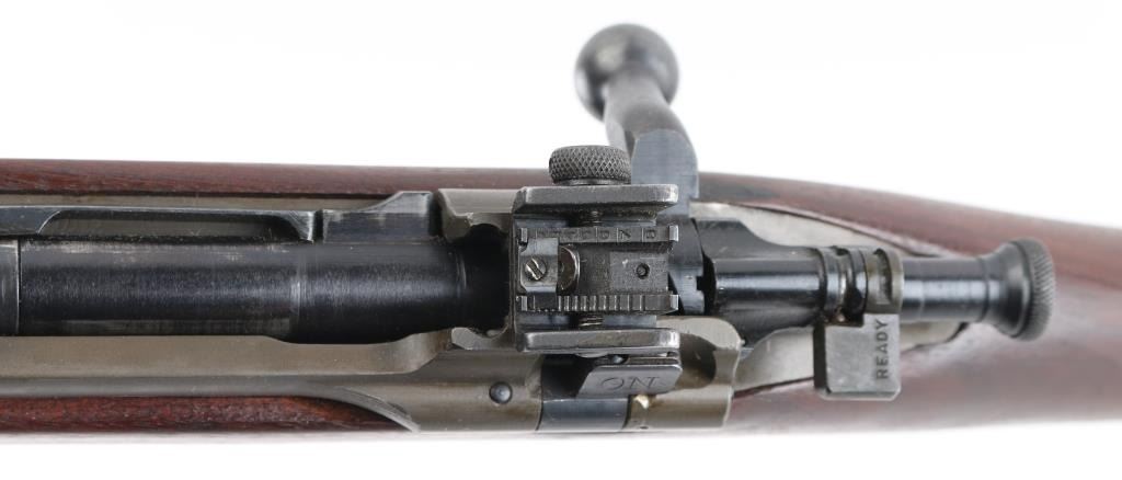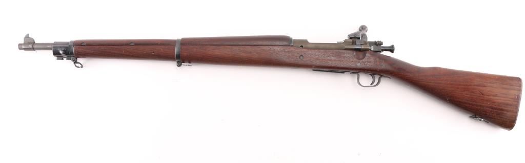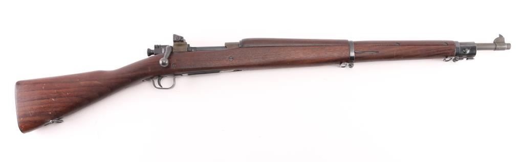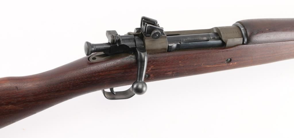 U.S WWII era military bolt action rifle manufactured circa 1943. Features blue/parkerized finish, walnut shoulder stock, walnut handguard, 24" barrel, blade front sight , (Stamped "R & "C." with flaming bomb") adjustable peep rear sight mounted to receiver, bent bolt handle stamped R, bolt shroud stamped "R", manual safety, magazine cut-off switch, sling swivels, stacking swivel, butt trap with hinged cover, checkered flat steel buttplate. Bottom metal and bands are stamped. Bore is excellent/bright .Parkerized receiver, barrel. "RA, flaming bomb, 9-43" marked barrel. Stock is stamped with the following, the RA - Remington Arms, crossed cannons - Defense Acceptance Seal, FJA - Frank J Atwood (military inspector). The markings on the bottom of the stock are factory inspector markings. The P on the grip is the proof marking.. Retains 90% finish. Stock is very good/sound with minor scratches/dings. Action is crisp/tight. NRA Condition-Very Good. C&R Firearm.