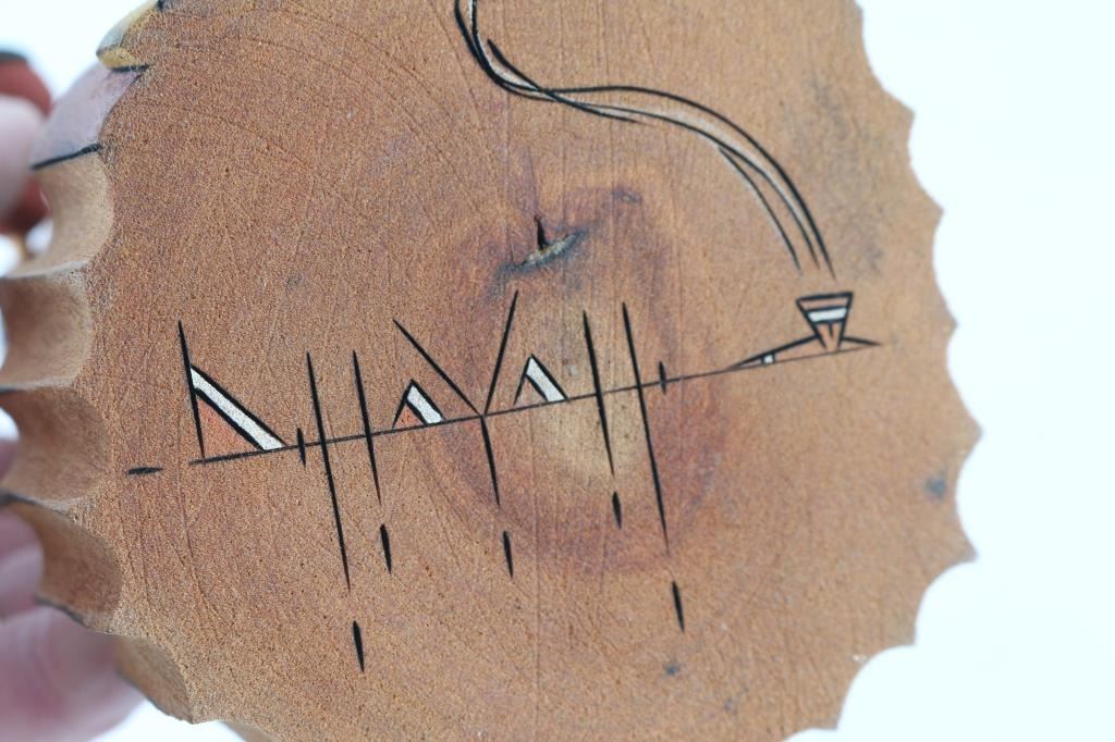 By unknown artist, depicting two figure mud heads, with hand carved wood base. Measures 10x5.5.