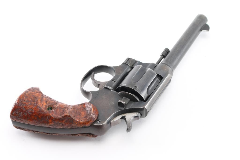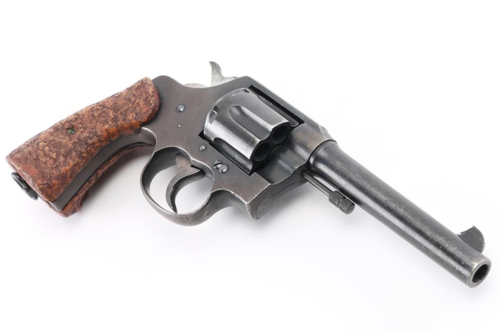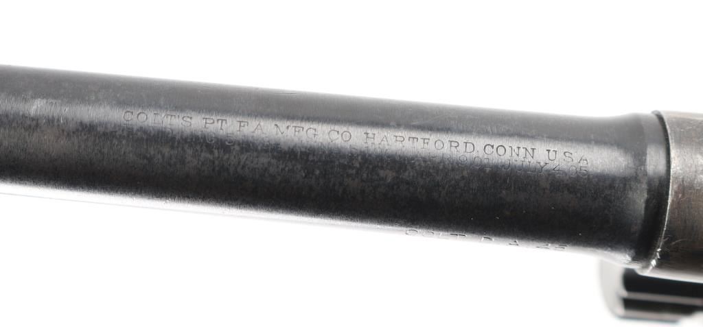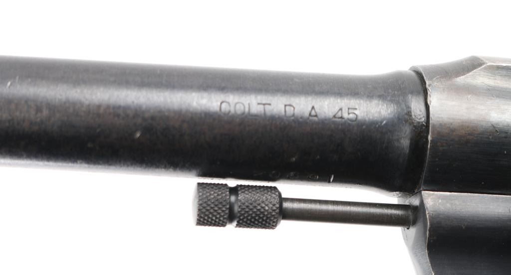 U.S. Military large frame double-action service revolver chambered in .45 Automatic, manufactured in Hartford, CT circa 1919. Features a blued finish, 5.5" round tapered barrel, blade front sight, rear of blade painted white,"u" notched rear sight, fluted six-shot swing-out cylinder, non-shrouded ejector rod, smooth trigger, checkered hammer spur, steel frame with lanyard ring on the butt, and after market composite finger grooved grips. Markings: Frame - partial “GHS” monogram inside a circle, “U.S./ARMY/MODEL/1917" & "No/37/196". Barrel - "UNITED STATES PROPERTY", "COLT'S PT FA. MFG. CO. HARTFORD CT U.S.A./PATD AUG 5.1884 JUNE 5 1900 JULY 4 1905" a little faint & "COLT D.A.45". Matching serial numbers. Revolver retains approximately 60% of its blued finish showing holster/handling wear, thinning. Action is sound with a tight lock-up, the bore appears excellent but dirty, the markings are fair. With the proper grips this would be a nice 1917. Condition is NRA Good. C&R Firearm.