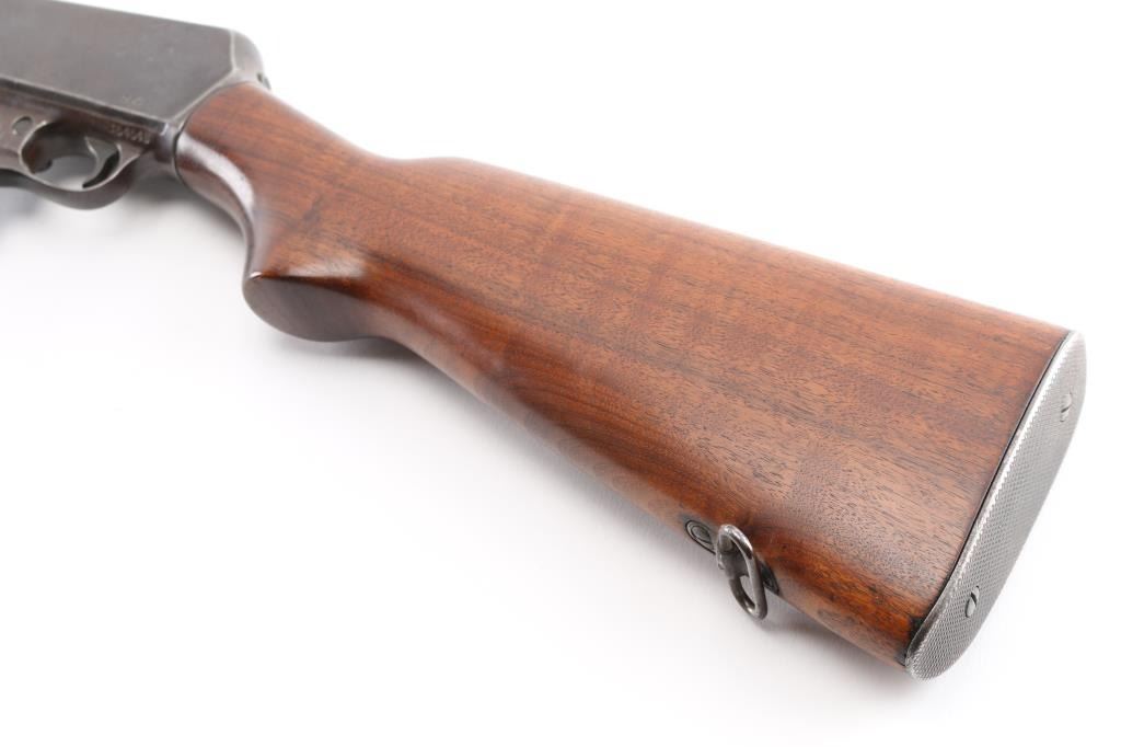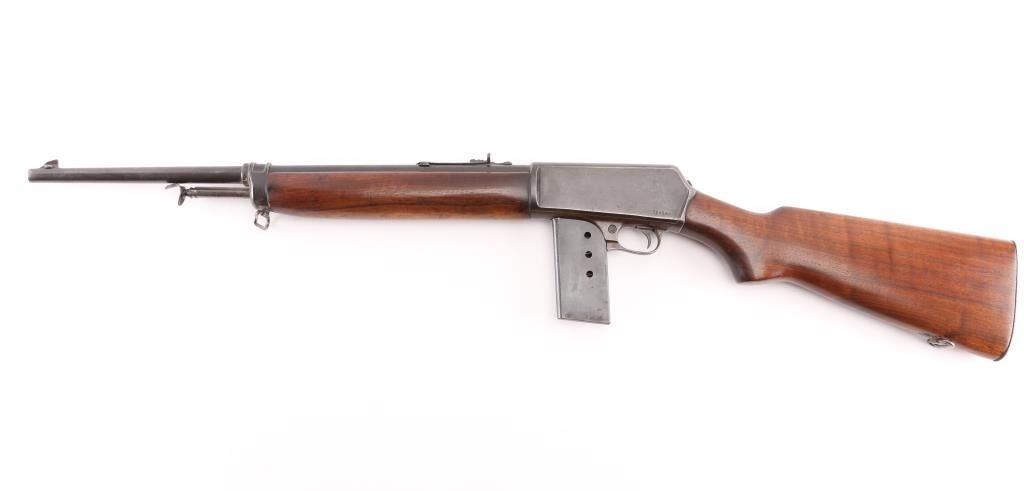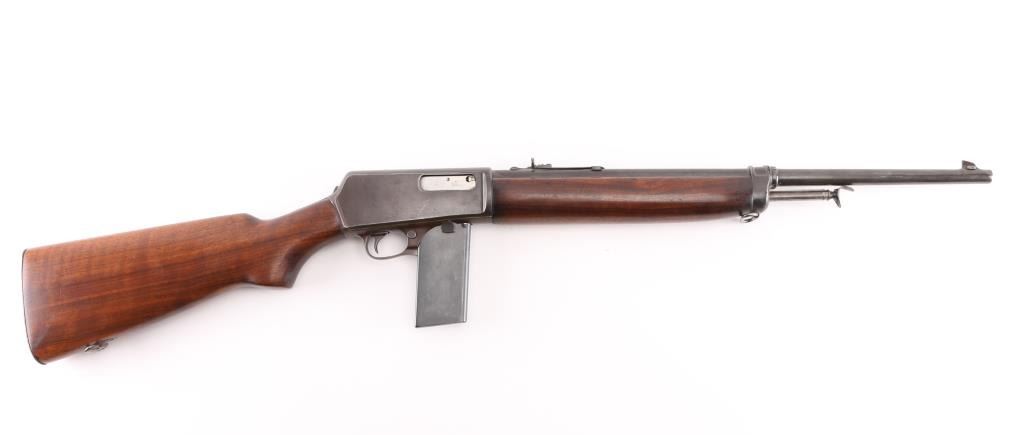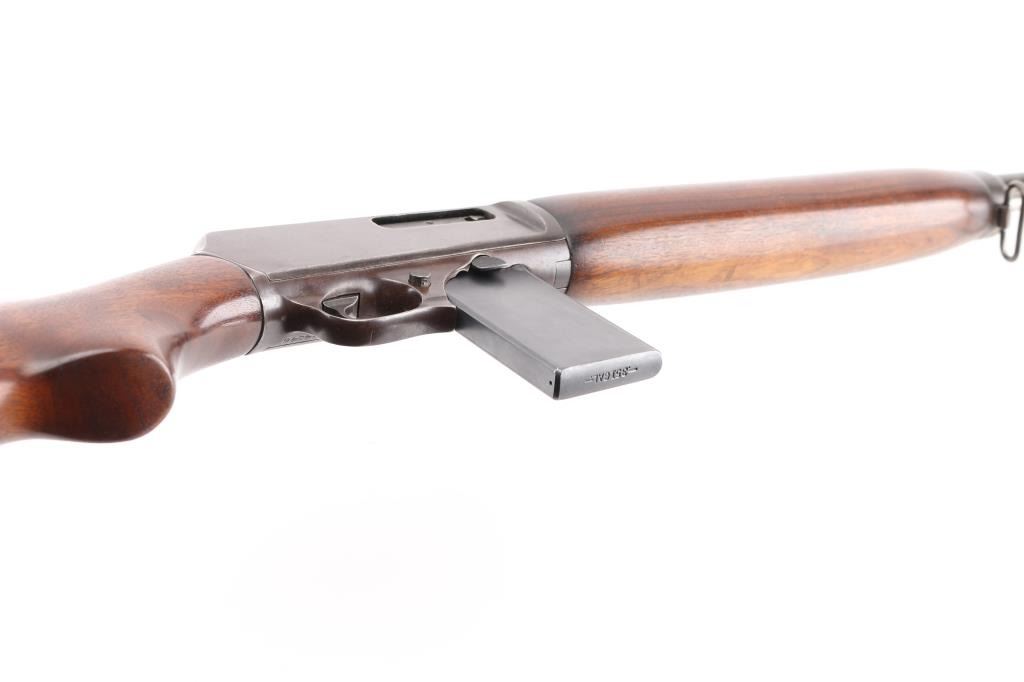 Post-war magazine fed semi-automatic police rifle chambered in .351 Winchester Self-Loading, manufactured circa 1953. Features a blued finish, 20" round barrel, dovetailed blade front sight, semi-buckhorn adjustable rear sporting sight, 15 round detachable magazine, take-down receiver, smooth trigger, push button safety, sling swivels, smooth walnut beavertail forend and pistol grip shoulder stock, checkered steel buttplate. Serial numbers match on trigger guard and receiver. Bore is very good condition. Rifle retains approximately 60% blued finish, much fading to brown, with scattered patina or small pits, handling marks, scratches & losses. Wood stocks are very good. Includes one good condition 15 rd magazine. Left side of receiver engraved "EUGENE B. LEWIS" in block letter, approx 1/8" tall. Letter "I" has been added to serial number as a prefix, Winchester serial numbers were only numbers for this model. Condition is near NRA Very Good *** C&R Firearm ***