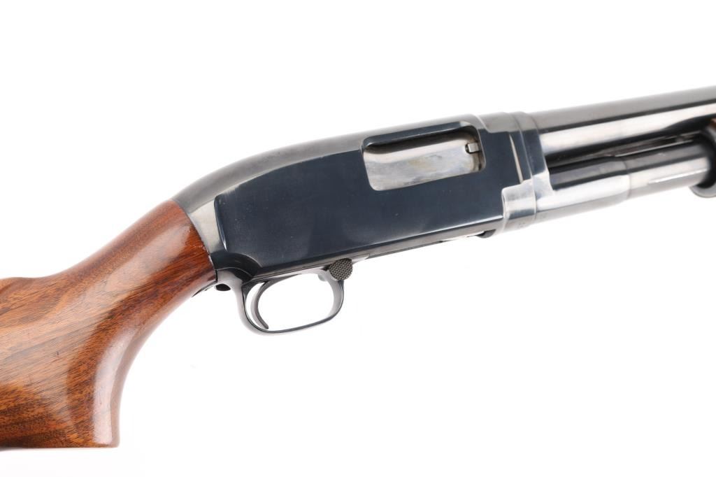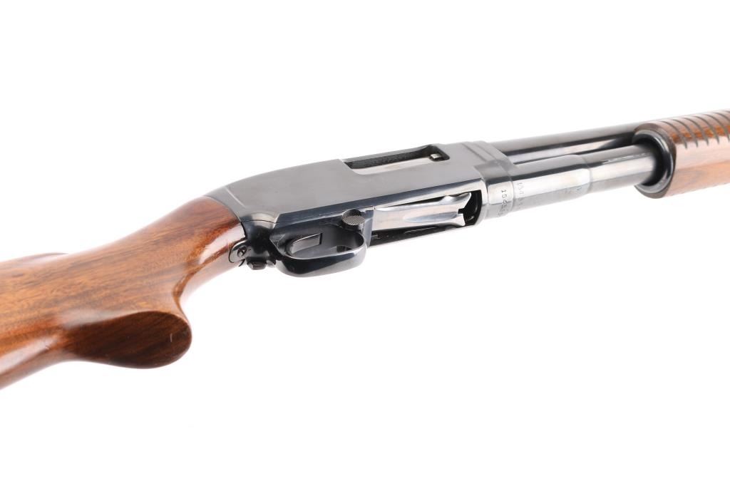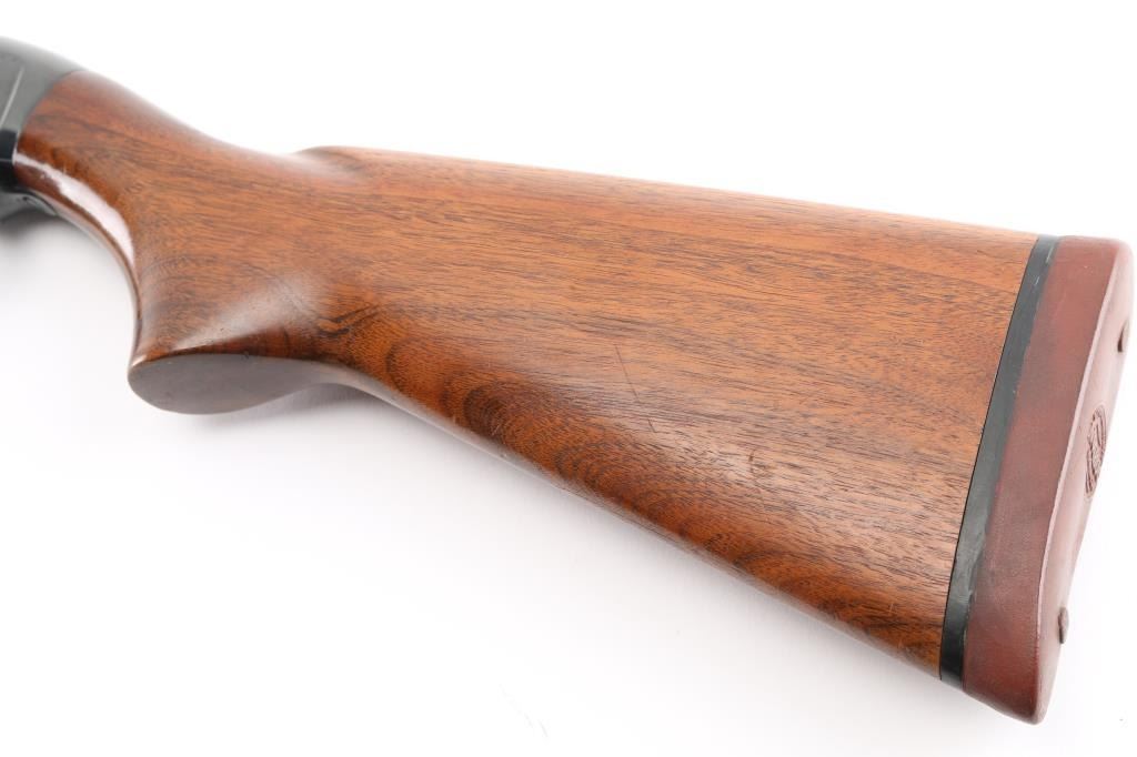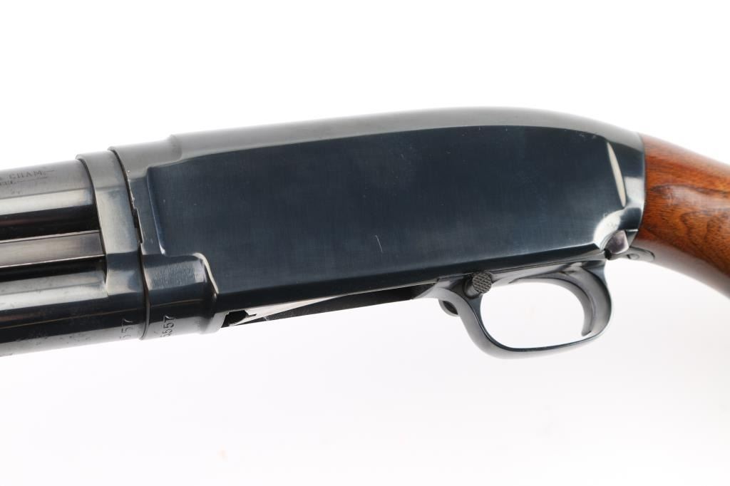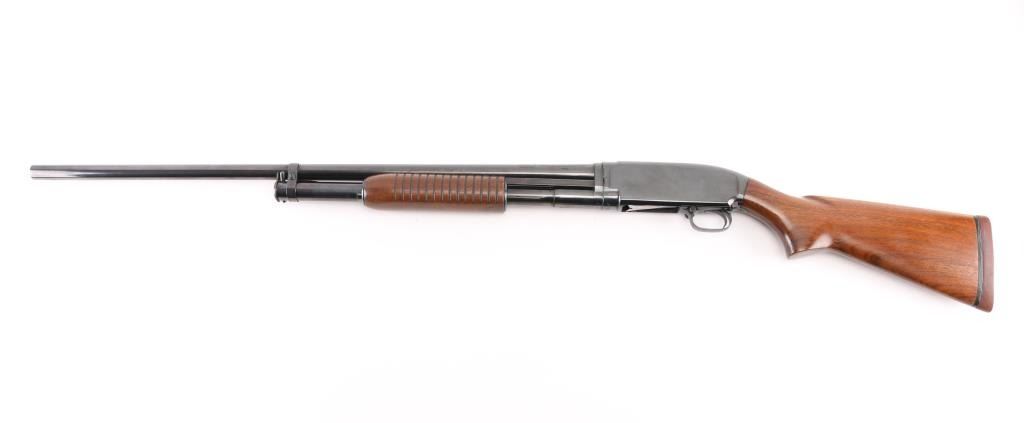 Take down pump action shotgun manufactured circa 1955. Features 30" round barrel, barrel marked "FULL" choke, steel front bead, blued finish, walnut stock & pump handle, lined pump handle, factory plastic butt plate. (13 1/2" LOP), push button safety. Bore appears excellent/bright, but needs cleaning. Retains 95% blue with handling marks & small scratches, minor rubbing wear where pump handle slides, light muzzle wear. Wood is very good condition with dents and small scrapes. Numbers match on receiver & extension. Markings are crisp. Condition is NRA Very Good. C&R Firearm.