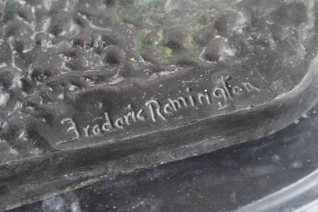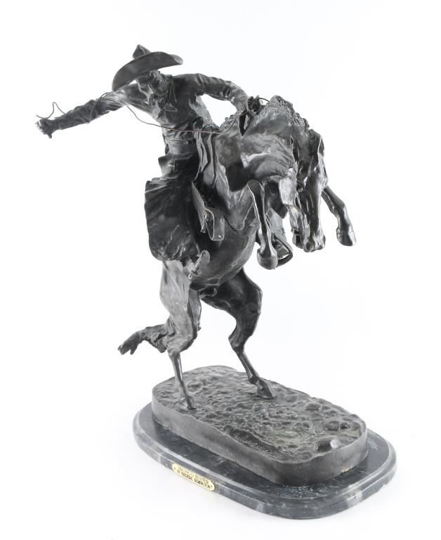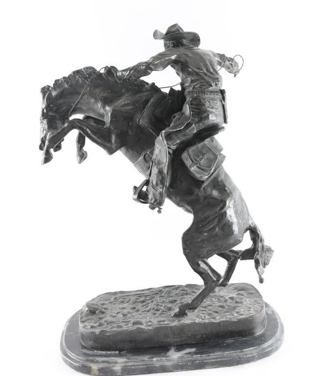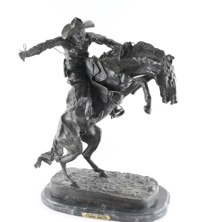 By famous cowboy artist Frederic Remington, entitled "Bronco Buster" signed on base, mounted on granite base. Measures 23x19" in good condition.
