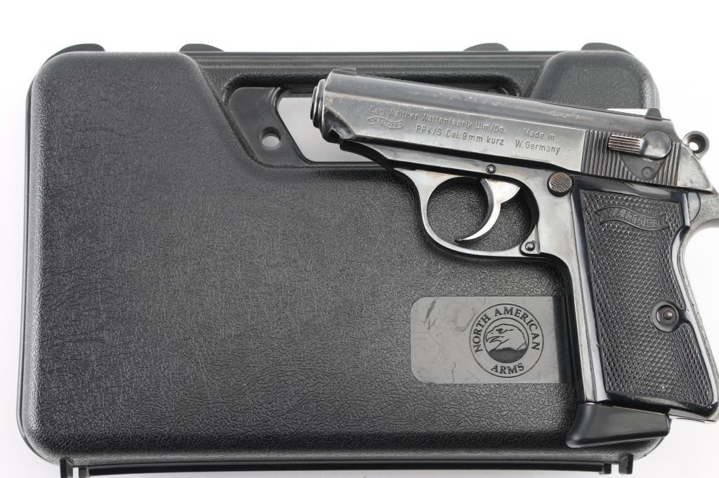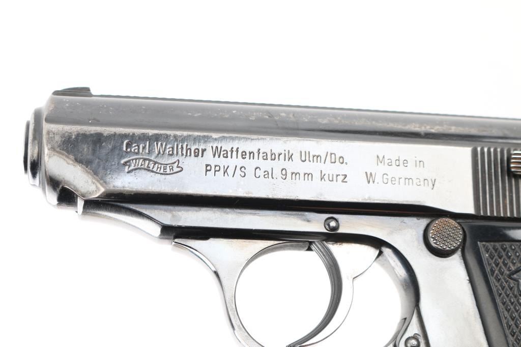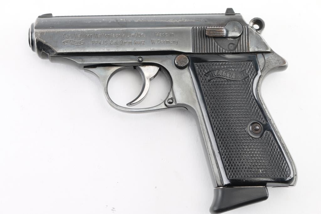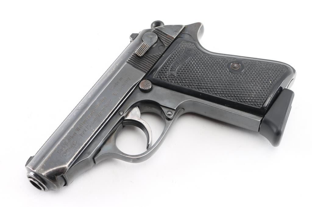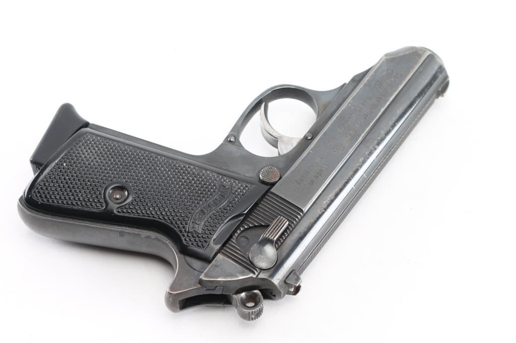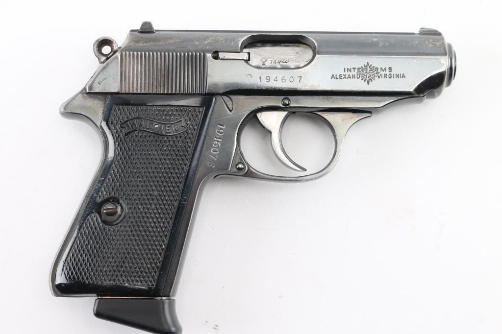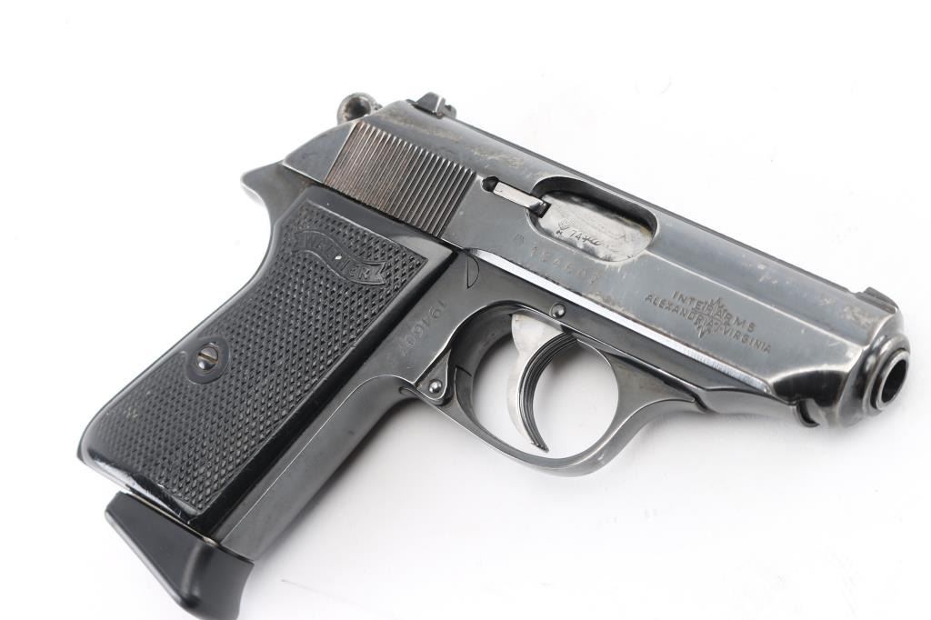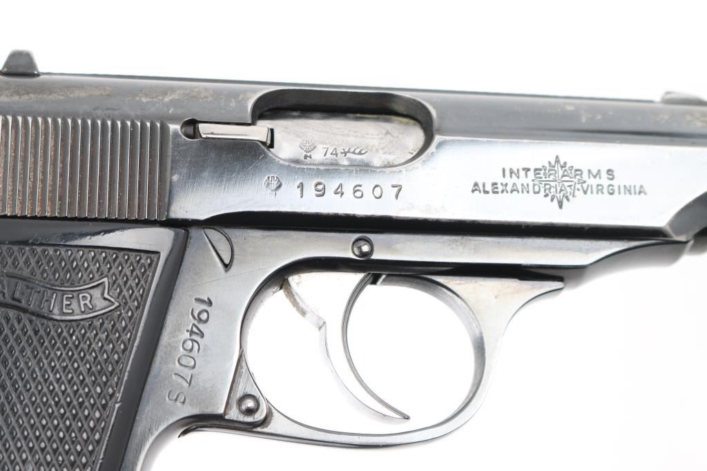 Semiautomatic compact pistol manufactured in West Germany, dated 1974, imported by Interarms, Alexandria VA. Features blued finish, double action trigger, 3.3" barrel, fixed front sight with white dot, dovetailed rear sight with square notch & white bar, serrated trigger, serrated round hammer spur, thumb safety/decocker on the left side of the slide, loaded chamber indicator on the rear of the slide, push button magazine release, original checkered black plastic grips with molded Walther banners. Bore is excellent/bright. Retains 85% finish with handling marks, edge wear, scratches, mostly on the slide. Grips are very good. Includes the original factory hard plastic box, total of (3) magazines (two finger rest type, one flat bottom). Magazines are two 7 rd Walther factory, and one Italian made 8 rd. Condition is NRA Very Good. Modern Firearm.