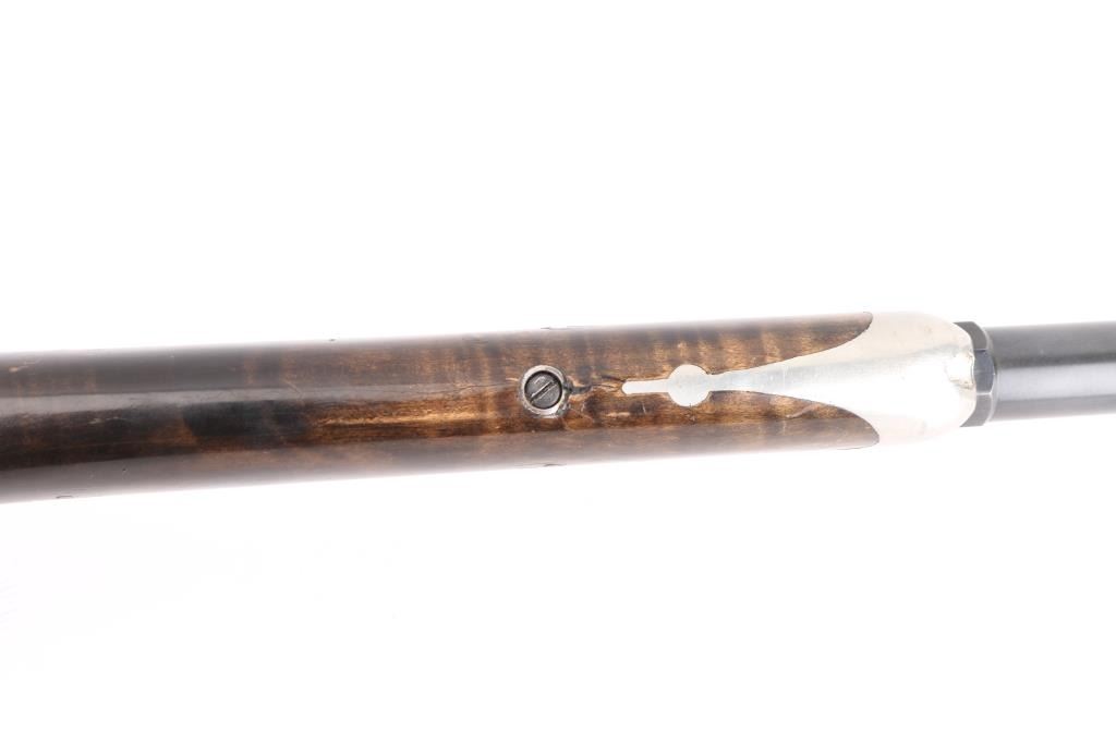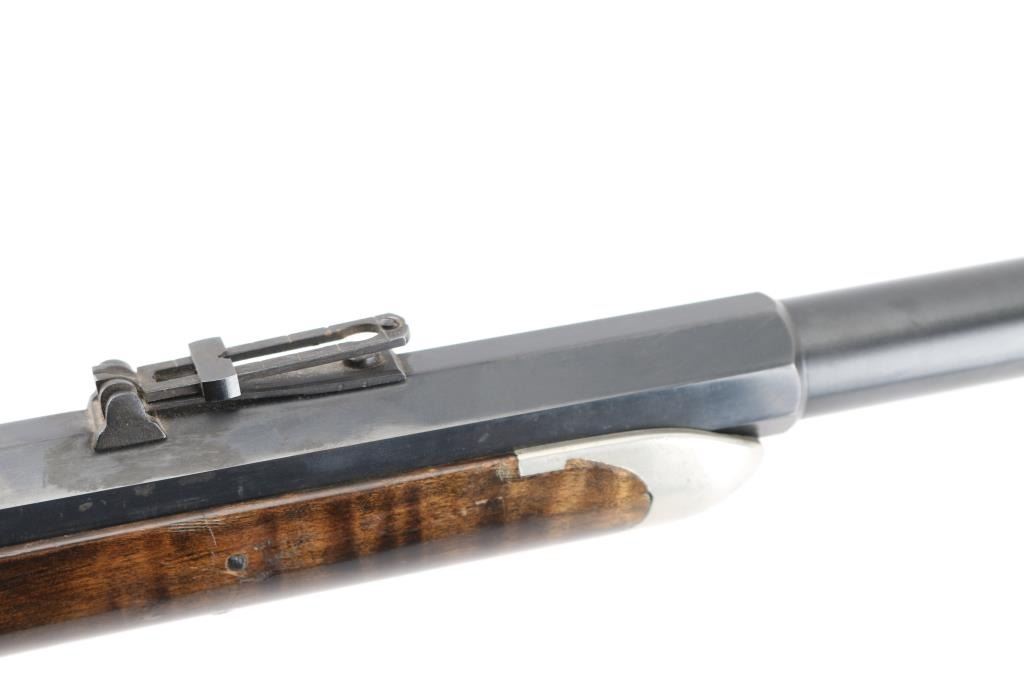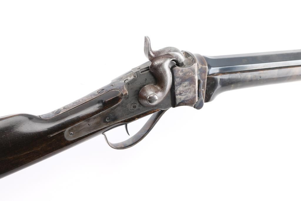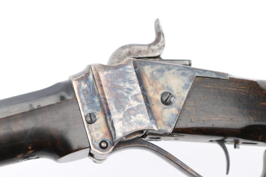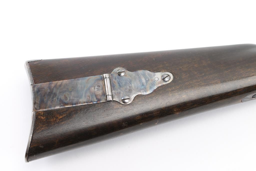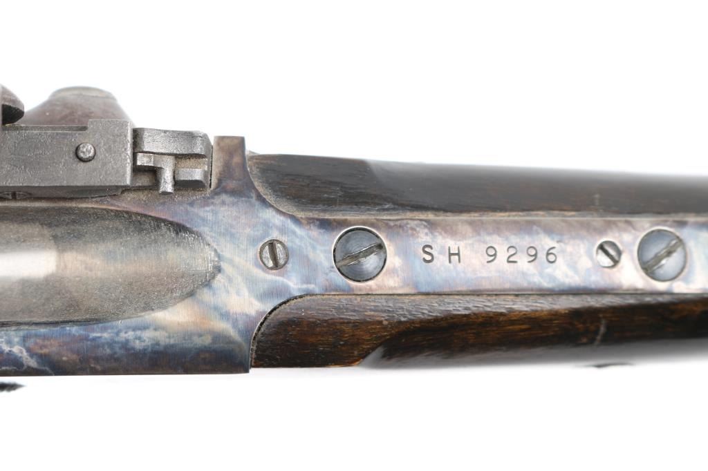 Italian reproduction of a straight breech Sharps percussion sporting rifle, approx 54 cal. Markings are mostly scrubbed, with proof marks retained on sides of receiver. Proof date 1997. Features blued & case colored finish, smooth wood forend with nicely inlet silver nose cap, straight wristed smooth wood shoulder stock with smooth metal buttplate, formerly double set triggers with the rear set trigger now removed, 27" half round half octagon barrel, blade front & folding ladder rear sights, patch box in butt. Bore is very good to excellent. Retains 90% finish, with evidence of re-blue (rounded corners on octagon flats, no barrel markings). Case colors are very good, showing gold colors and dark blues. Some pitting on hammer from firing black powder. Wood is very good, appears stained (lighter color shows on sharp edges and in scratches) with scratches and some dents. Condition is NRA Very Good+ (as modified) *** "Antique" Firearm ***