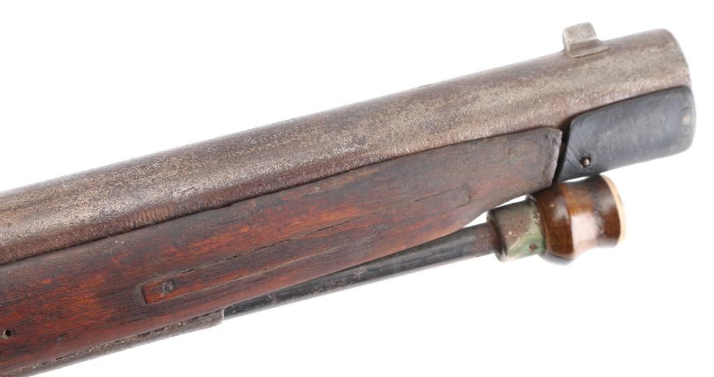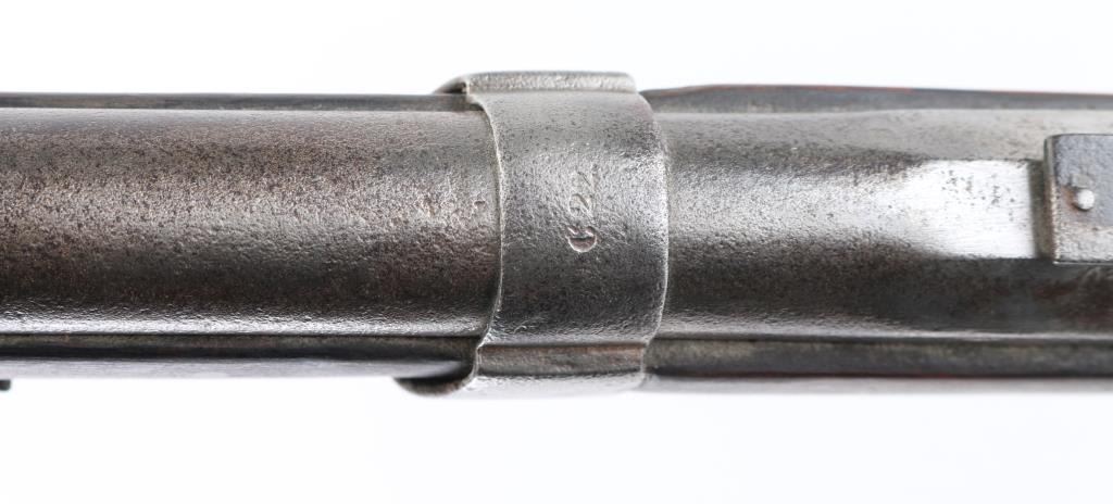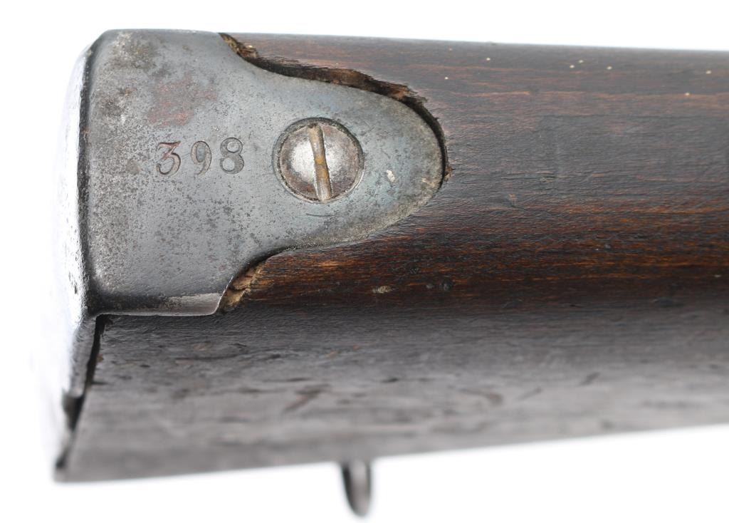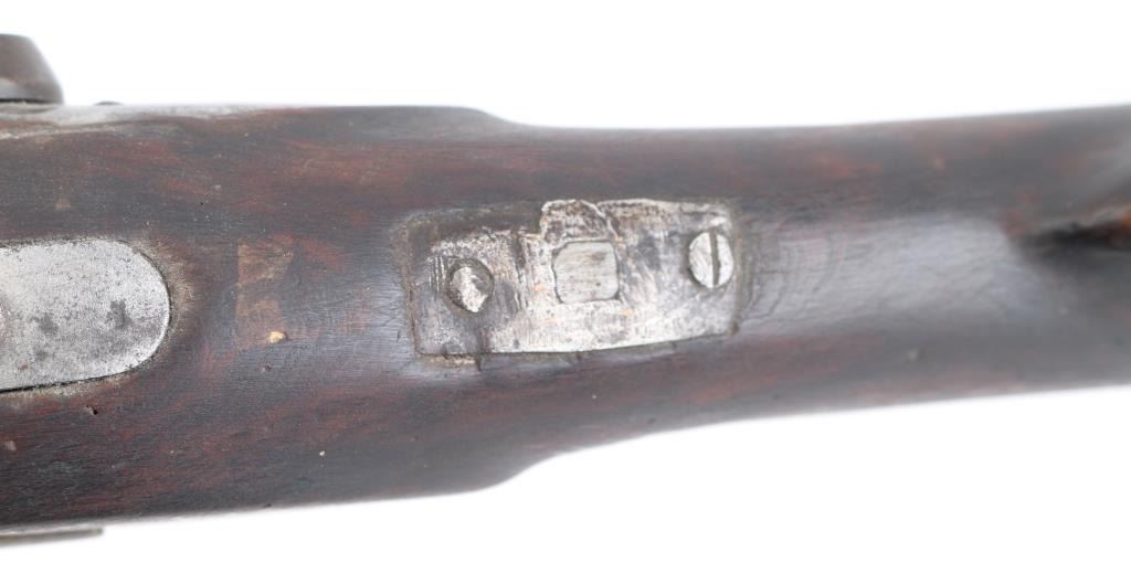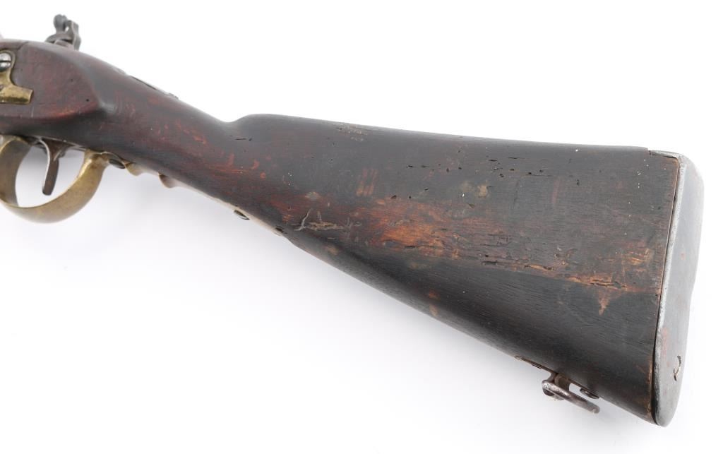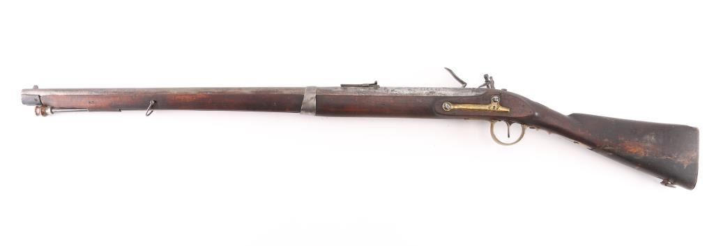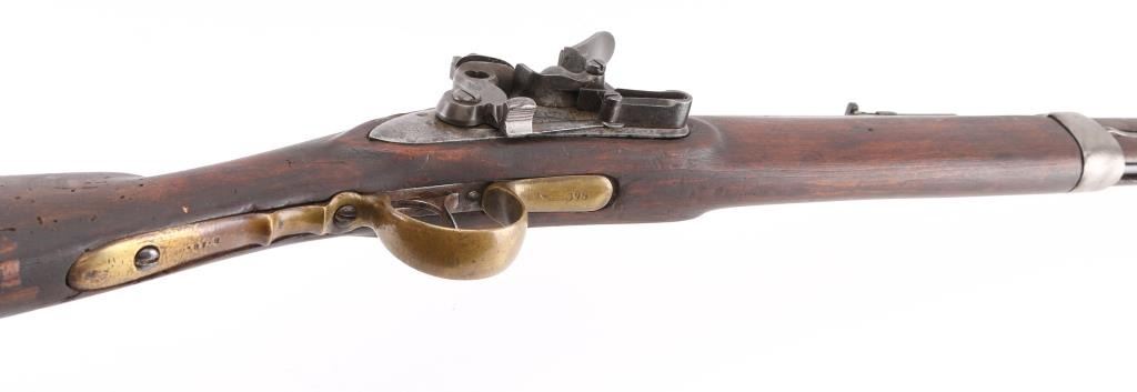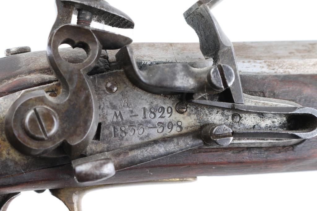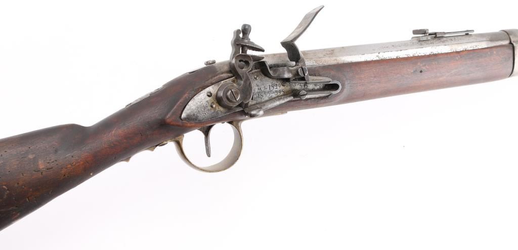 Antique smooth bore musket. Features cleaned metal, brass triggerguard and serpentine, other fittings are iron, approx 32" barrel, ramrod, sling swivels, blade front & notch rear sights. Rear sight appears to have range adjustments made by moving a brass slider, with rear sight acting similar to a "V" spring. Bore is fair, dark and showing signs of use with black powder. Lock appears functional, has manual safety lever, no flint provided. Metal shows lots of bare metal, much light pitting throughout. Wood is very good, repair splice across much of butt at toe, dented and scratched, appears to possibly be more recent, an older replacement stock, still with much age. Markings include: "C.22." on serpentine, "5iC.C.22" on barrel, "M-1829 1833-398" on lock. Condition is NRA Very Good *** Antique Firearm ***