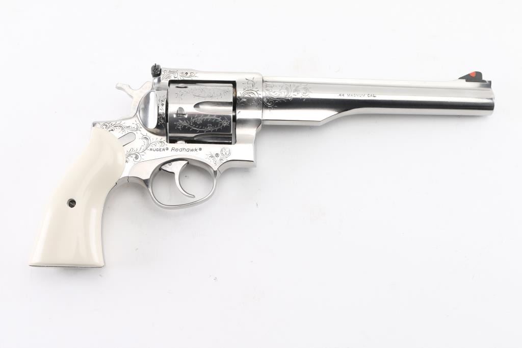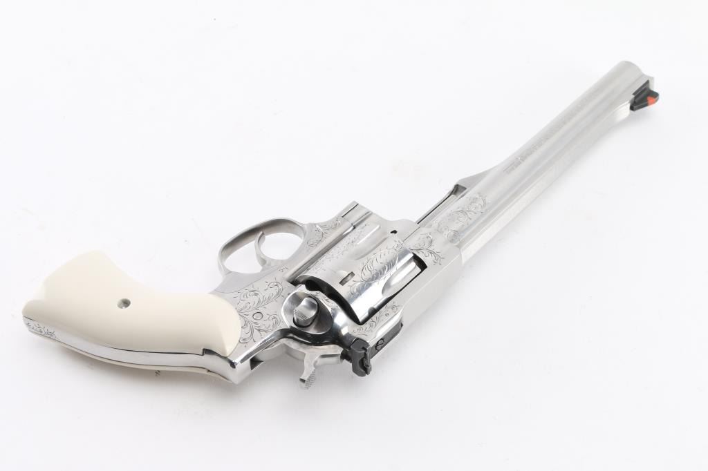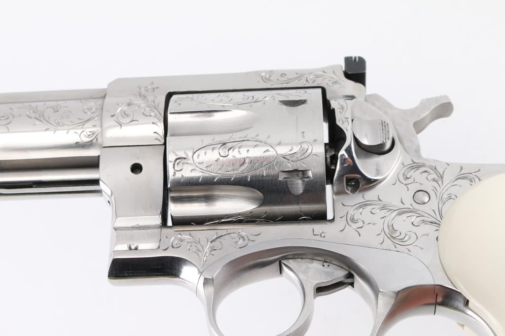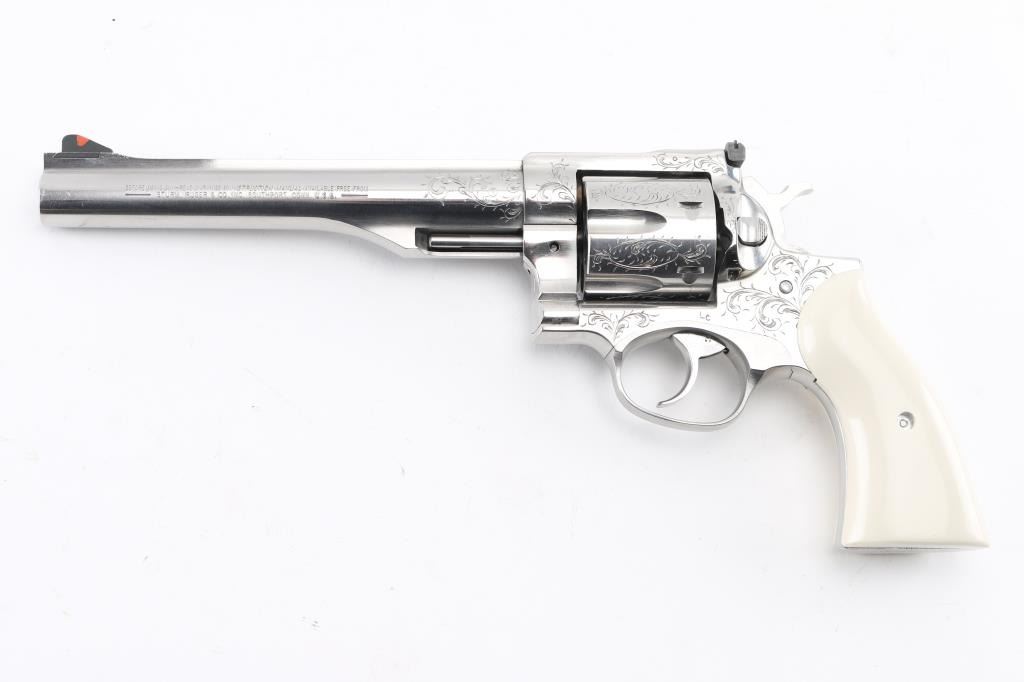 Custom engraved. Large frame double action revolver chambered in .44 Magnum, manufactured circa 1996. Features a stainless steel finish, 7.5" barrel with partially serrated sighting rib, dovetailed serrated ramp front sight with orange insert, adjustable rear sight with white outlined square notch, smooth trigger, knurled hammer spur, transfer bar safety, fluted six-shot cylinder, shrouded ejector rod, faux ivory grips by Arizona custom grips. The revolver has been custom engraved floral, scroll motifs on frame, cylinder, barrel, and back strap. The hammer & trigger have been jeweled. Although unsigned it is a professionally done. Bore is excellent. Retains 99% finish with minor scratches. Grips are excellent. Action is smooth with tight lock-up. A really nice revolver. There is very small initials "LC" on the left frame. Condition is NRA Excellent. Modern Firearm.