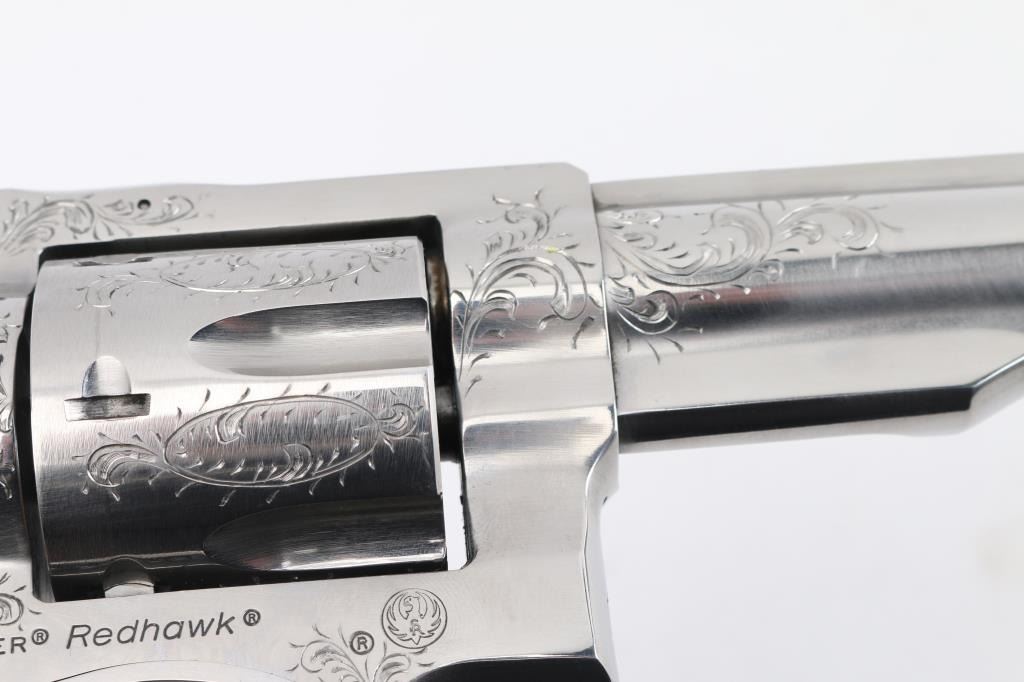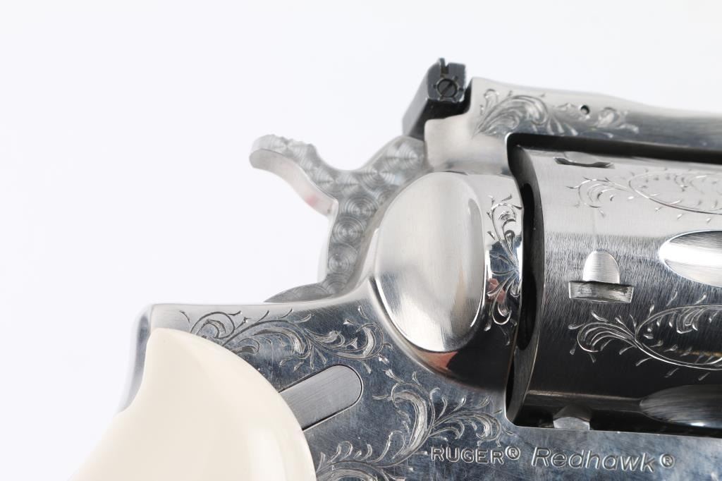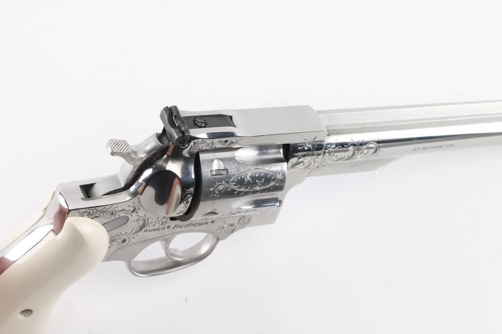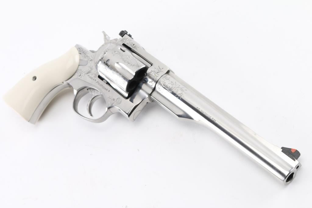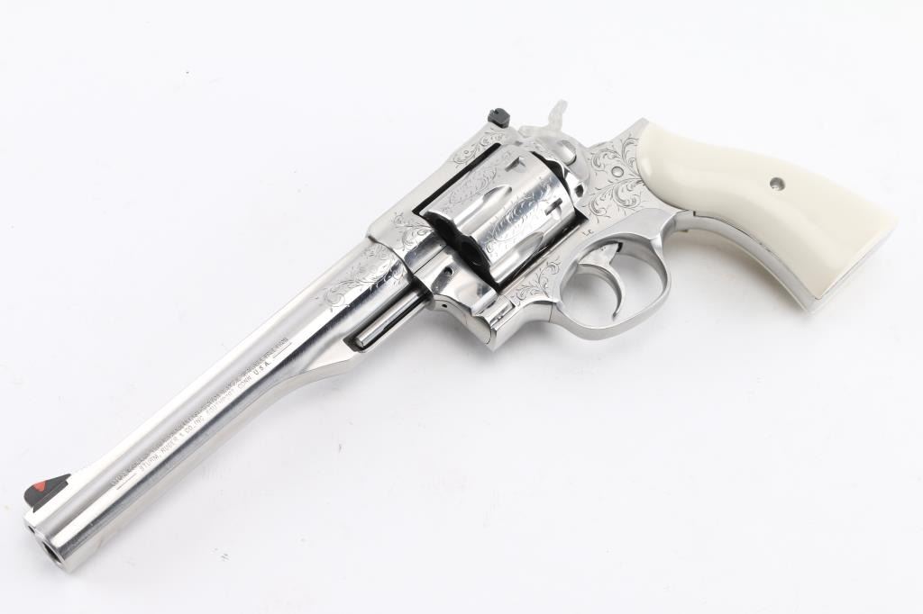 Custom engraved. Large frame double action revolver chambered in .44 Magnum, manufactured circa 1996. Features a stainless steel finish, 7.5" barrel with partially serrated sighting rib, dovetailed serrated ramp front sight with orange insert, adjustable rear sight with white outlined square notch, smooth trigger, knurled hammer spur, transfer bar safety, fluted six-shot cylinder, shrouded ejector rod, faux ivory grips by Arizona custom grips. The revolver has been custom engraved floral, scroll motifs on frame, cylinder, barrel, and back strap. The hammer & trigger have been jeweled. Although unsigned it is a professionally done. Bore is excellent. Retains 99% finish with minor scratches. Grips are excellent. Action is smooth with tight lock-up. A really nice revolver. There is very small initials "LC" on the left frame. Condition is NRA Excellent. Modern Firearm.