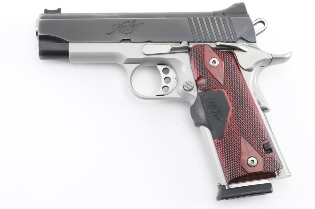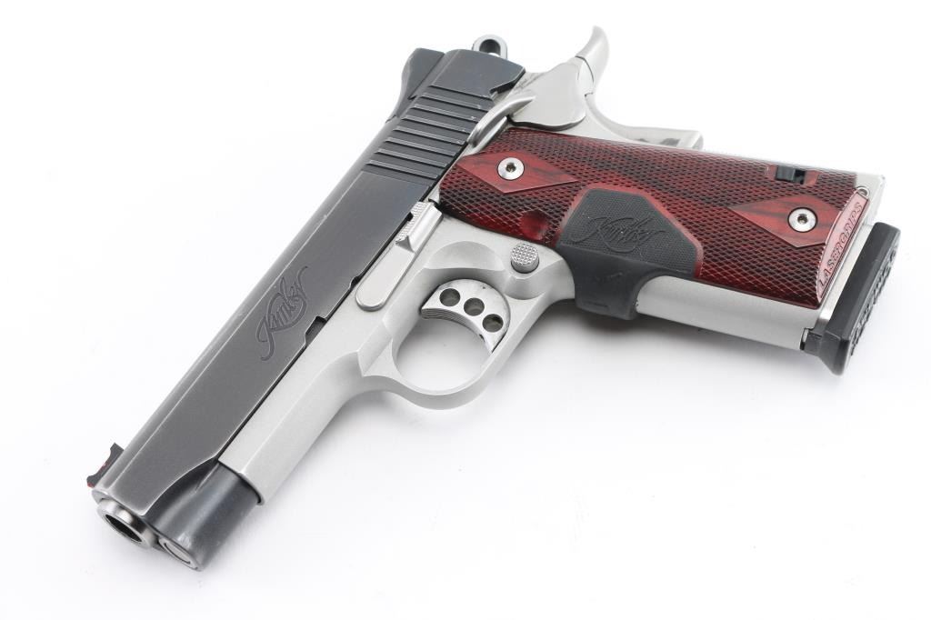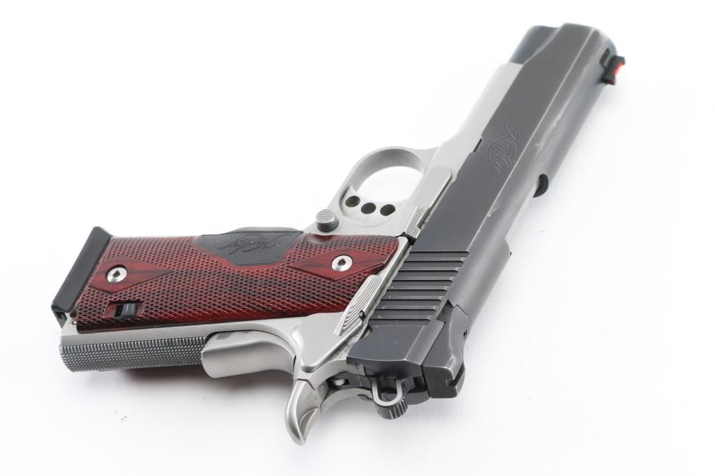 SN: KR99526. Premium quality 1911-A1 style single action semi-automatic compact pistol chambered in .45 ACP. Pro Crimson laser grips. Features a blued carbon steel slide, match grade 4" bushing less stainless steel barrel, full-length steel guide rod, dovetailed red fiber optic front, notch rear sights, serrated adjustable trigger, skeletonized hammer, thumb safety, beavertail grip safety, satin silver finished aluminum frame, push button magazine release, Wilson Combat 8 round magazine, and partially checkered rosewood grips. Includes the original factory hard case with documents. Pistol exhibits minor edge/muzzle wear. Action is smooth, bore is pristine and grips are fine. Laser is working. NRA Condition-Very Good. Modern Firearm.