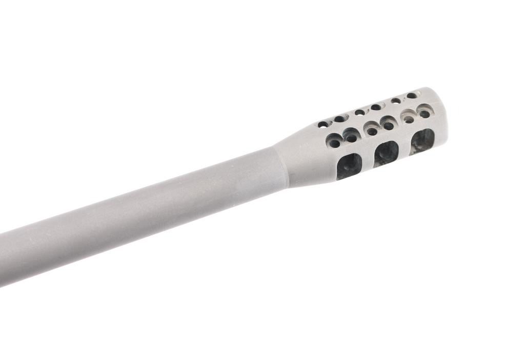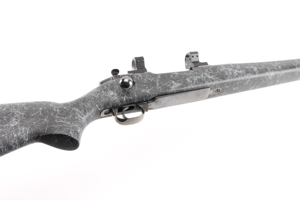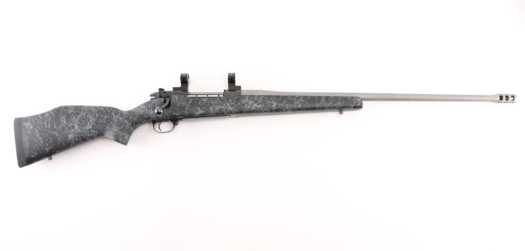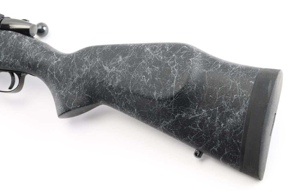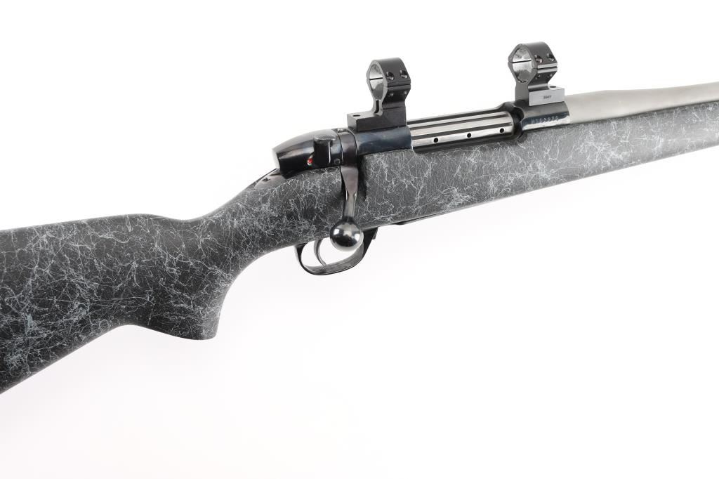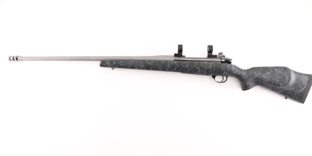 High quality Japanese made bolt action sporting rifle chambered in .270 Weatherby, manufactured circa 1972-94. Features a 26" matte finished stainless steel Shilen barrel with three port muzzle brake & no provision for sights, blue receiver with "trued action", installed Talley 1" scope rings/bases, 9-lug fluted bolt with swept back handle, adjustable Timney serrated trigger, internal box magazine with hinge floorplate, two-position safety & cocked indicator at the rear of the bolt, and Bell & Carlson Monte Carlo black fiberglass stock with grey spiderweb texture, swivel studs, Decelerator recoil pad. Metal finish is near excellent with some minor scratches to the floorplate with no observed losses to the rest of the finish. Action is very smooth, the bore is excellent and the stock is fine. Condition is NRA Excellent. Modern Firearm.