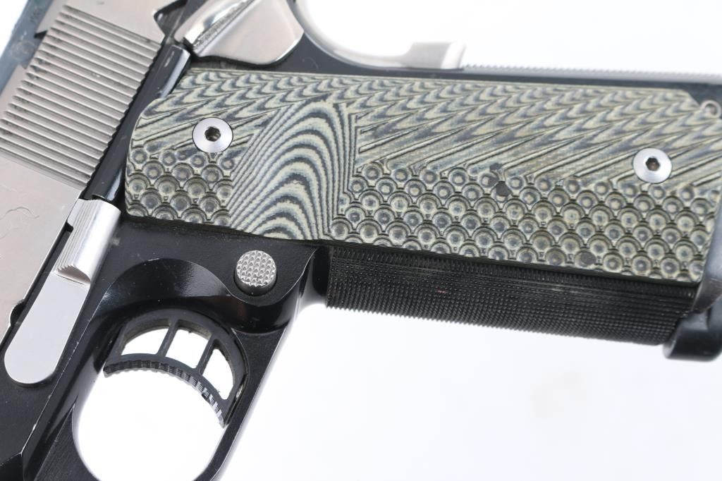 Custom semiautomatic pistol built on a Caspian frame, using Colt slide and other parts, chambered for 45 Auto. Frame is blued, slide is bare metal, controls are stainless. Features 4.25" Colt marked barrel, full length recoil spring guide, manual thumb safety, upswept beavertail grip safety with "memory groove" bump, flat checkered mainspring housing, checkered front strap, skeletonized trigger & hammer, fiber optic insert front sight in dovetail, Bo-Mar adjustable rear sight, flared magazine well funnel, green & black laminated G10 grips. Bore is excellent condition. Frame shows losses from use, retains 85% finish. Bare metal parts are very good condition. Includes three magazines (one each Kimber, Ed Brown, McCormick), extra grip sets (one set is checkered wood, other is black polymer with Colt medallions). Condition is NRA Very Good++ as customized *** Modern Firearm ***