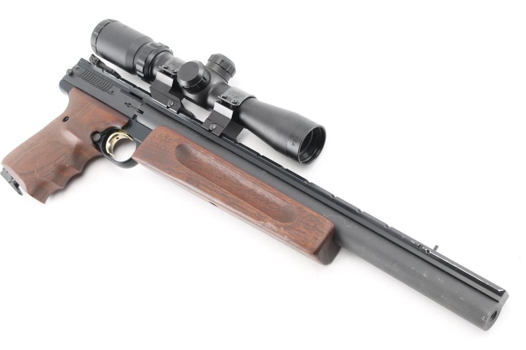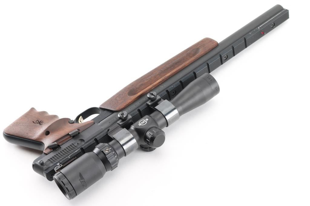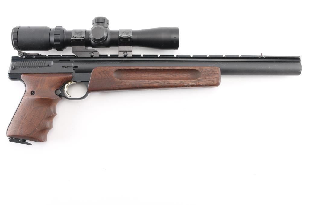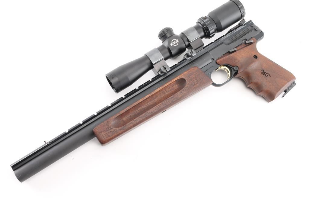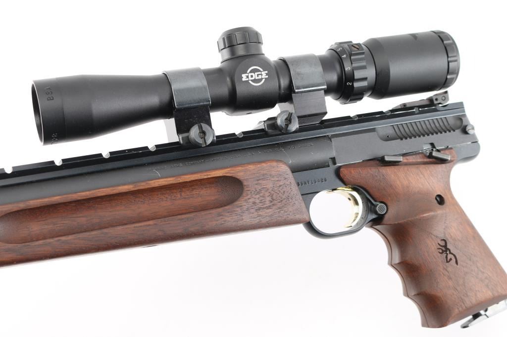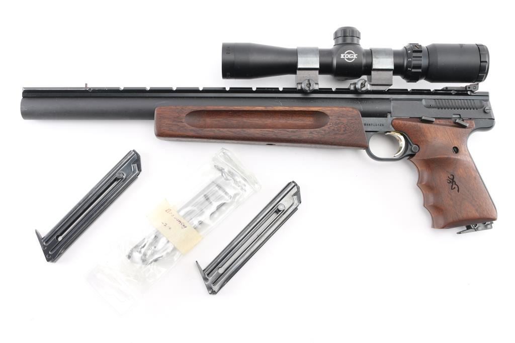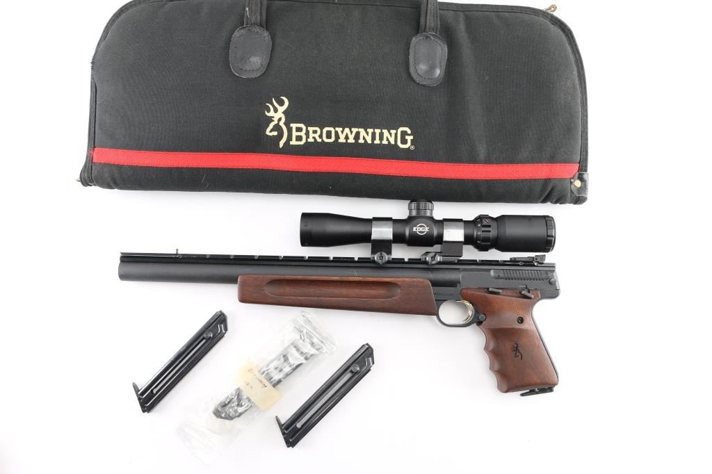 'Unlimited Silhouette' American made blowback-operated single action semi-automatic target pistol chambered in .22 Long Rifle, manufactured circa 1992. Features a matte blued 14" bull barrel with recessed crown, full-length Weaver style optics rail, post front sight with pink painted accent, fully adjustable rear sight with a narrow square notch, BSA Edge 2-7x28 scope mounted with Weaver rings, partially serrated gold trigger, manual safety on the left side of the frame, push button magazine release, factory 10 round magazine, black anodized alloy frame, walnut forend with grasping grooves and two-piece wrap-around finger groove grips with laser engraved Browning insignia on the left panel. Includes a factory zippered soft case manual, rear & front sight hoods, three spare Browing magazines and number of small spare parts. Pistol retains approximately 97% of its original finish showing scattered scuffs and high point edge wear on the optic rail. Action is smooth, the bore is pristine and the wood stocks are excellent. Condition is NRA Excellent. Modern Firearm.
