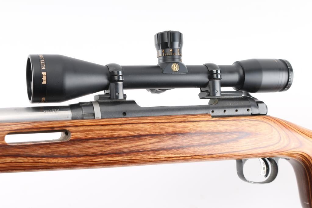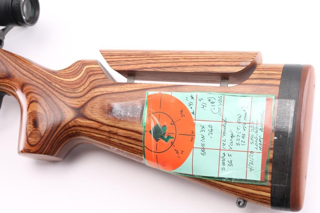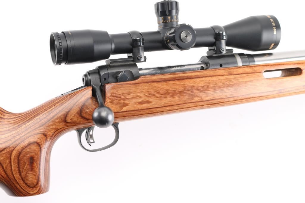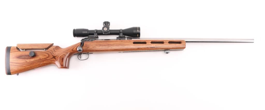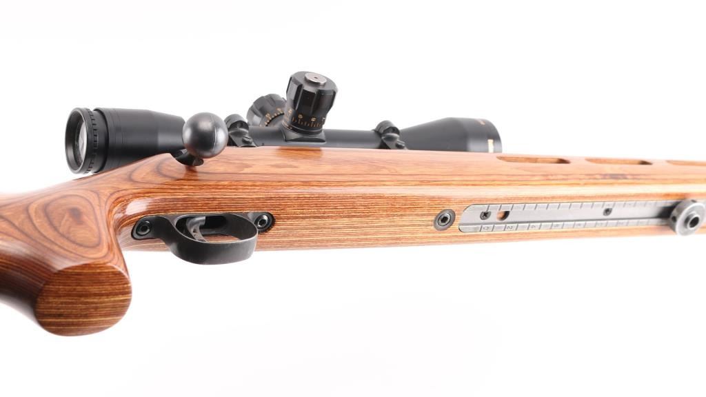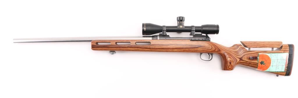 Customized long action bolt action target rifle features Hart 24.25" heavy barrel with target crown, blued action with blind magazine, Accu-trigger, manual safety. Smooth laminated wood stock with ventilated beavertail forend, semi pistol grip, adjustable comb, solid rubber butt pad, rear sling stud, hand stop track under forend. Mounts a Bushnell Elite 3200 10x40mm scope with mil dot type reticle. Bore is pristine. Rifle is in excellent condition with handling marks. Stock is like new. Scope is excellent condition. Test target and load data affixed to butt. Condition is NRA Excellent - Custom Rifle *** Modern Firearm ***