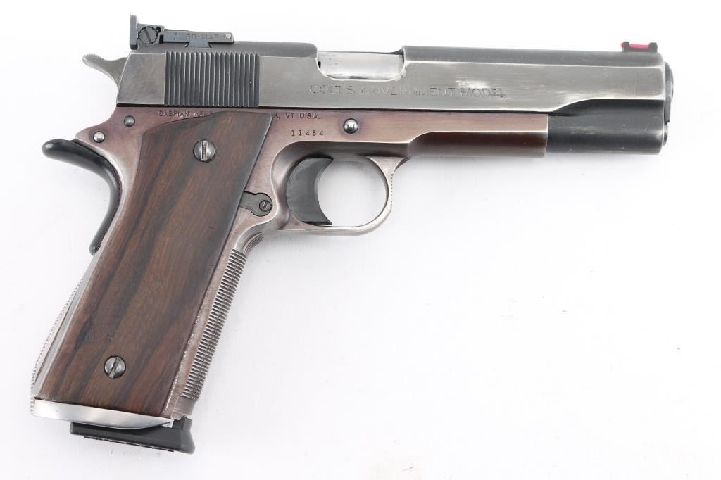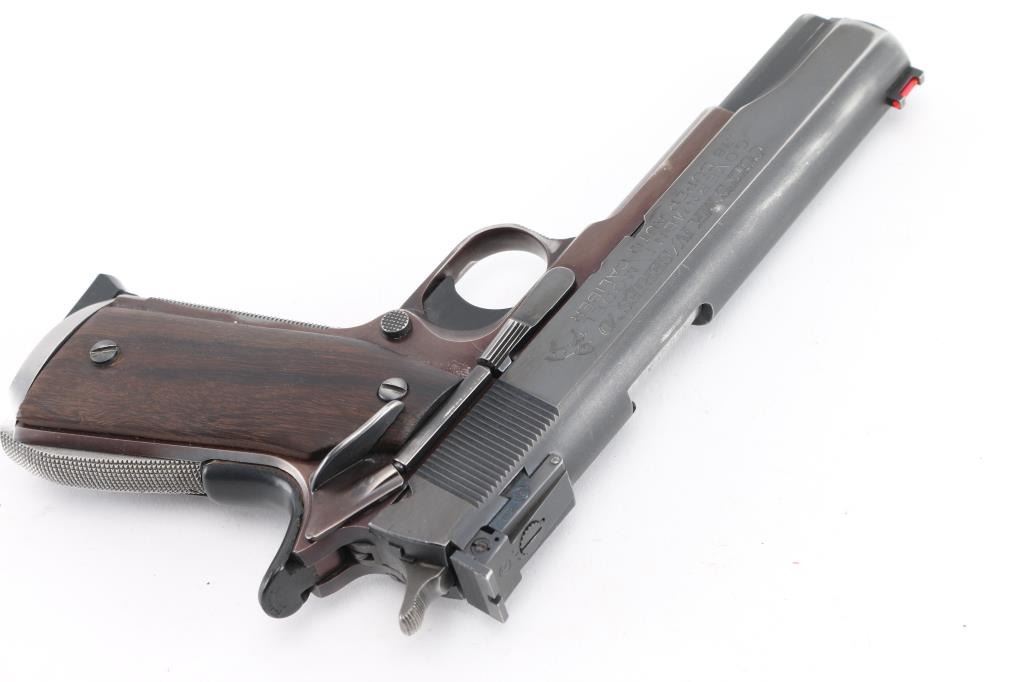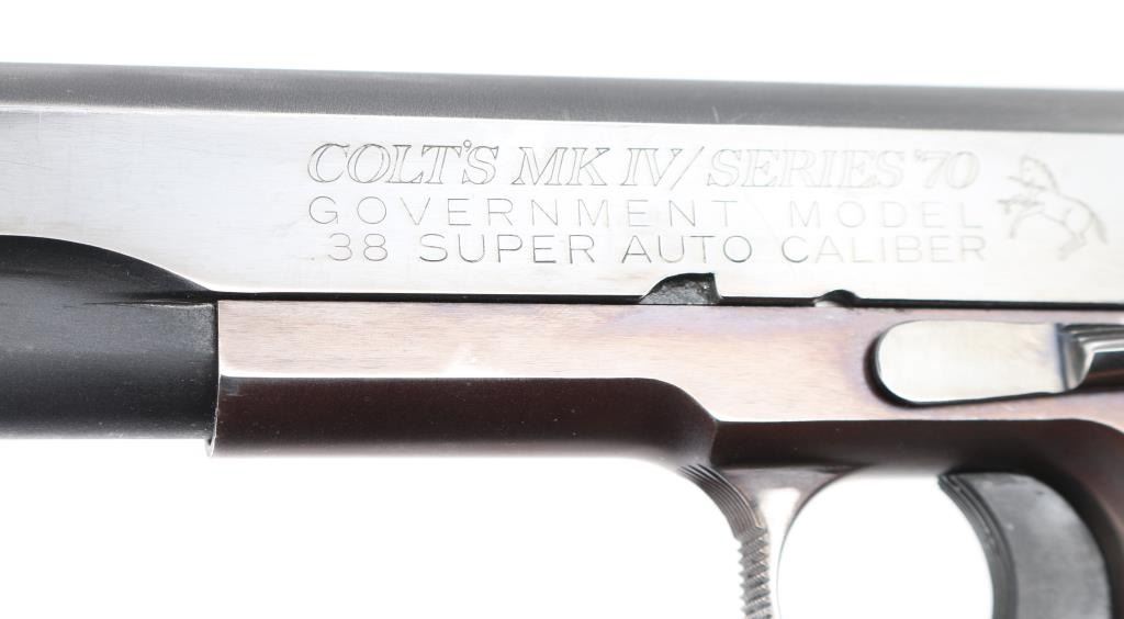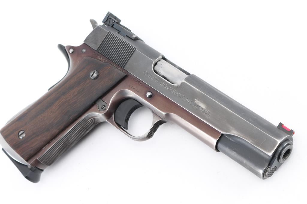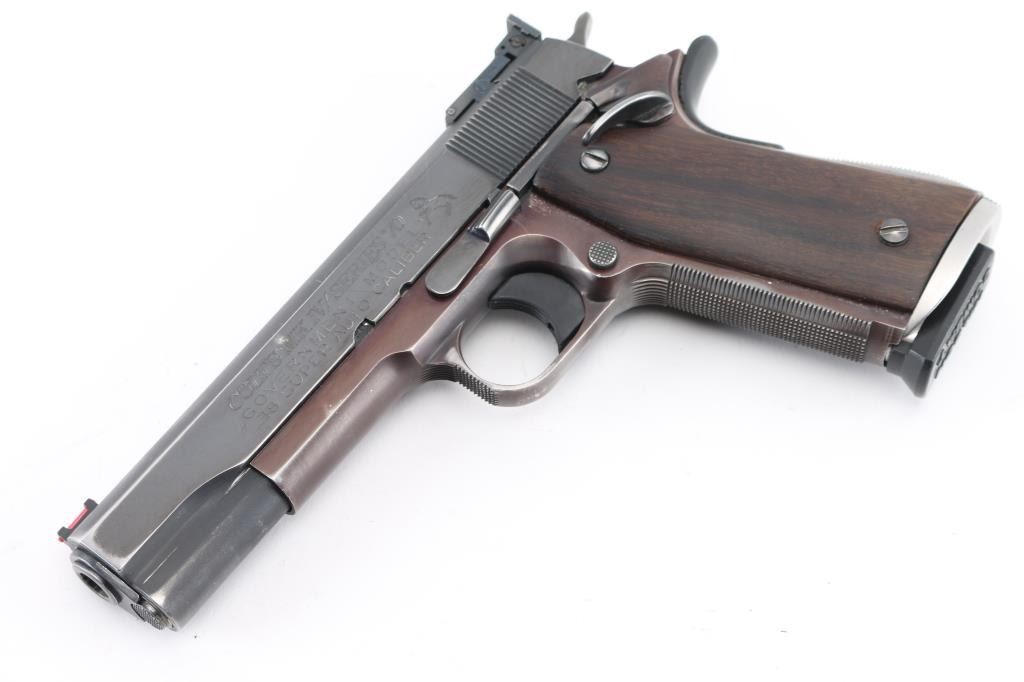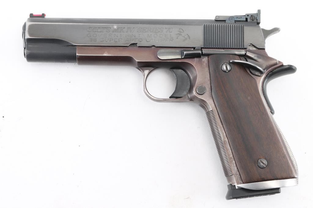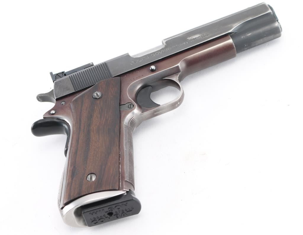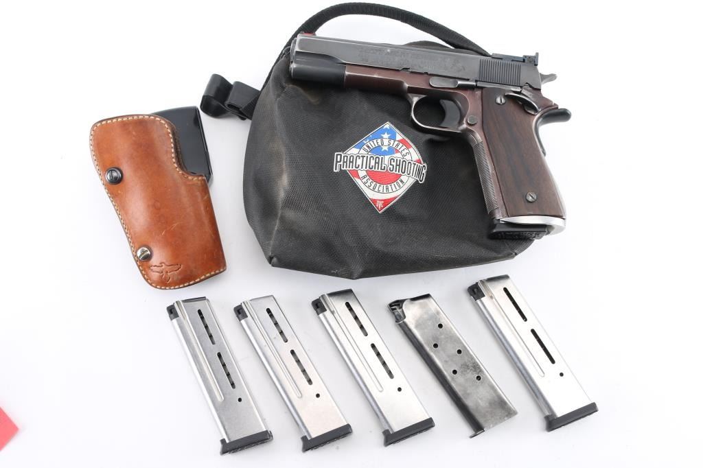 Semi-Automatic 9mm pistol. 10-rd magazine. Blued Colt Mk IV/Series 70 Government model slide, also marked "38 Super Auto caliber" 5" barrel with red optic/Bo-Mar adjustable square-notch rear sights. Mounted on a Caspian Arms plum colored frame with serrated trigger with adjustable stop. knurled, arched mainspring housing, knurled fore strap, blue beavertail grip safety, blue extended thumb safety. Bore appears excellent/bright. Grips are excellent. Blued slide finish is about 80%, with edge wear, minor scratches/rubs. Frame has edge wear/scratches, and finish/handling loss on the straps, Comes with Wilson Combat magazine with finger extension. Comes with black nylon range bag. Magazine loader, 4 Wilson combat magazine one coveted 45 ACP mag to 9mm, & a brown leather/black plastic Galco holster stamped with the Gunsite raven. NRA Condition-Good. Modern firearm