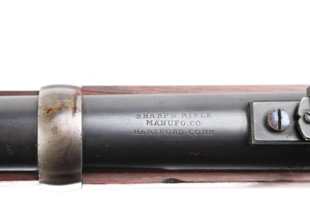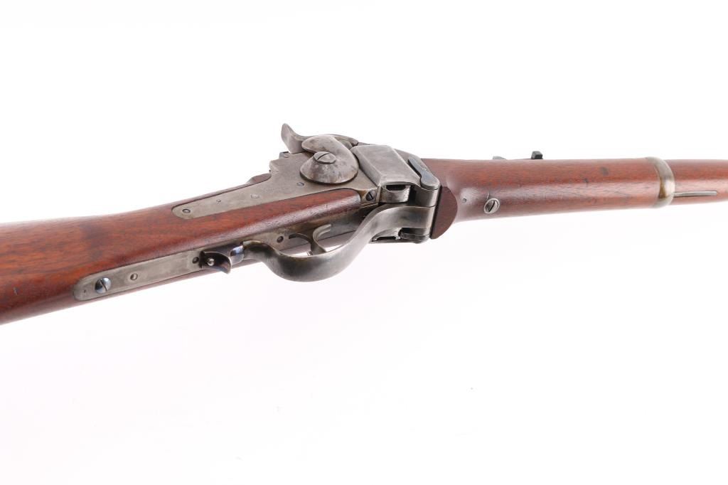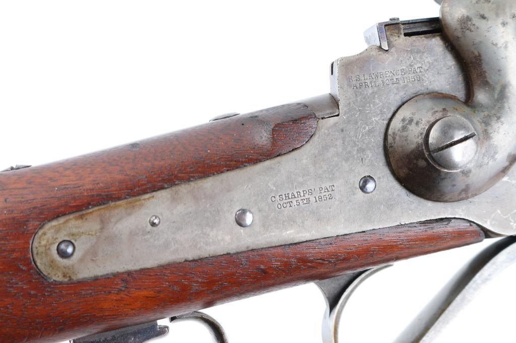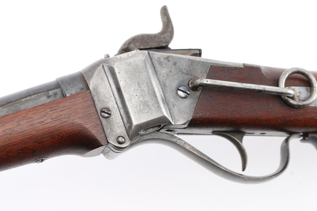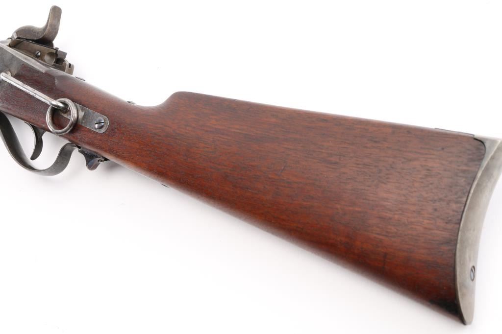 US Sharps New Model 1865 Cartridge Conversion Saddle Ring Carbine (SRC). 50-70, 22" barrel with an excellent, bright bore. Lever lock This was an original Civil War carbine, converted to metallic cartridge by the US government after the war had ended. (1867-68) The carbine has a blued barrel, the markings are a little shallow, front blade, R.S. Lawrence marked rear ladder sights, lower left barrel stamped "RSL", & "L.W."the receiver has a mottled gray patina with traces of case colors. The breech-block was fitted with the early, spring-loaded firing pin, and the original bore was left intact, unlike later conversions that had three-groove liners installed. The walnut forend and buttstock are very good/sound with minor blemishes scattered about the reapplied military oil finish. The buttstock itself was replaced during the conversion, does not have the original patch box, no cartouche, steel buttplate has some traces of case color.. The sling ring is present, the action locks up tightly, and is fully functional. Lawrence, & Sharps marking are crisp/clear on the right plate, the patent dates on the left plate are faint. This is a good the most desirable version of the post-war Sharps conversion. Antique Firearm