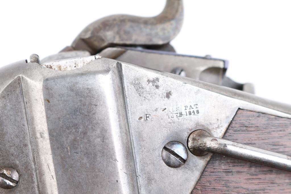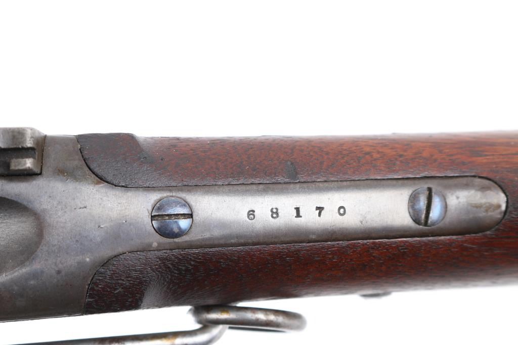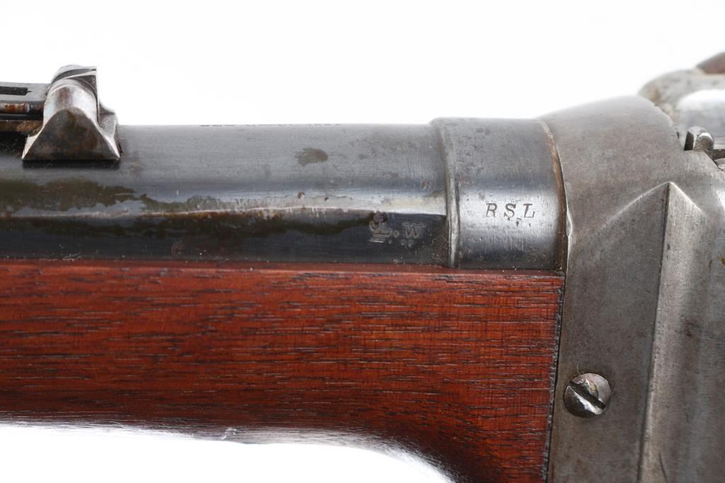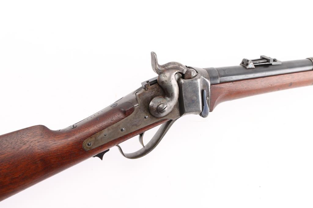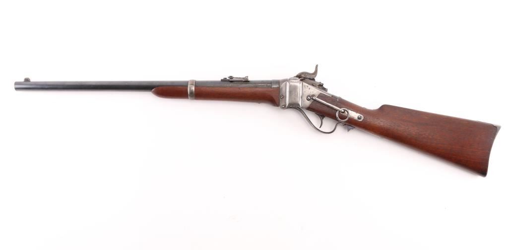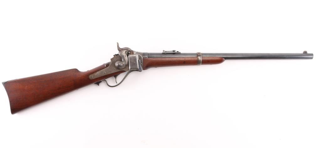 US Sharps New Model 1865 Cartridge Conversion Saddle Ring Carbine (SRC). 50-70, 22" barrel with an excellent, bright bore. Lever lock This was an original Civil War carbine, converted to metallic cartridge by the US government after the war had ended. (1867-68) The carbine has a blued barrel, the markings are a little shallow, front blade, R.S. Lawrence marked rear ladder sights, lower left barrel stamped "RSL", & "L.W."the receiver has a mottled gray patina with traces of case colors. The breech-block was fitted with the early, spring-loaded firing pin, and the original bore was left intact, unlike later conversions that had three-groove liners installed. The walnut forend and buttstock are very good/sound with minor blemishes scattered about the reapplied military oil finish. The buttstock itself was replaced during the conversion, does not have the original patch box, no cartouche, steel buttplate has some traces of case color.. The sling ring is present, the action locks up tightly, and is fully functional. Lawrence, & Sharps marking are crisp/clear on the right plate, the patent dates on the left plate are faint. This is a good the most desirable version of the post-war Sharps conversion. Antique Firearm